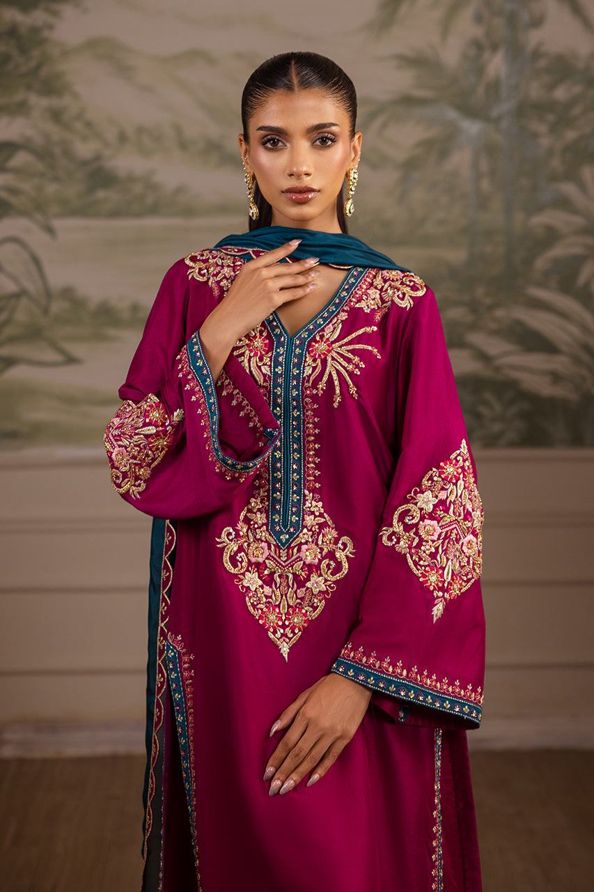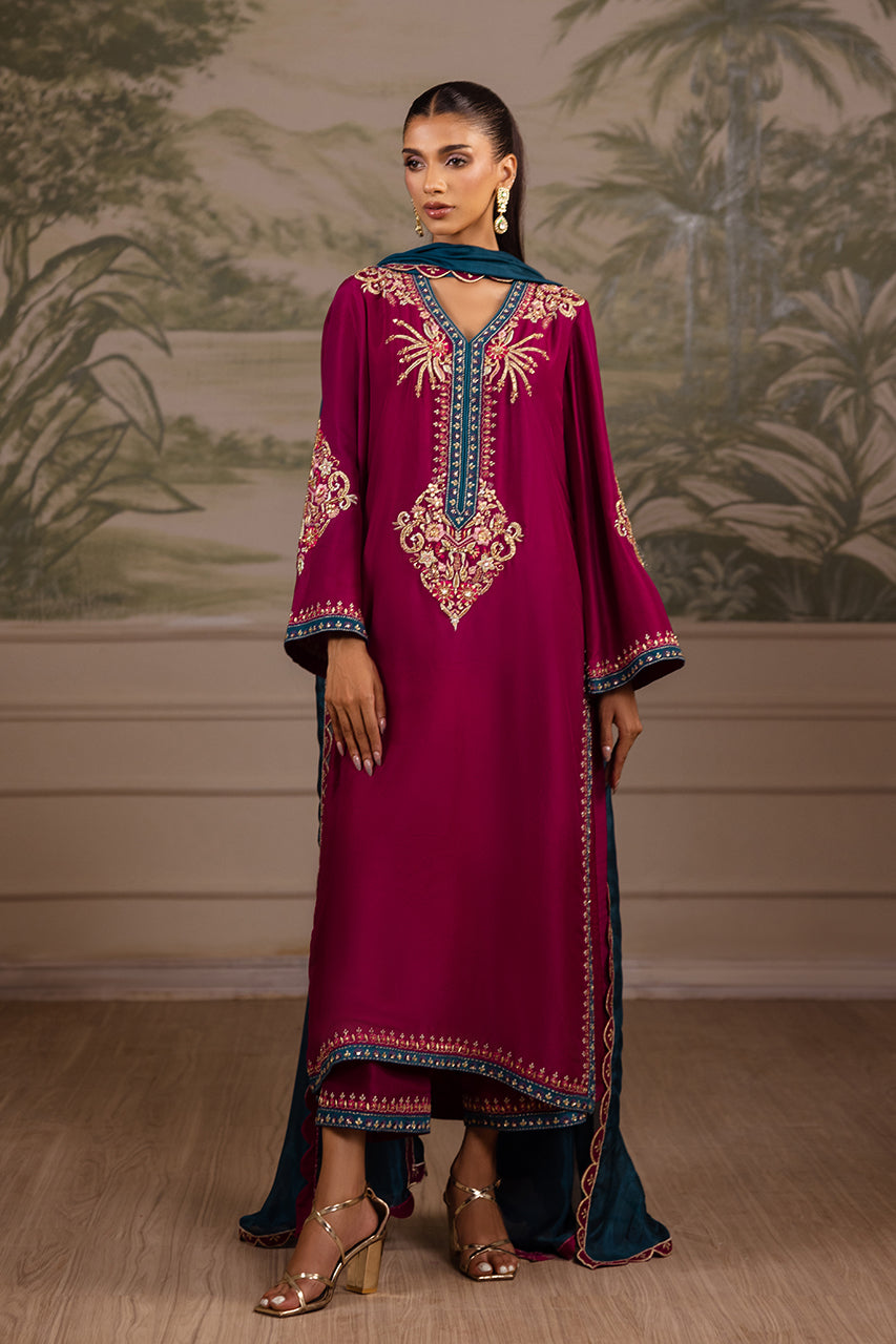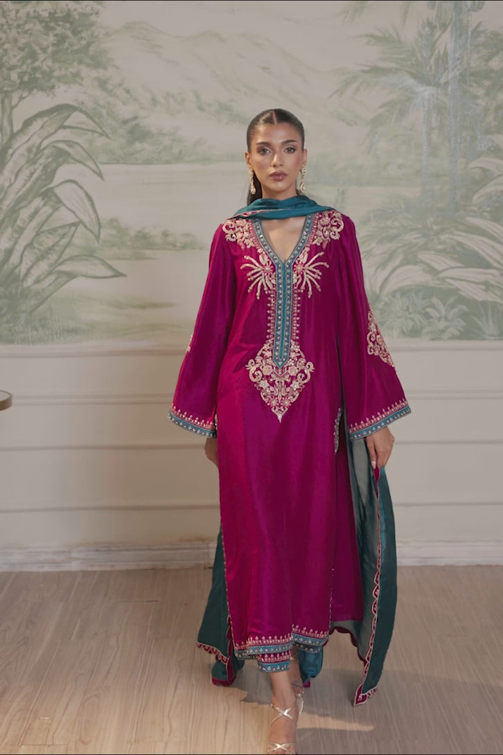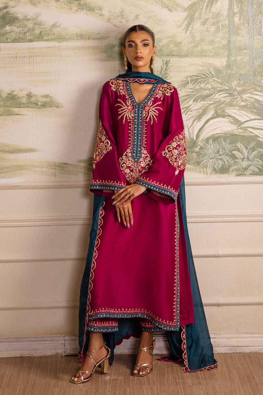 Make a bold statement with this red Raw Silk long shirt with heavy hand embellished neckline and sleeves. The complimenting red Raw Silk izaar also boasts hand work around the border. Finish the look with a contrasting teal blue Silk duppatta with scallop finishing, exuding effortless glamour!