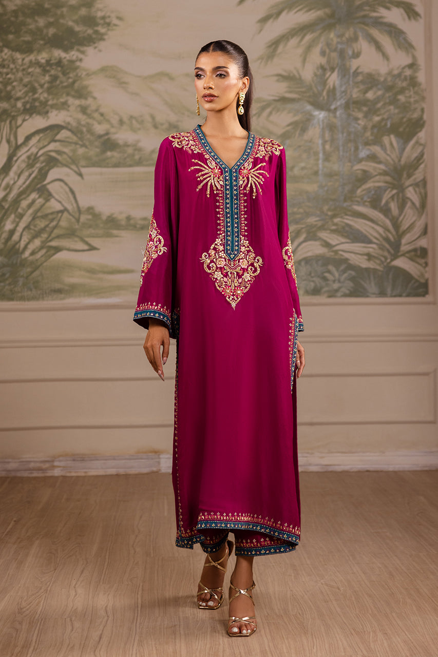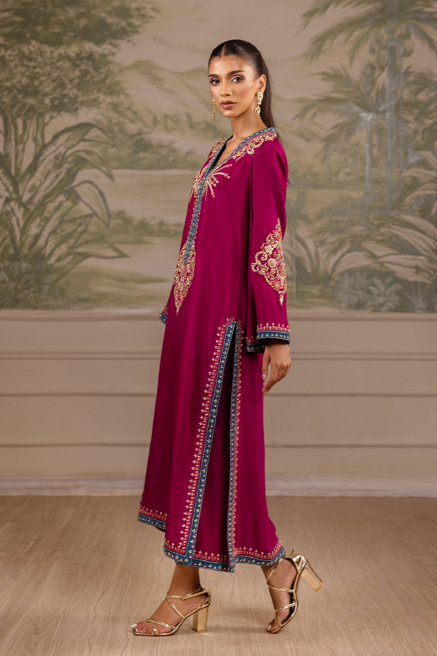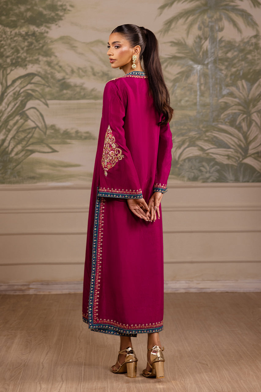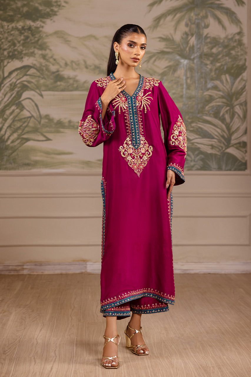 Make a bold statement with this red Raw Silk long shirt with heavy hand embellished neckline and sleeves. The complimenting red Raw Silk...