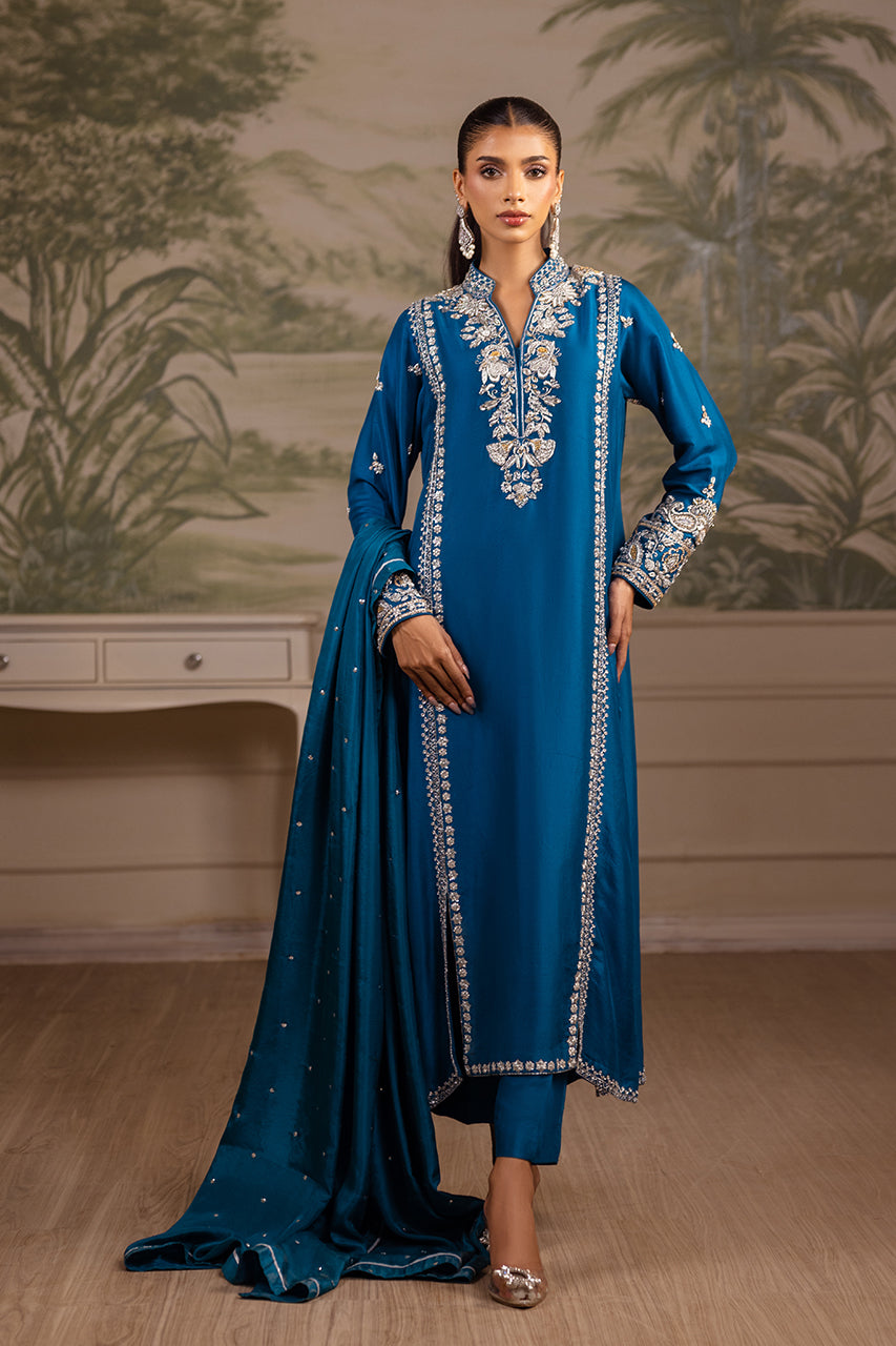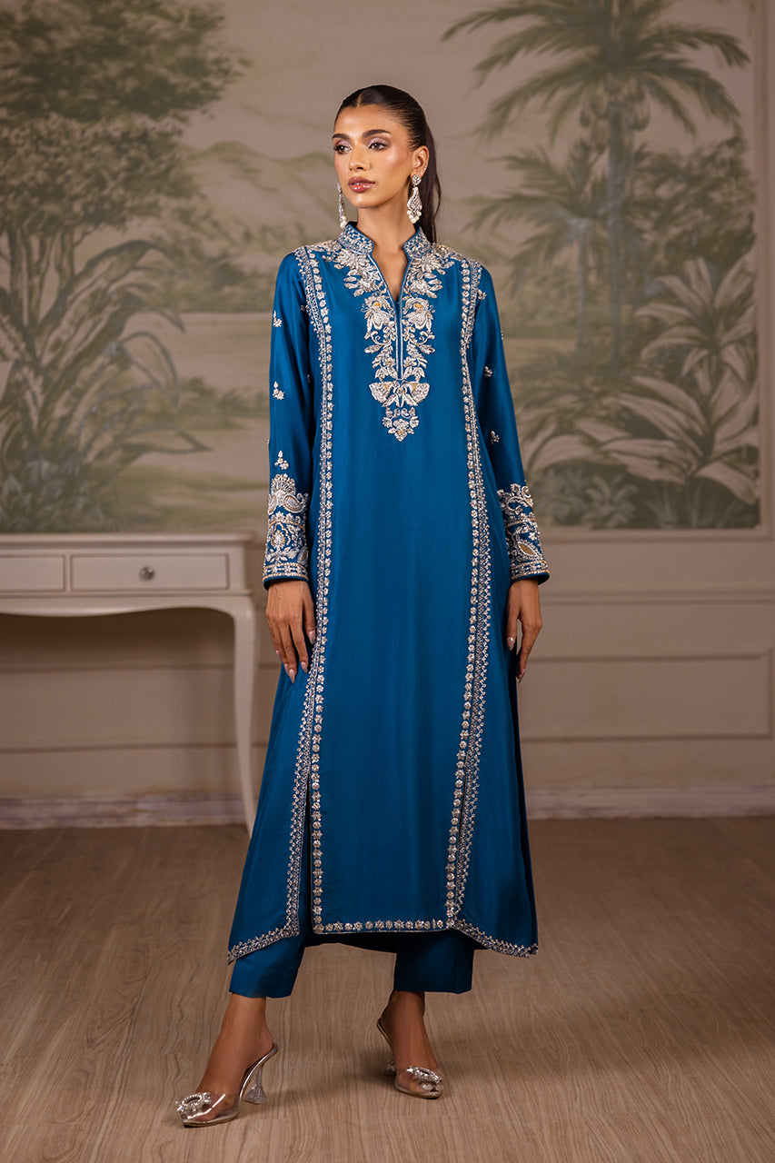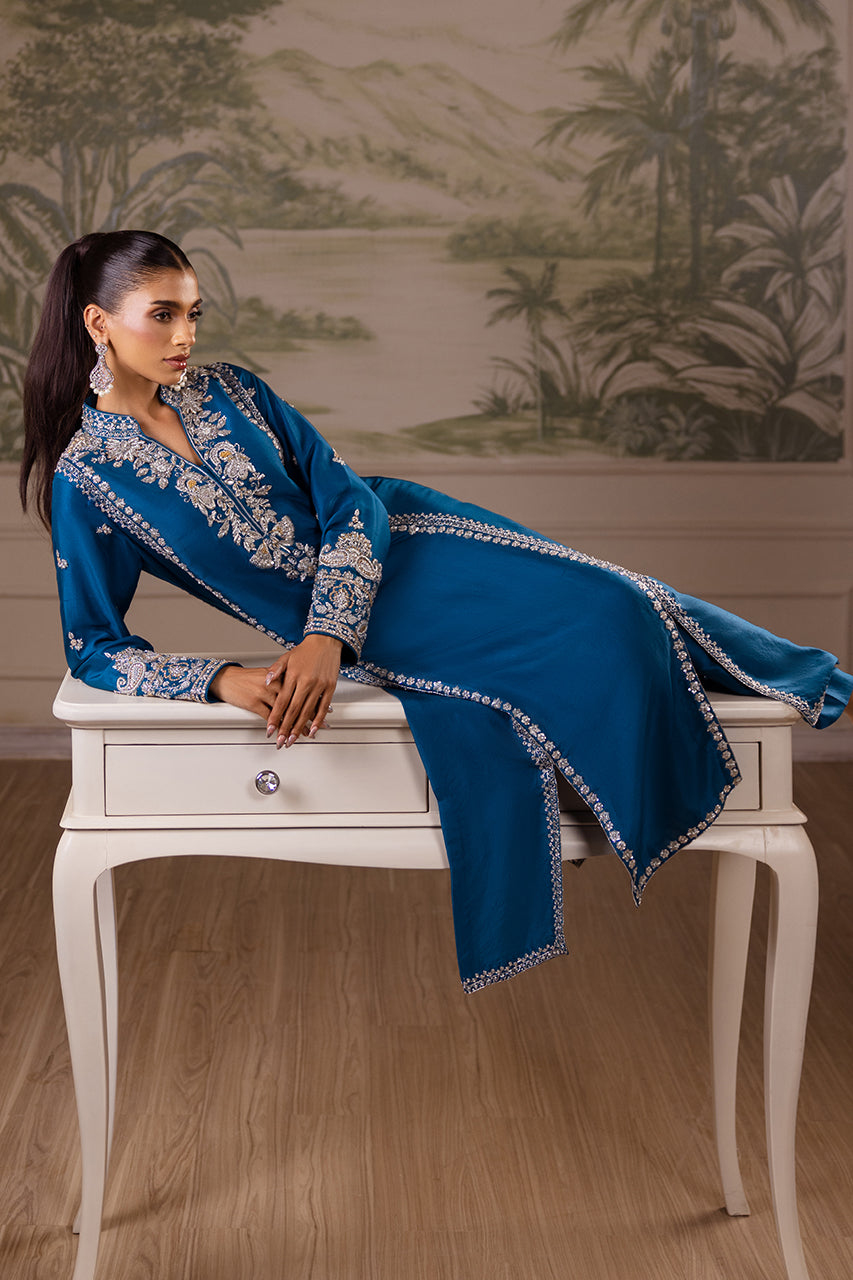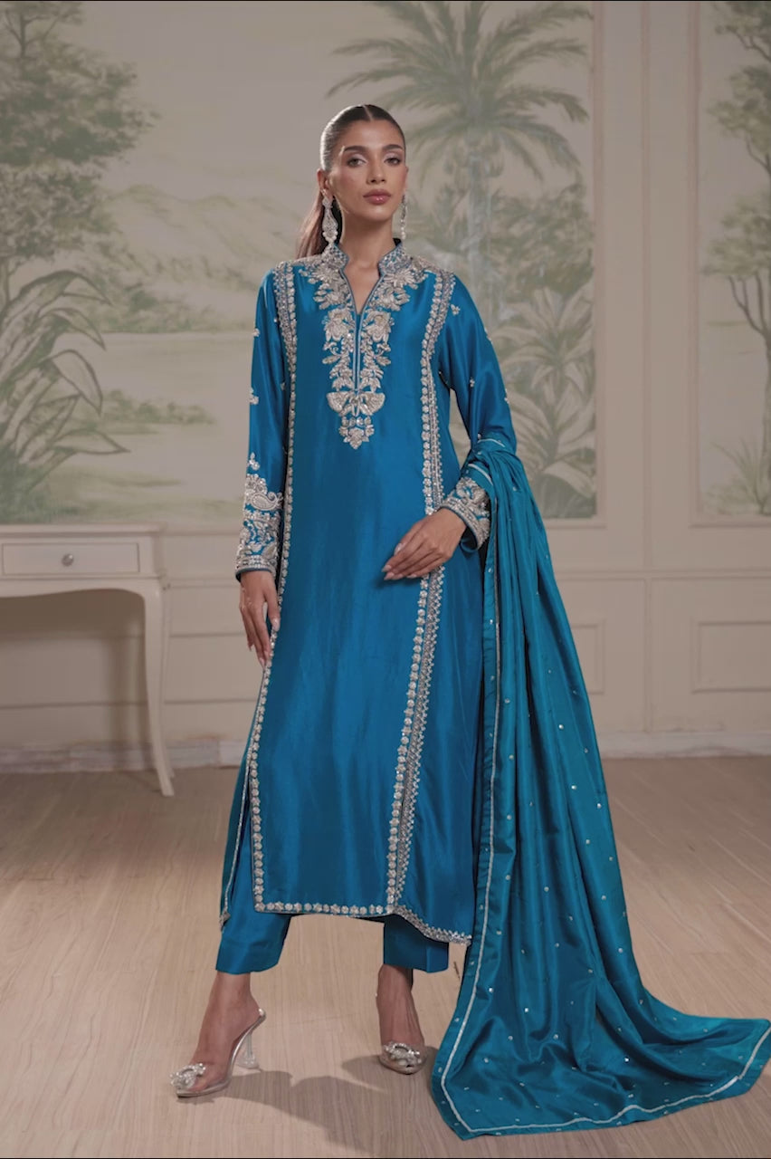 Embrace celestial elegance with this cobalt blue Raw Silk long shirt with exquisite silver hand work on neckline and sleeves, along with booties all over. Paired it with matching Raw Silk pants and a Silk dupatta, with delicate hand worked border and booties all over, to complete this dreamy ensemble.