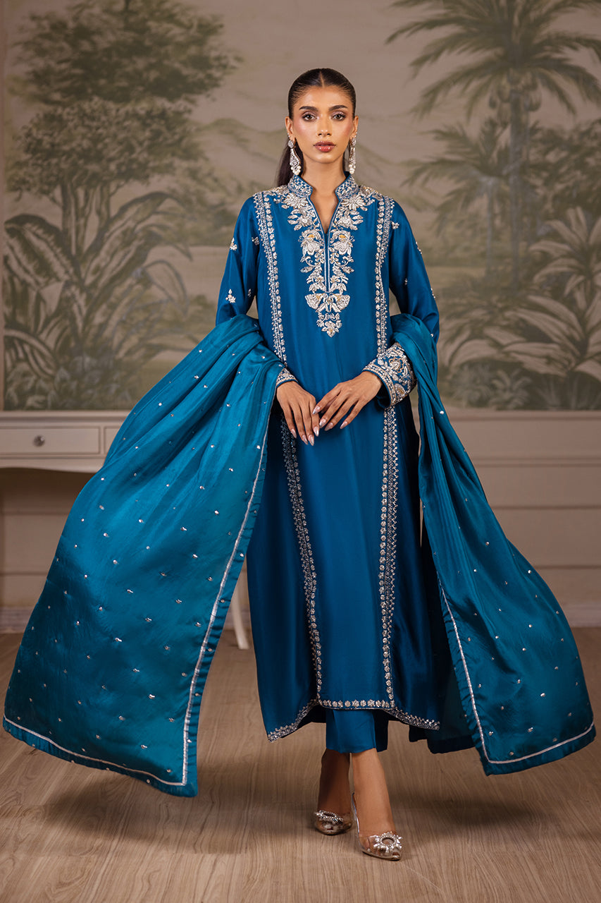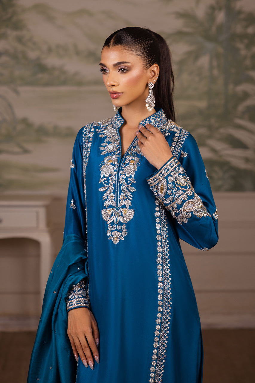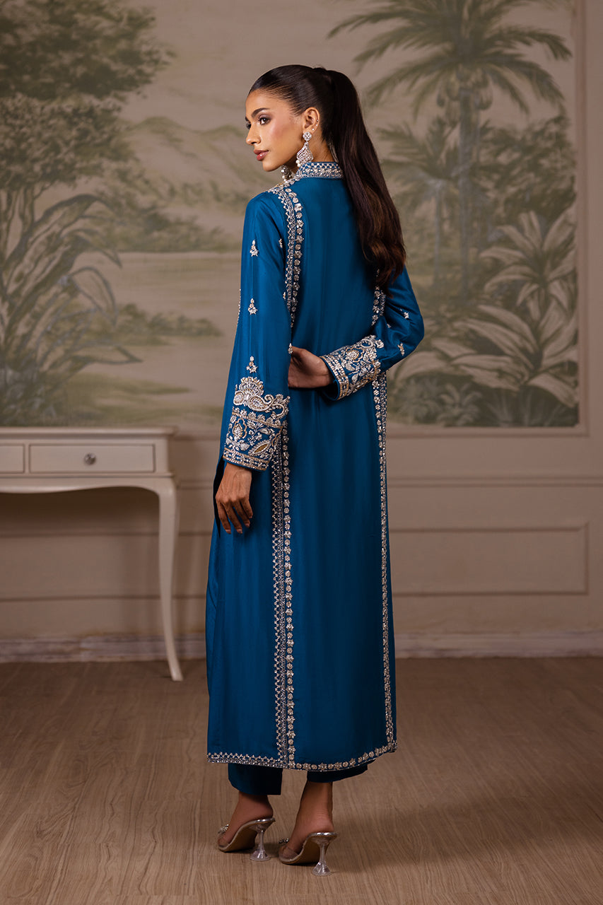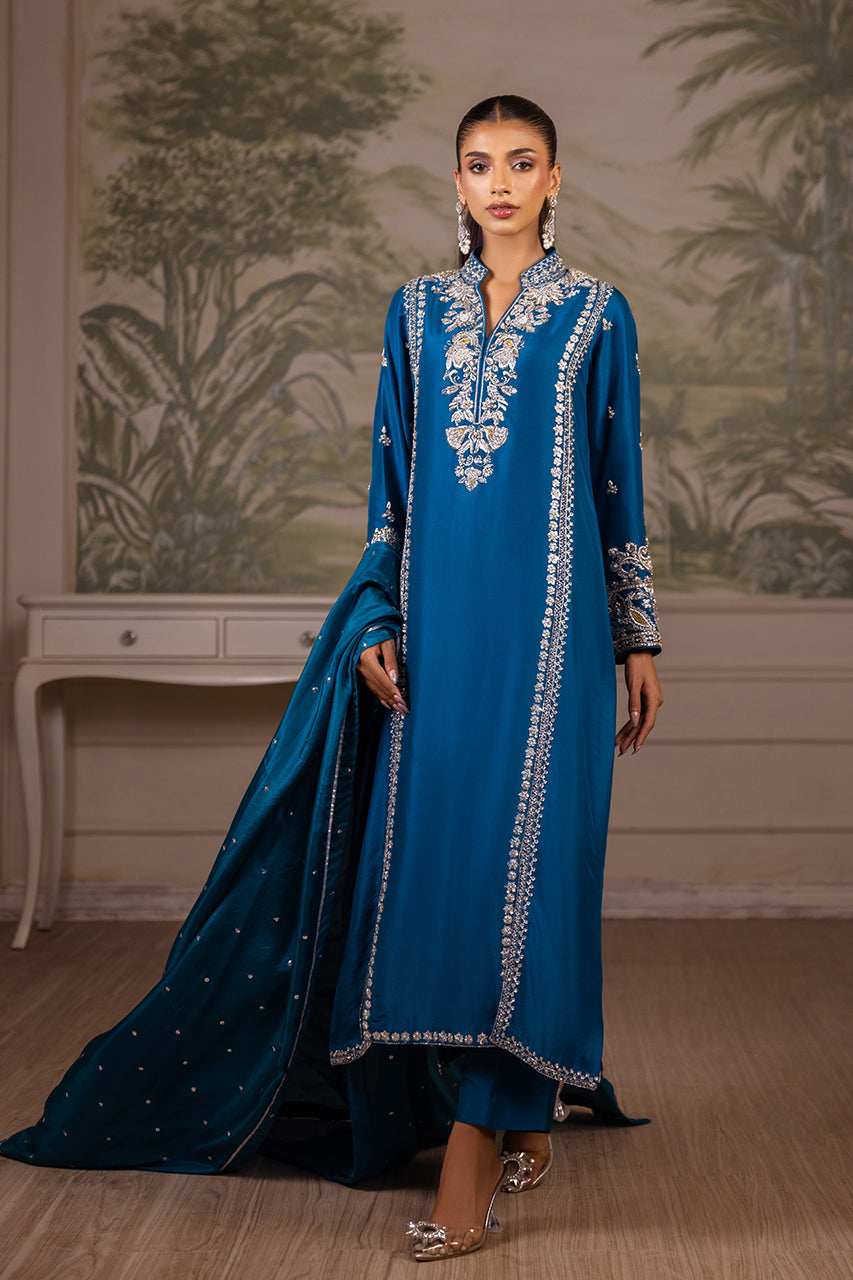 Embrace celestial elegance with this cobalt blue Raw Silk long shirt with exquisite silver hand work on neckline and sleeves, along with booties all over. Paired it with matching Raw Silk pants and a Silk dupatta, with delicate hand worked border and booties all over, to complete this dreamy ensemble.