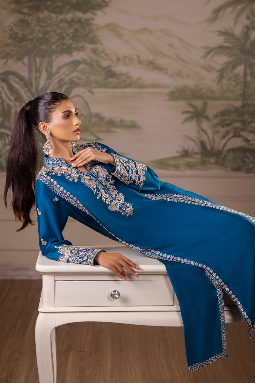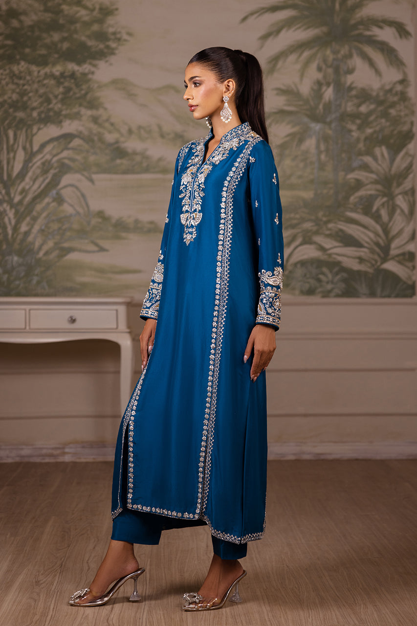 Embrace celestial elegance with this cobalt blue Raw Silk long shirt with exquisite silver hand work on neckline and sleeves, along with booties...