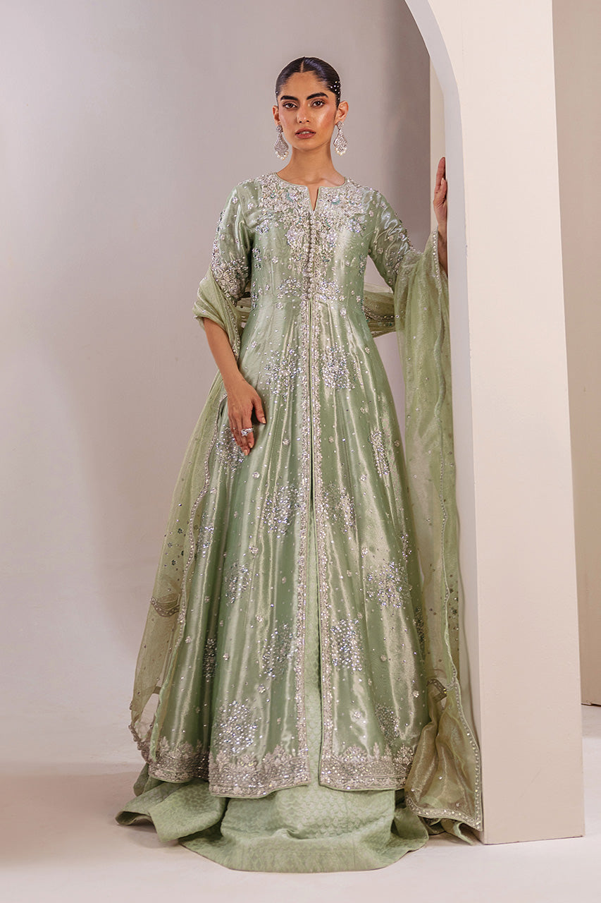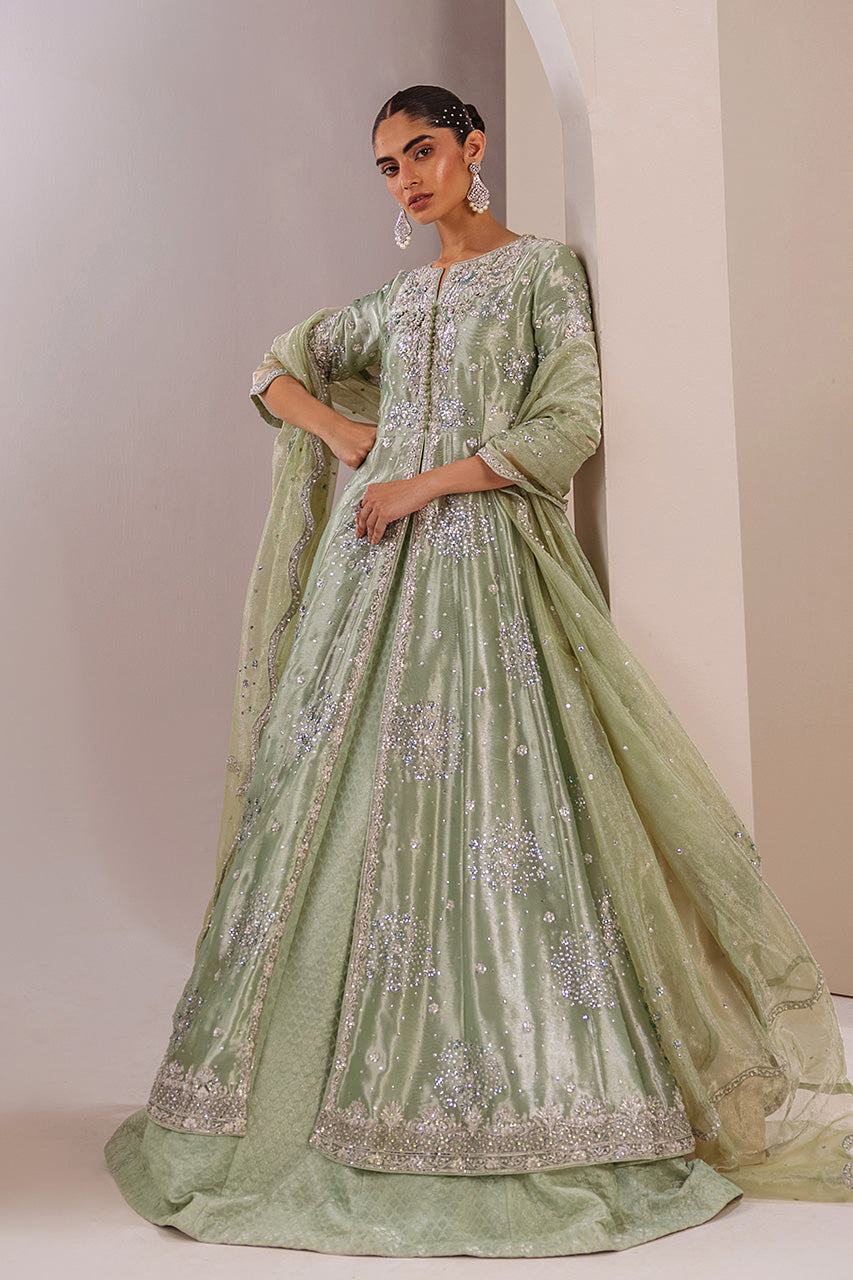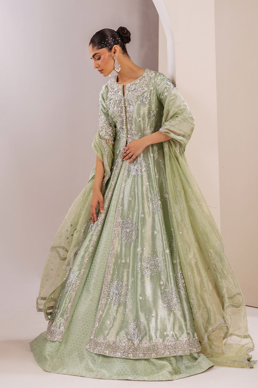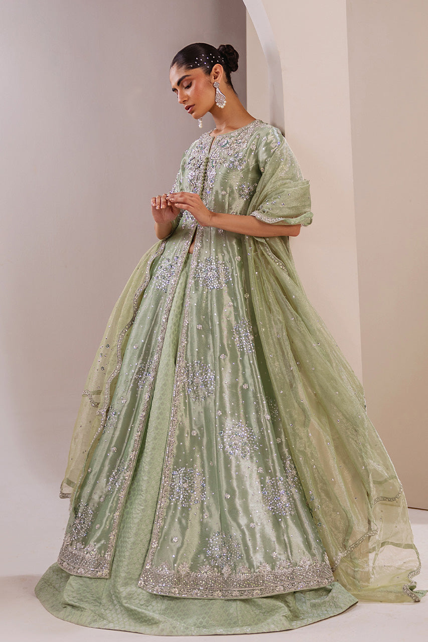 Witness splendor with this beautiful Lama front-open gown adorned with intricate floral and geometric silver hand worked details all over the front and back of gown. It is paired with a complimenting green jamawar lehnga and a green masuri net dupatta with chan and hand worked borders on all four sides.