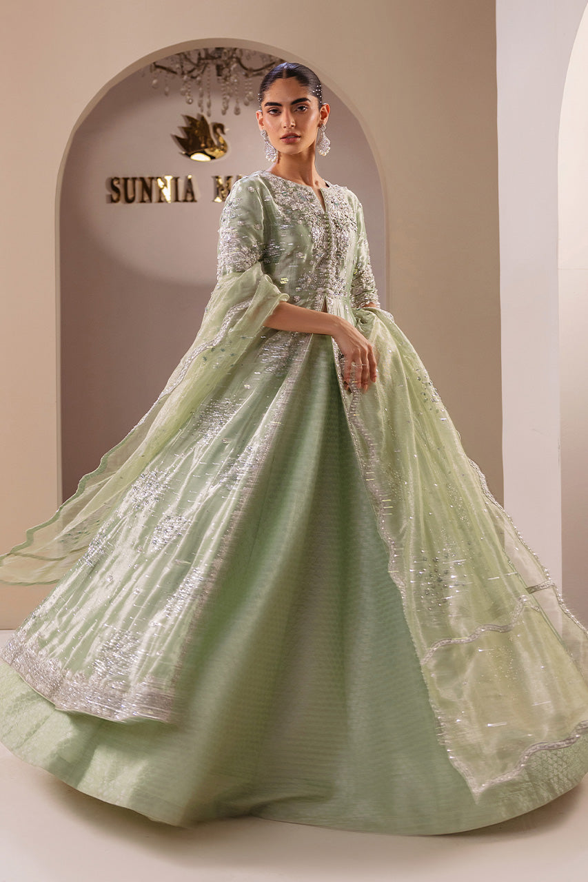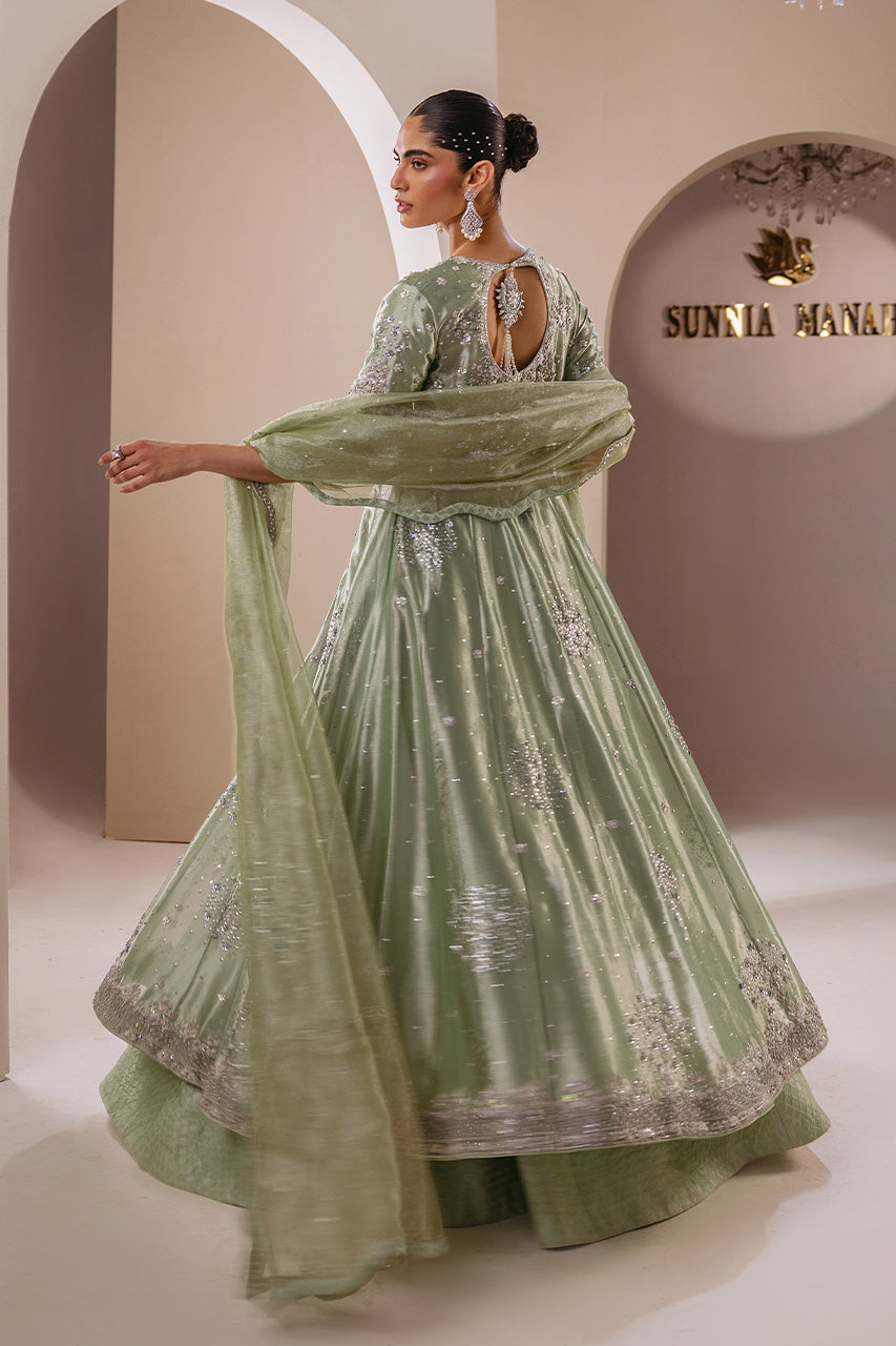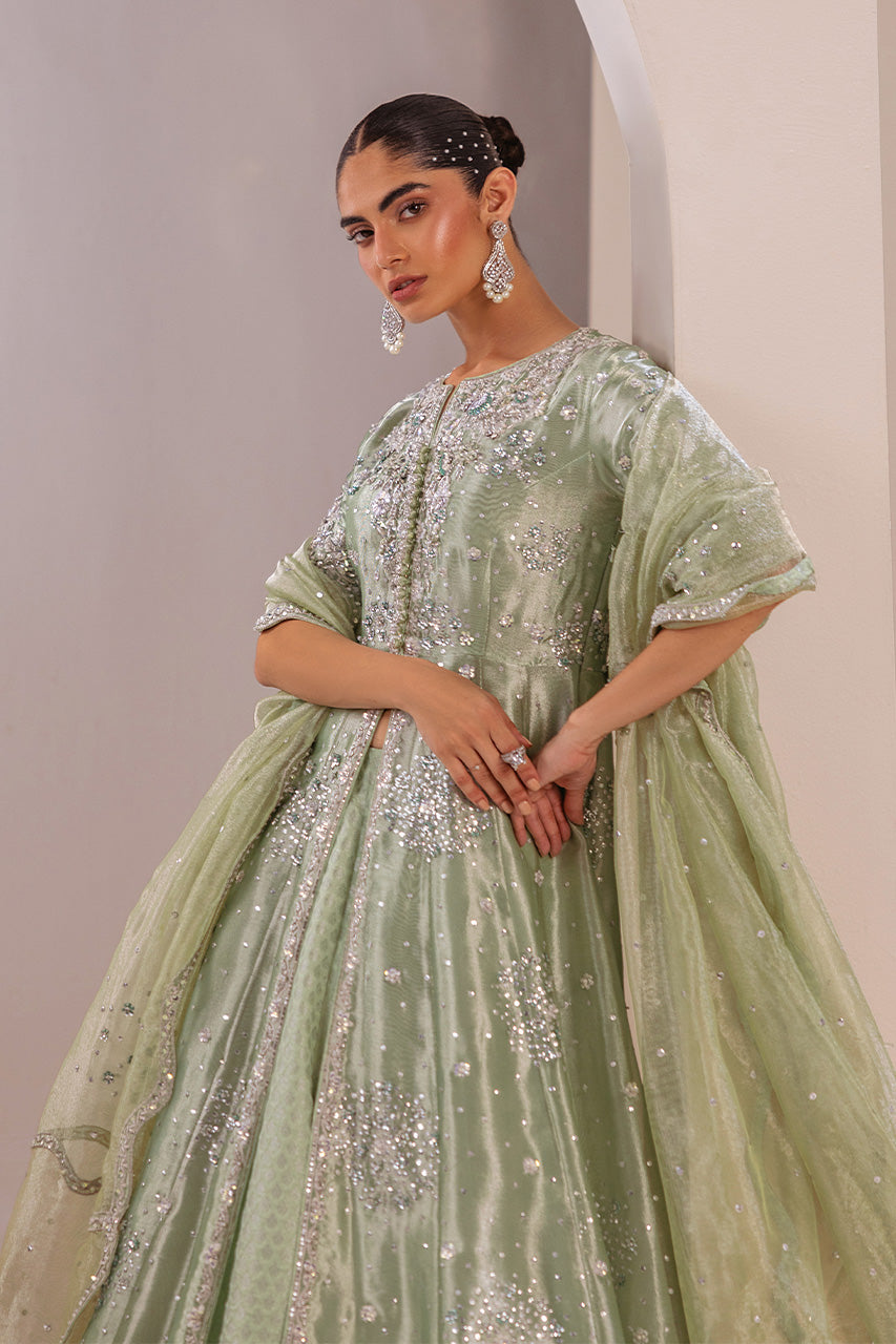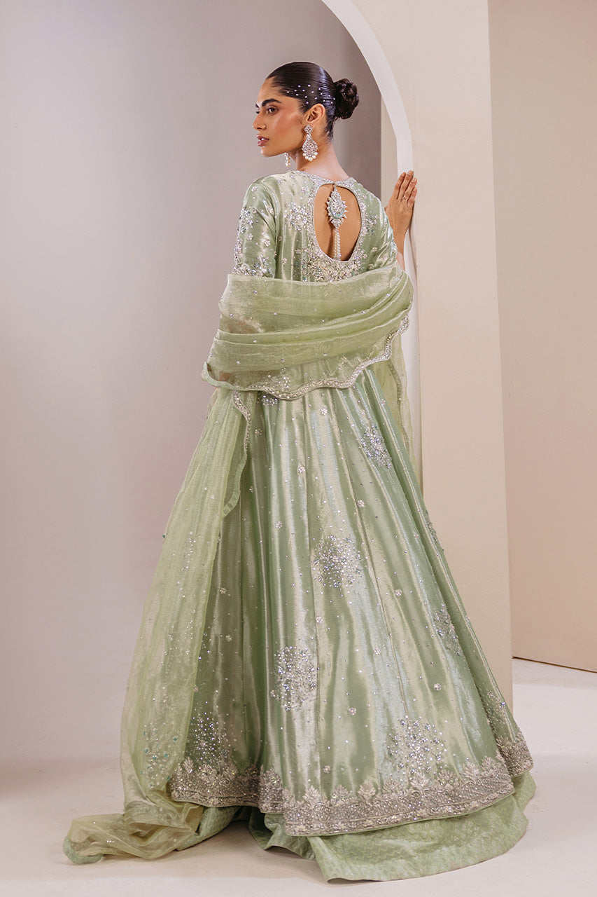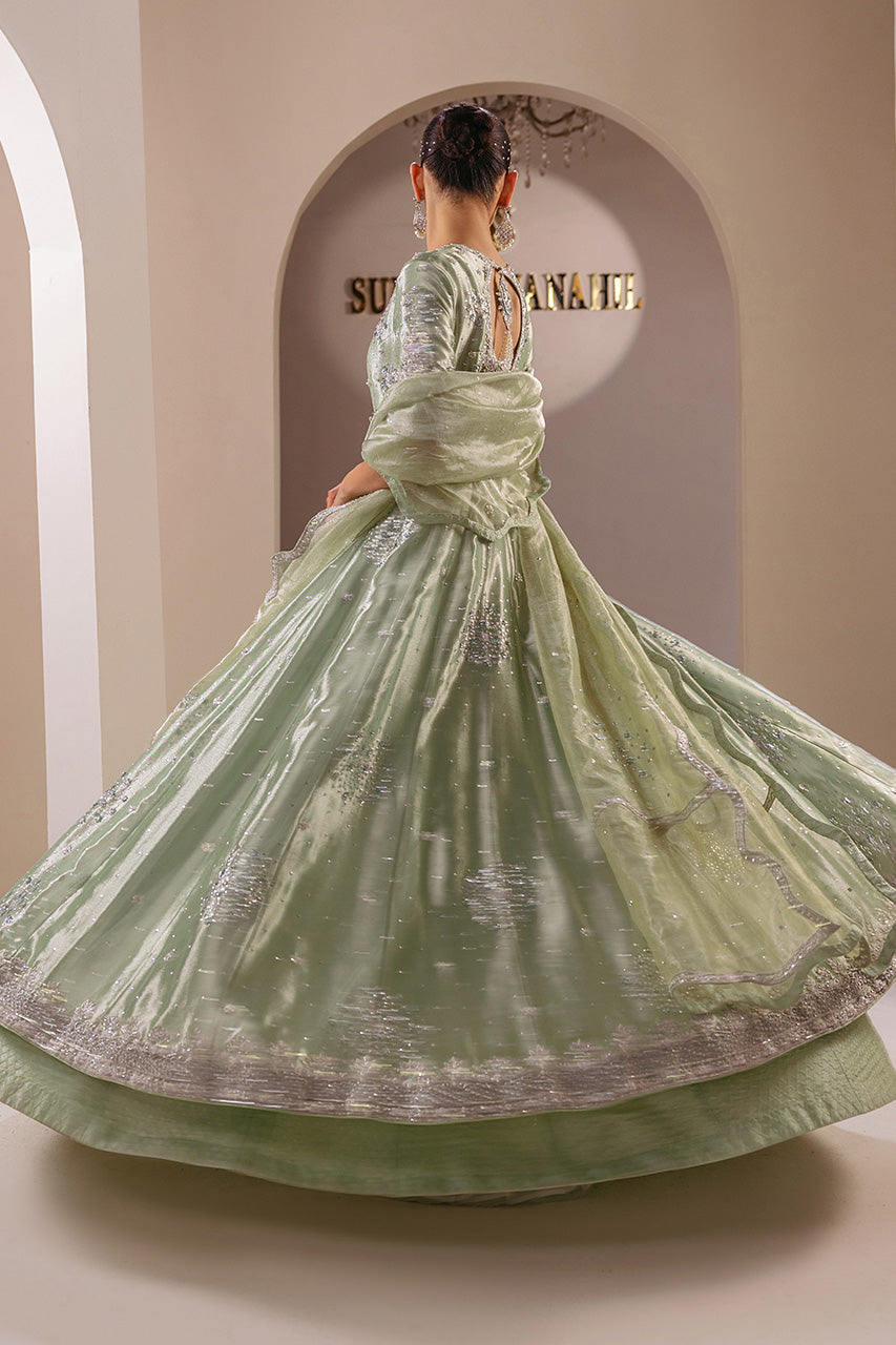 Witness splendor with this beautiful Lama front-open gown adorned with intricate floral and geometric silver hand worked details all over the front and back of gown. It is paired with a complimenting green jamawar lehnga and a green masuri net dupatta with chan and hand worked borders on all four sides.