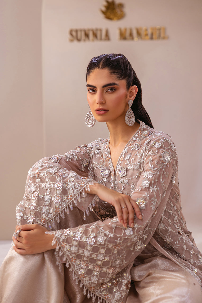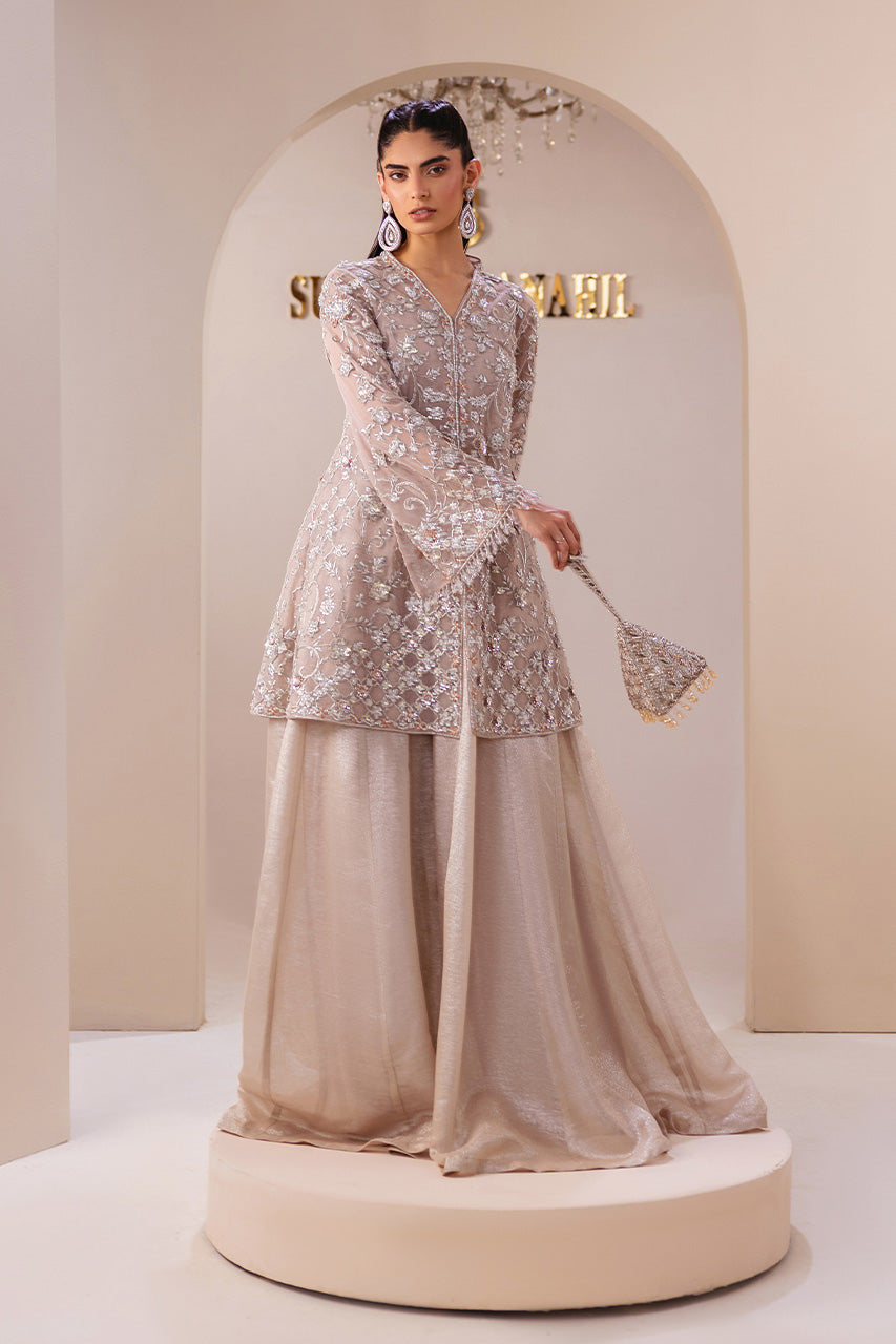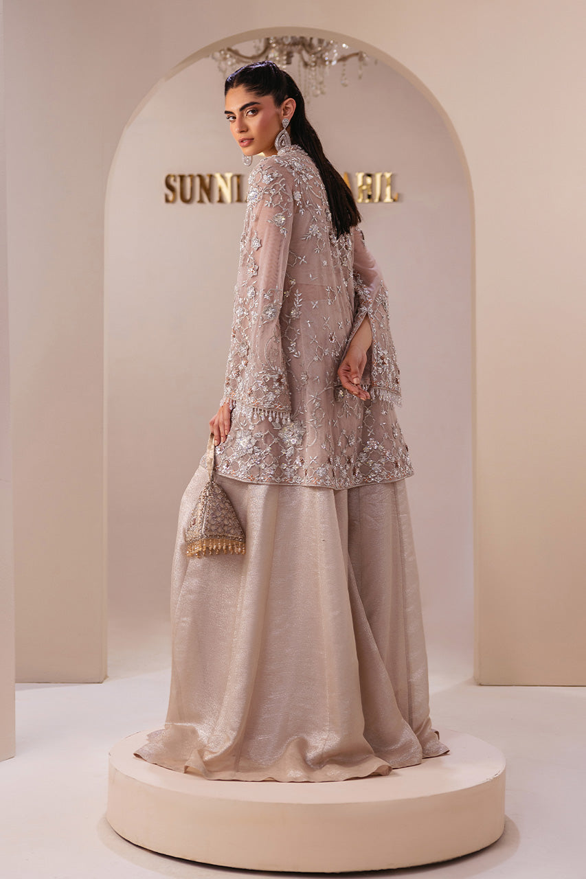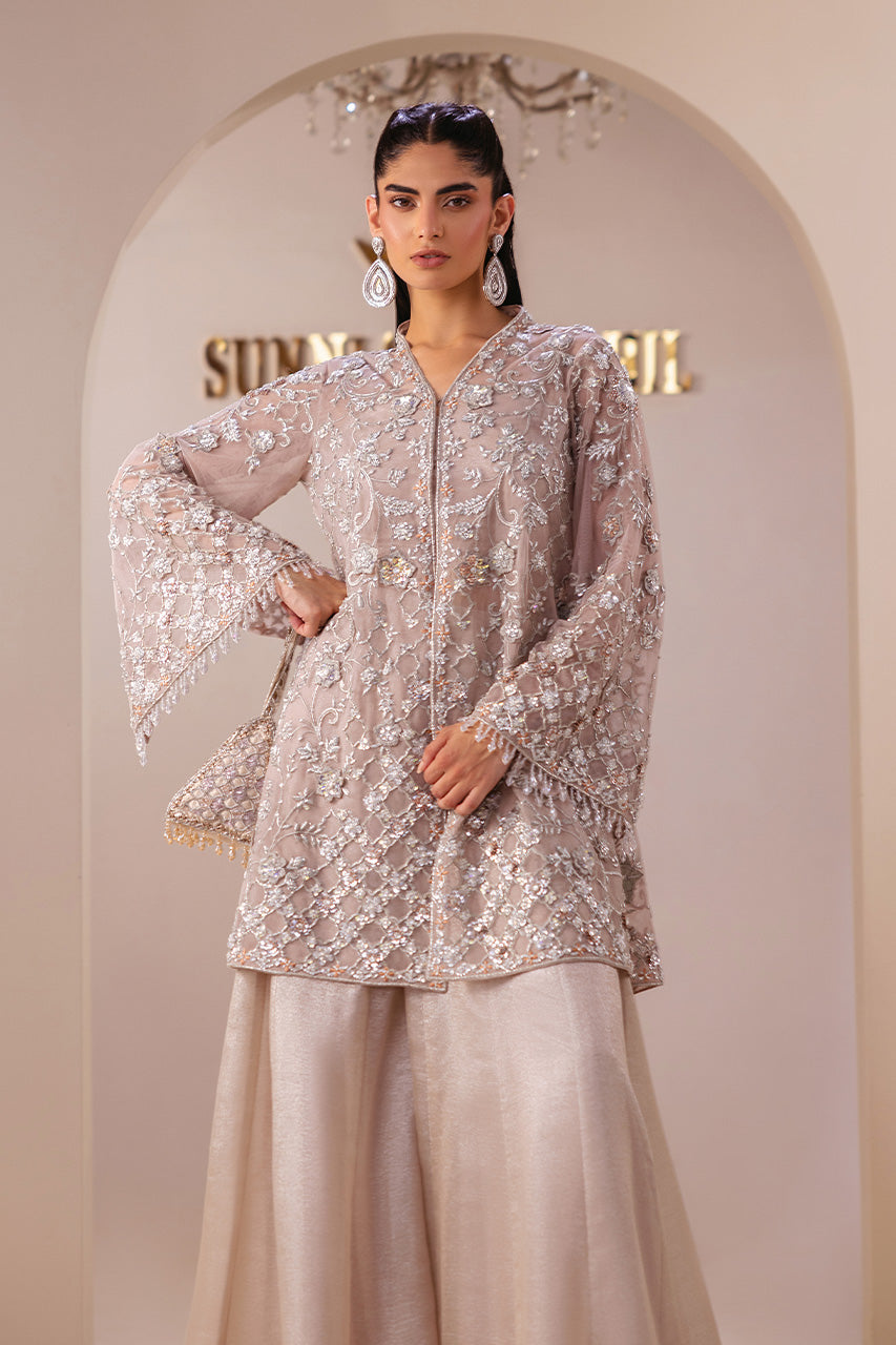 Step into beige sophistication with Ilsa, featuring a front-open net shirt decked with ethereal hand embellishments and intricate cutwork creating a captivating symphony...