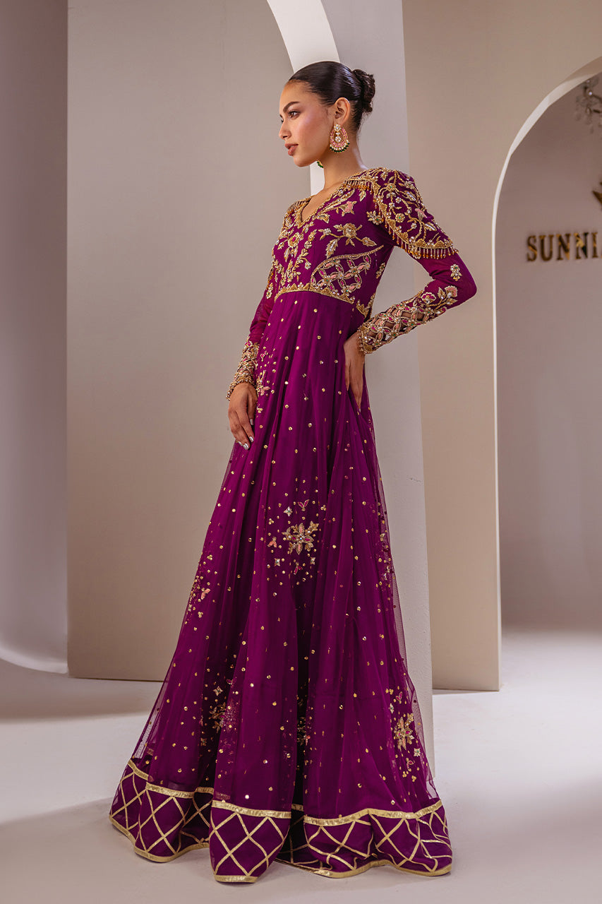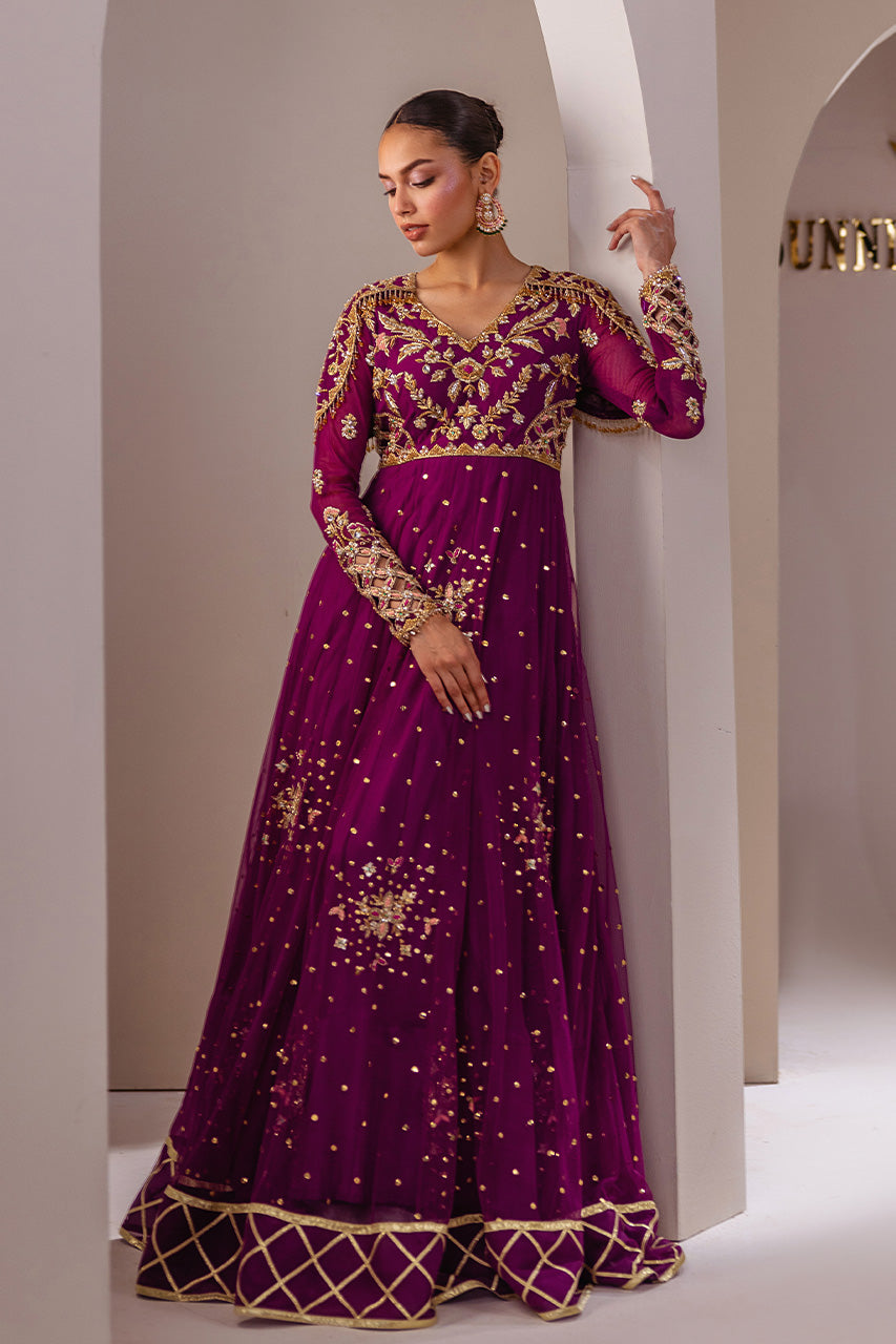 An enchanting ensemble that beckons with allure featuring a magenta french net gown adorned with opulent silk thread and hand worked embellishments all...
