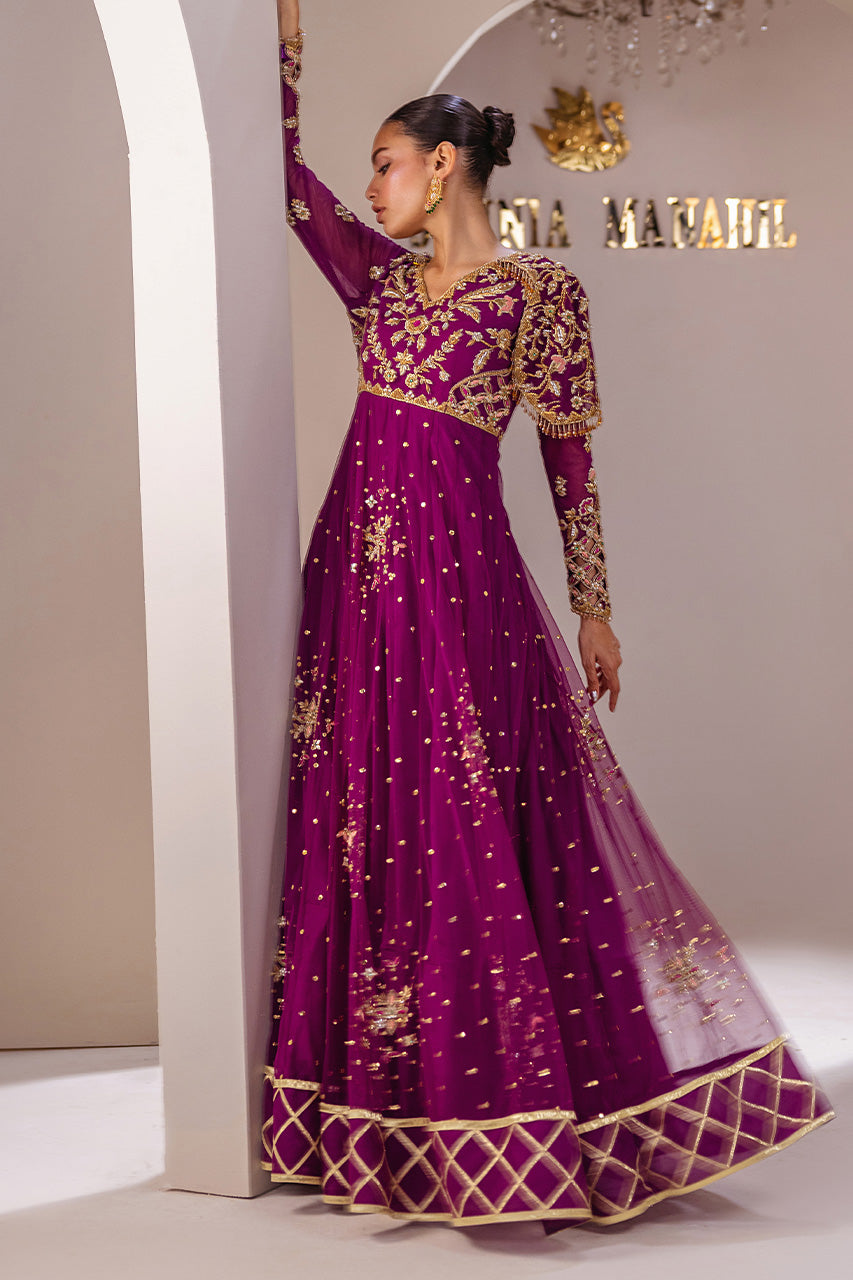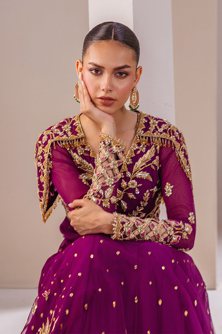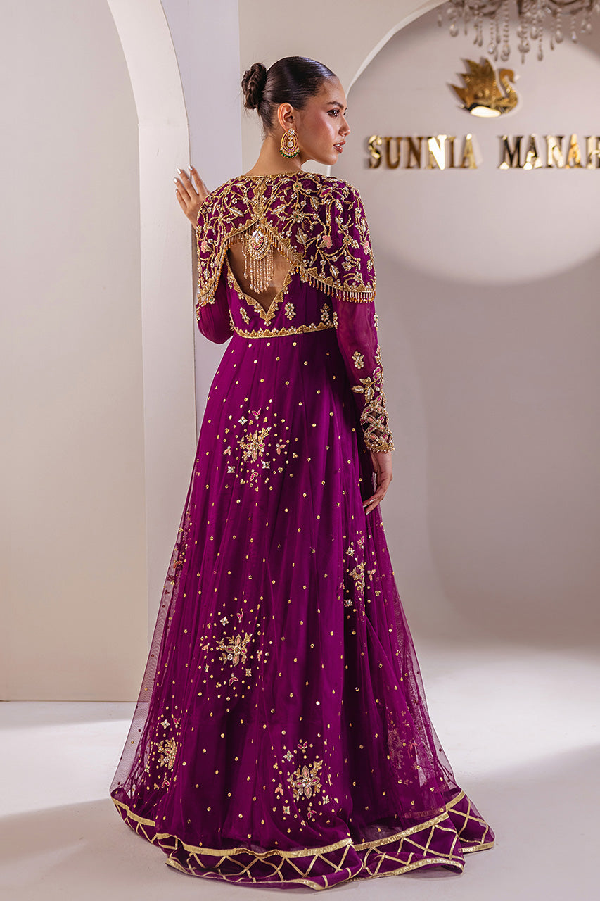 An enchanting ensemble that beckons with allure featuring a magenta french net gown adorned with opulent silk thread and hand worked embellishments all over the gown on front and back, with gota finishing at the borders. The outfit boasts an intricately hand worked shoulder cape loaded with gota and dabka work on both front and back, with hanging tassels bordering the cape and the sleeves are finished with geometric cut work at the end to add a touch of refined sophistication, qualifying Roma as a pefectly captivating ensemble.