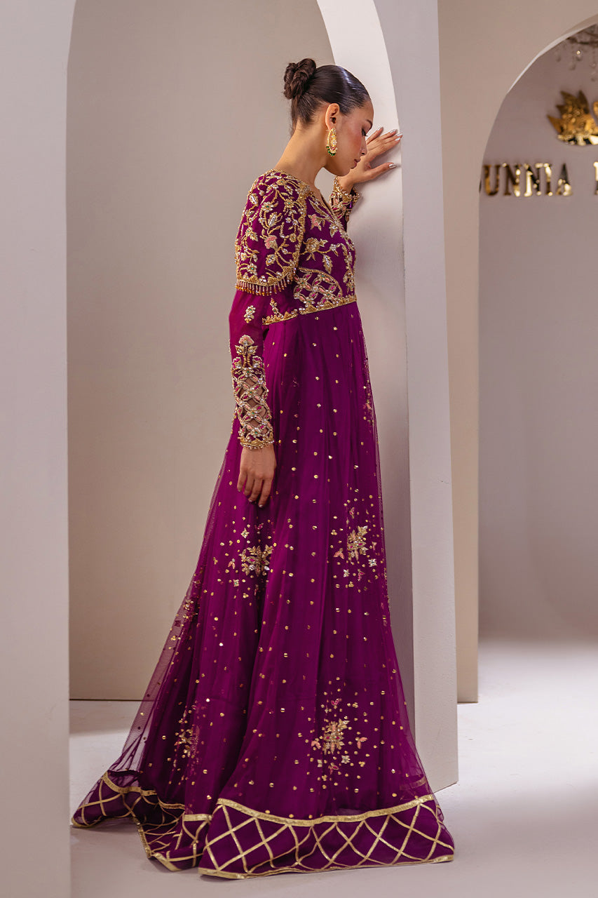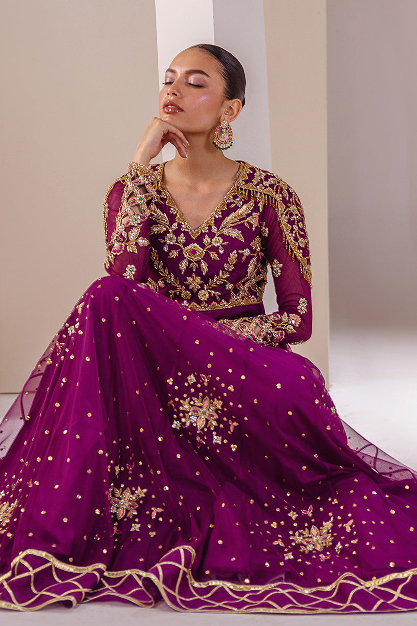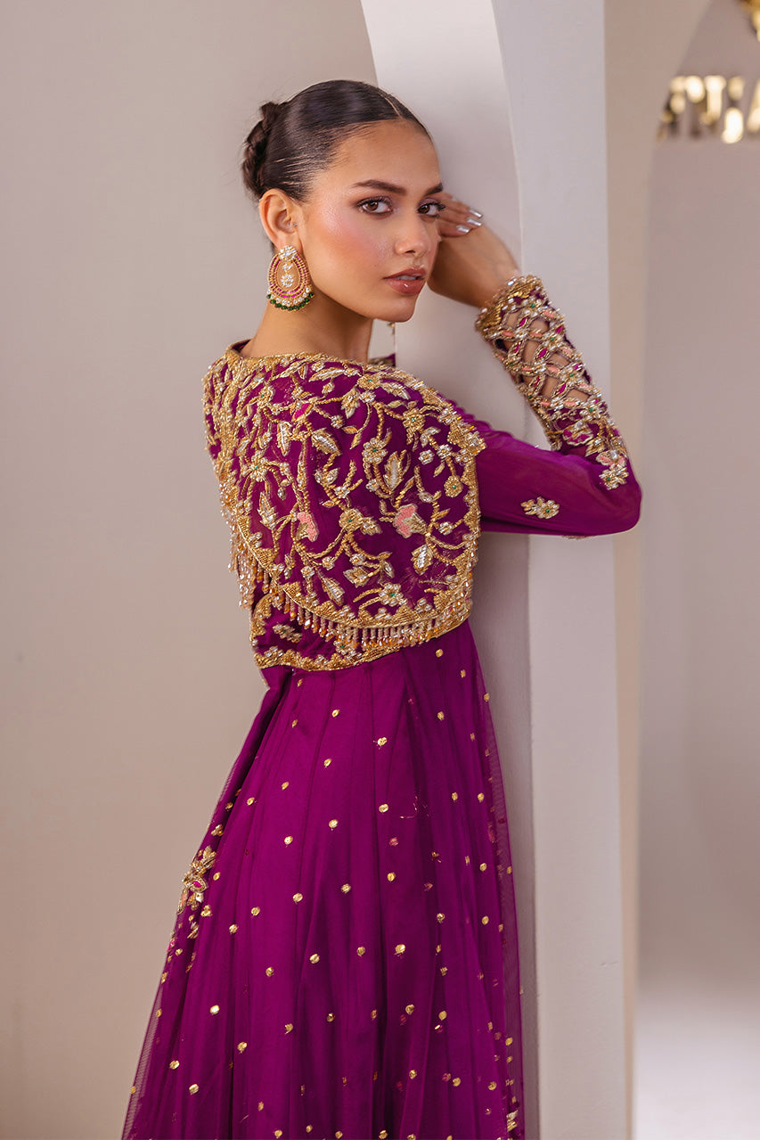 An enchanting ensemble that beckons with allure featuring a magenta french net gown adorned with opulent silk thread and hand worked embellishments all over the gown on front and back, with gota finishing at the borders. The outfit boasts an intricately hand worked shoulder cape loaded with gota and dabka work on both front and back, with hanging tassels bordering the cape and the sleeves are finished with geometric cut work at the end to add a touch of refined sophistication, qualifying Roma as a pefectly captivating ensemble.