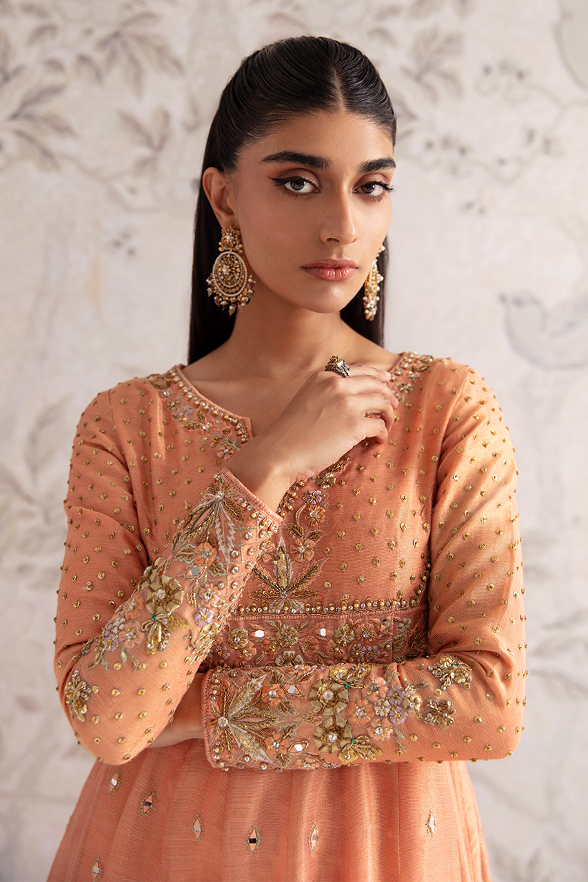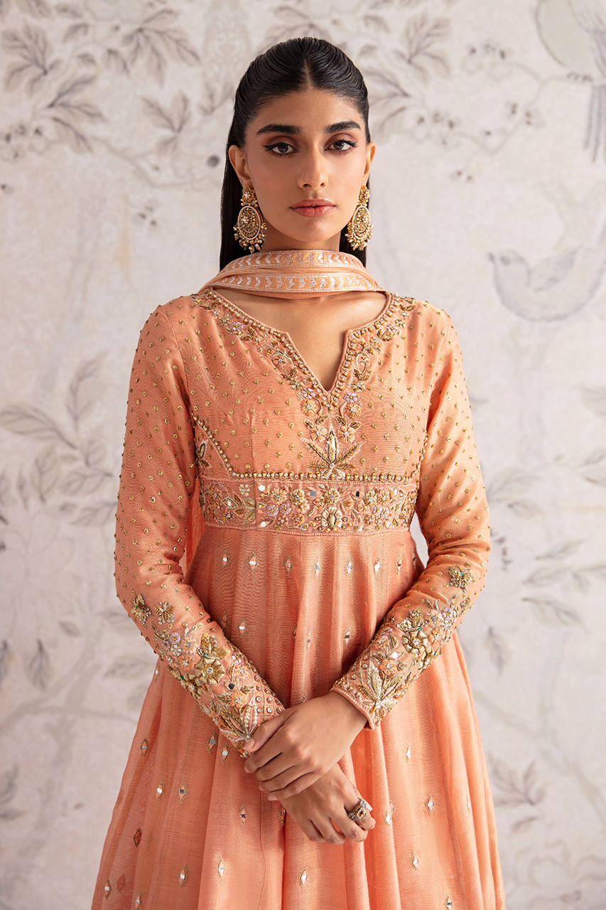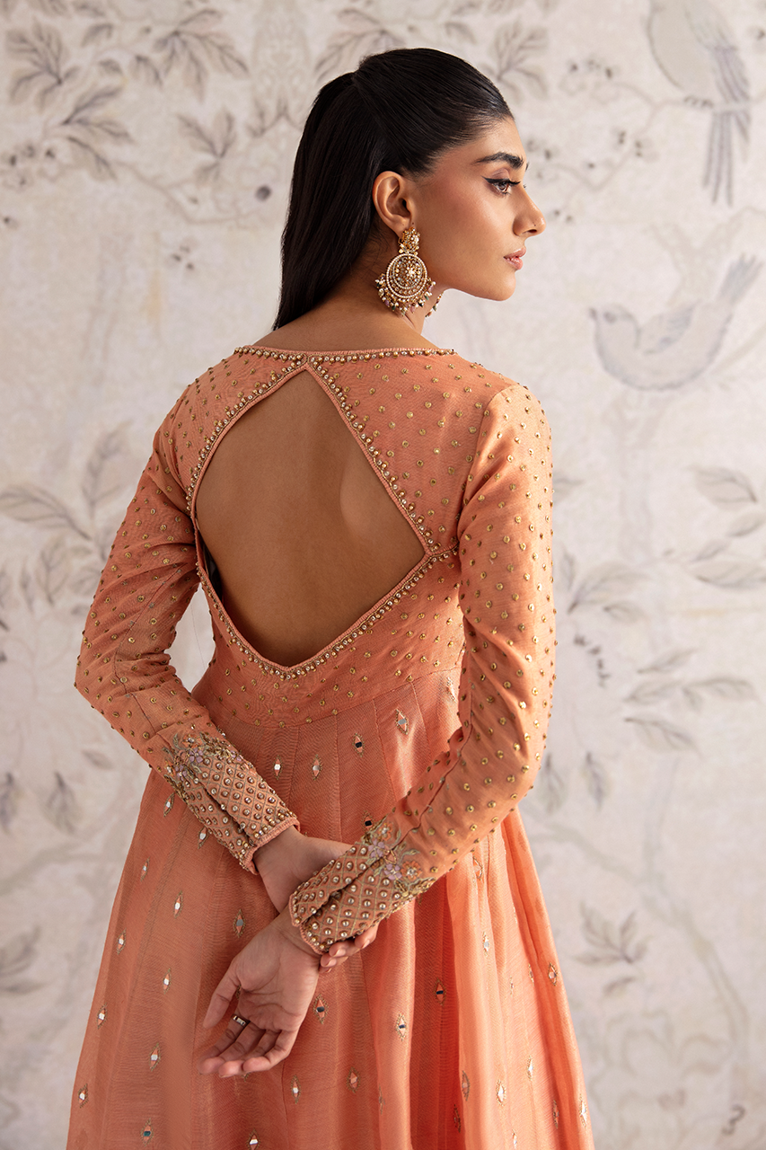 A dreamy peach zari net gown, delicately embroidered with intricate patterns and adorned with shimmering mirrors, along the length of the silhouette. The back detail adds an irresistible allure, while the accompanying net dupatta perfects the enchantment.