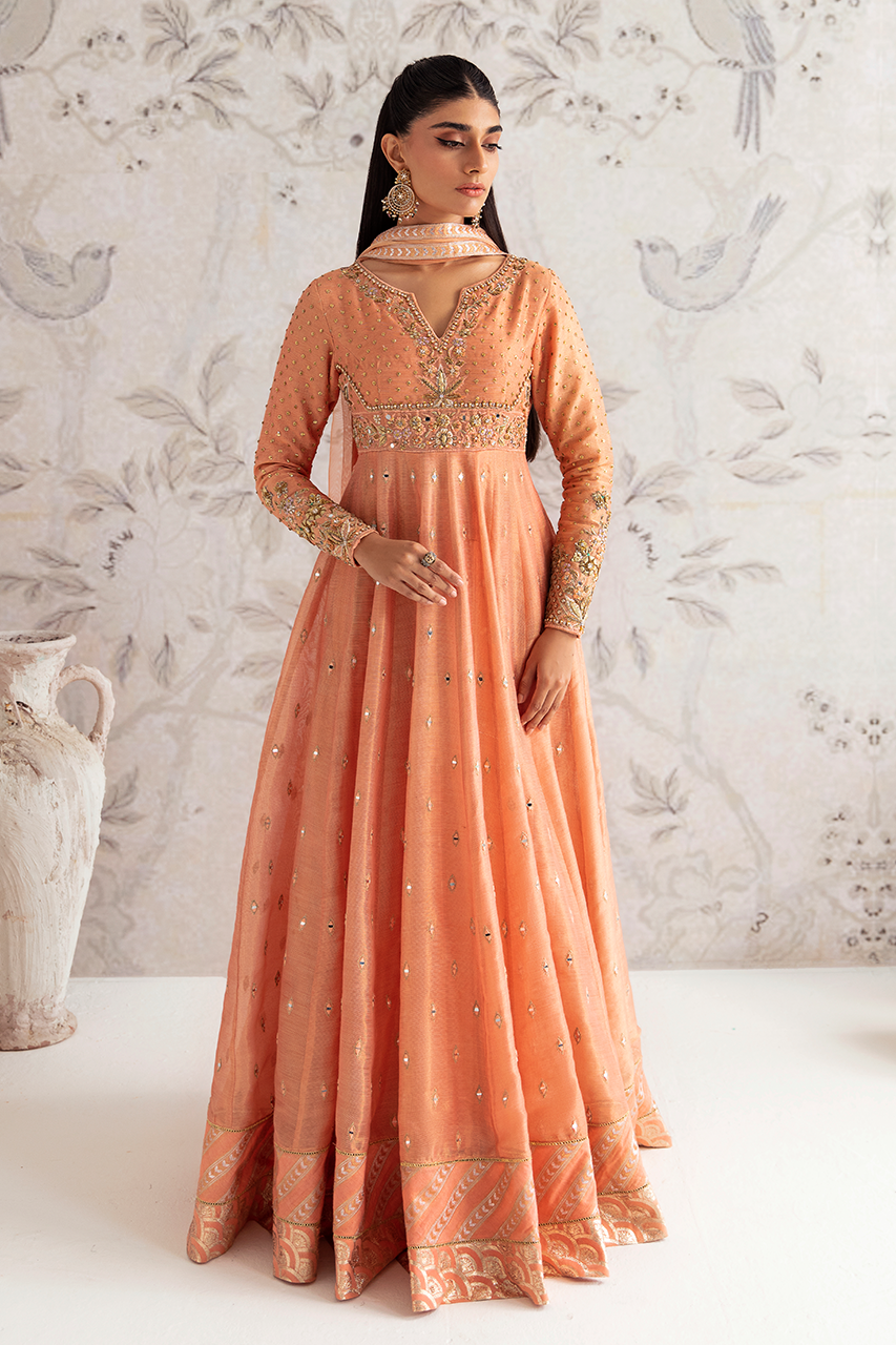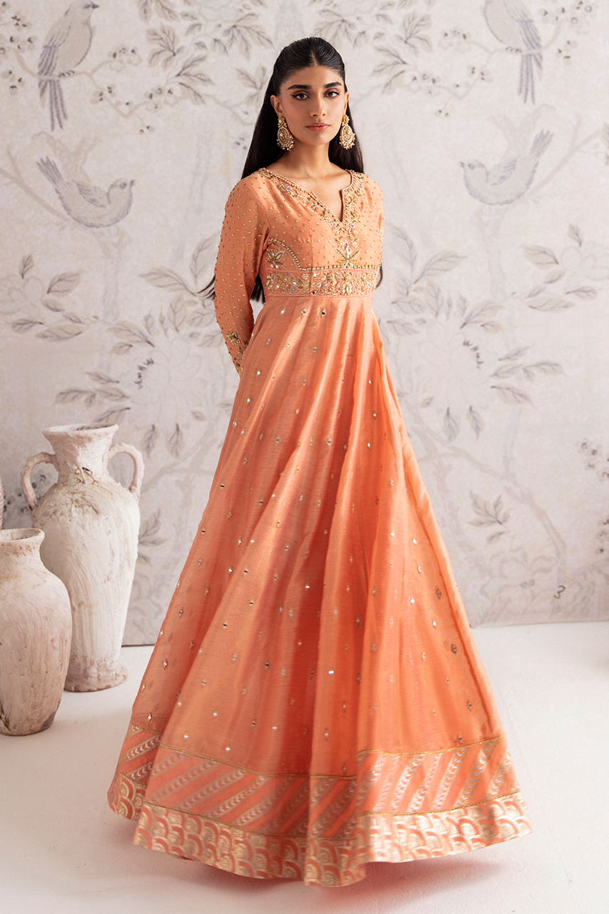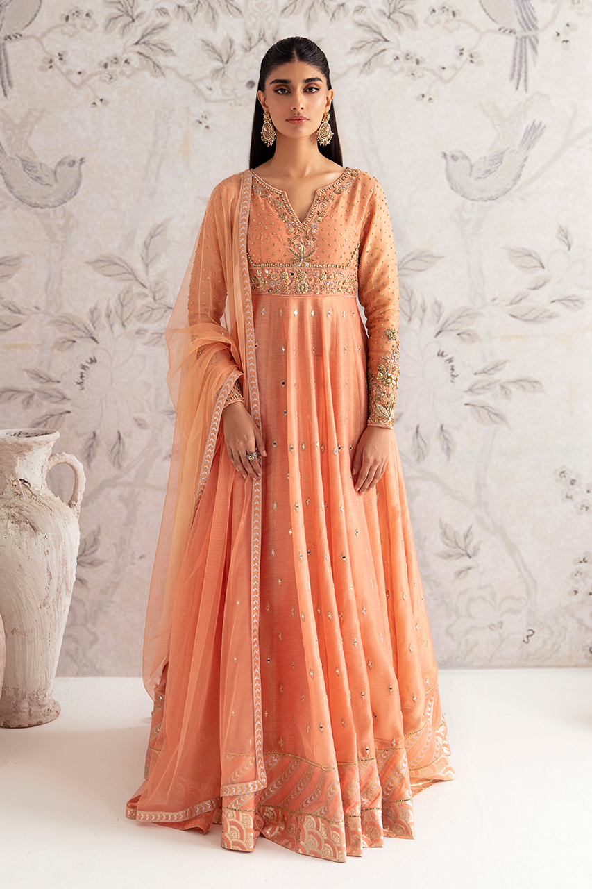 A dreamy peach zari net gown, delicately embroidered with intricate patterns and adorned with shimmering mirrors, along the length of the silhouette. The back detail adds an irresistible allure, while the accompanying net dupatta perfects the enchantment.