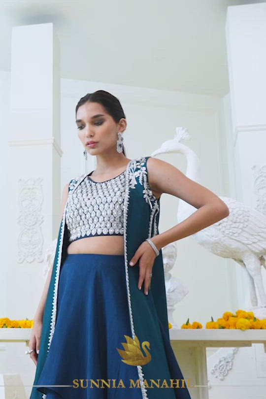 Nina is graceful emerald green and navy outfit showcasing a beautifully embroidered choli and an open raw silk jacket enhanced with silver zari embroidery and exquisite 3D side tassels. Paired along is a stunningly draped silk lehenga to create a look that is sure to leave you awestruck. Embroided sleeves can be added and the back of the choli can be covered too.