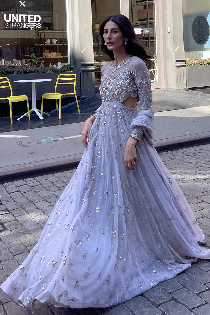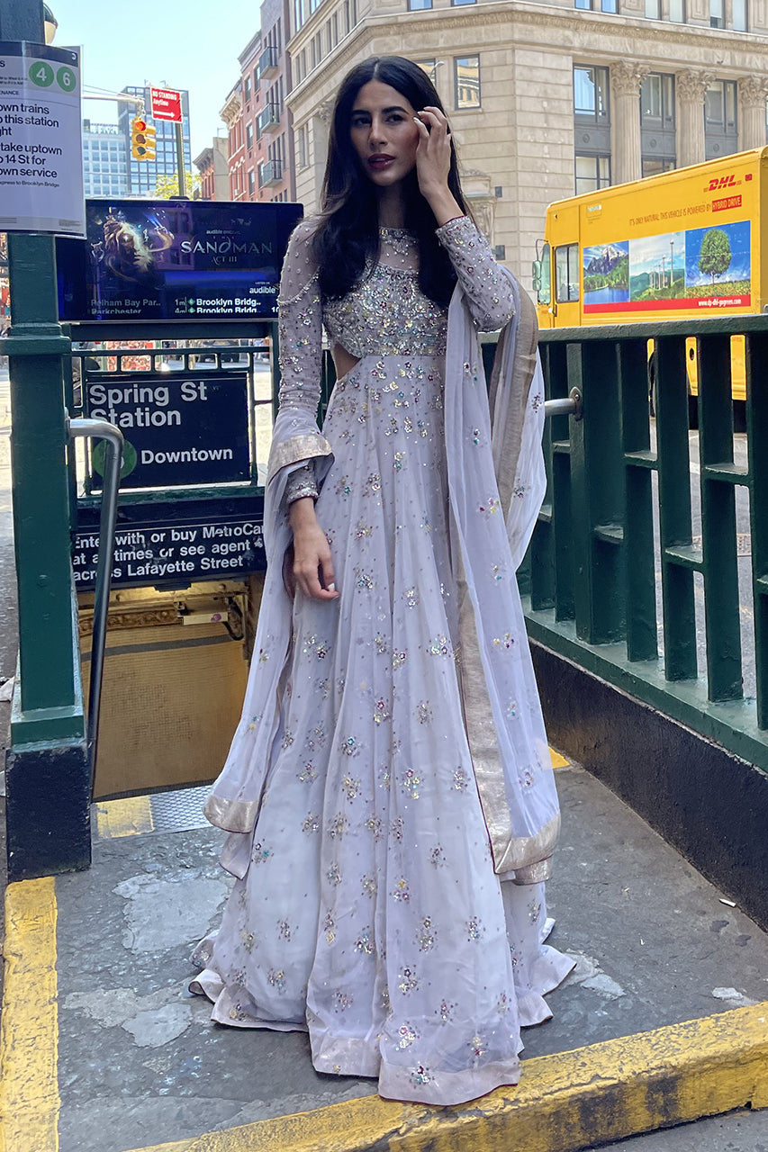 “Noire”, our formal Kalidar set based on grey hue. This kalidar has a cutout on the waist fused on french net with multi-hued gleaming hand embroidered flowers making it a mandatory ceremonial outfit.