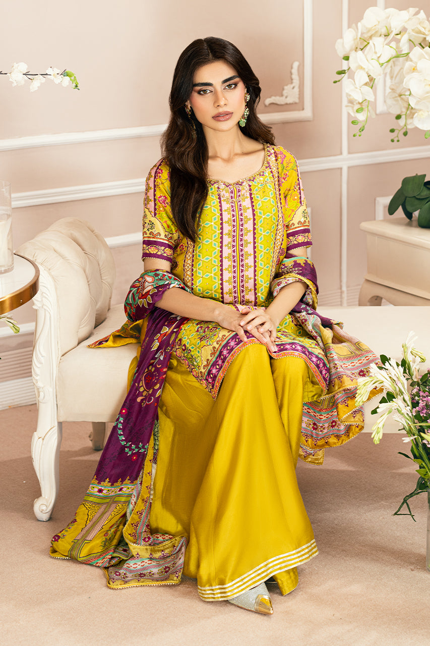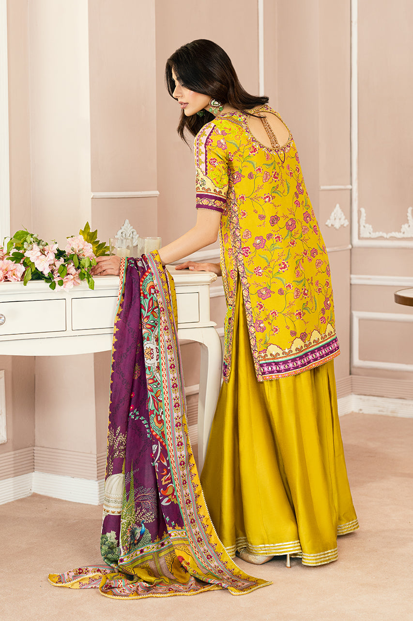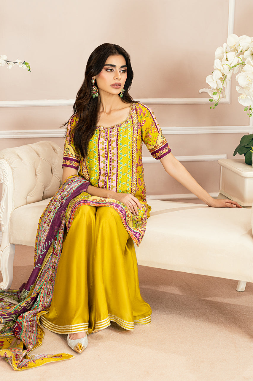 Experience the allure of printed perfection and refreshing hues with this mustard raw silk shirt. Every detail, from the intricately crafted neckline to the distinctive keyhole back adorned with playful tassels, exudes elegance. The shirt is paired with silk dhaka pajama, featuring a four-tiered gota border, and a contrasting digital silk dupatta with subtle gota accents. This captivating silhouette is the ultimate festive essential, designed to make a statement on any occasion.