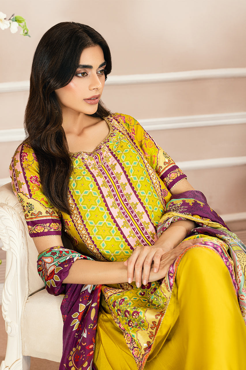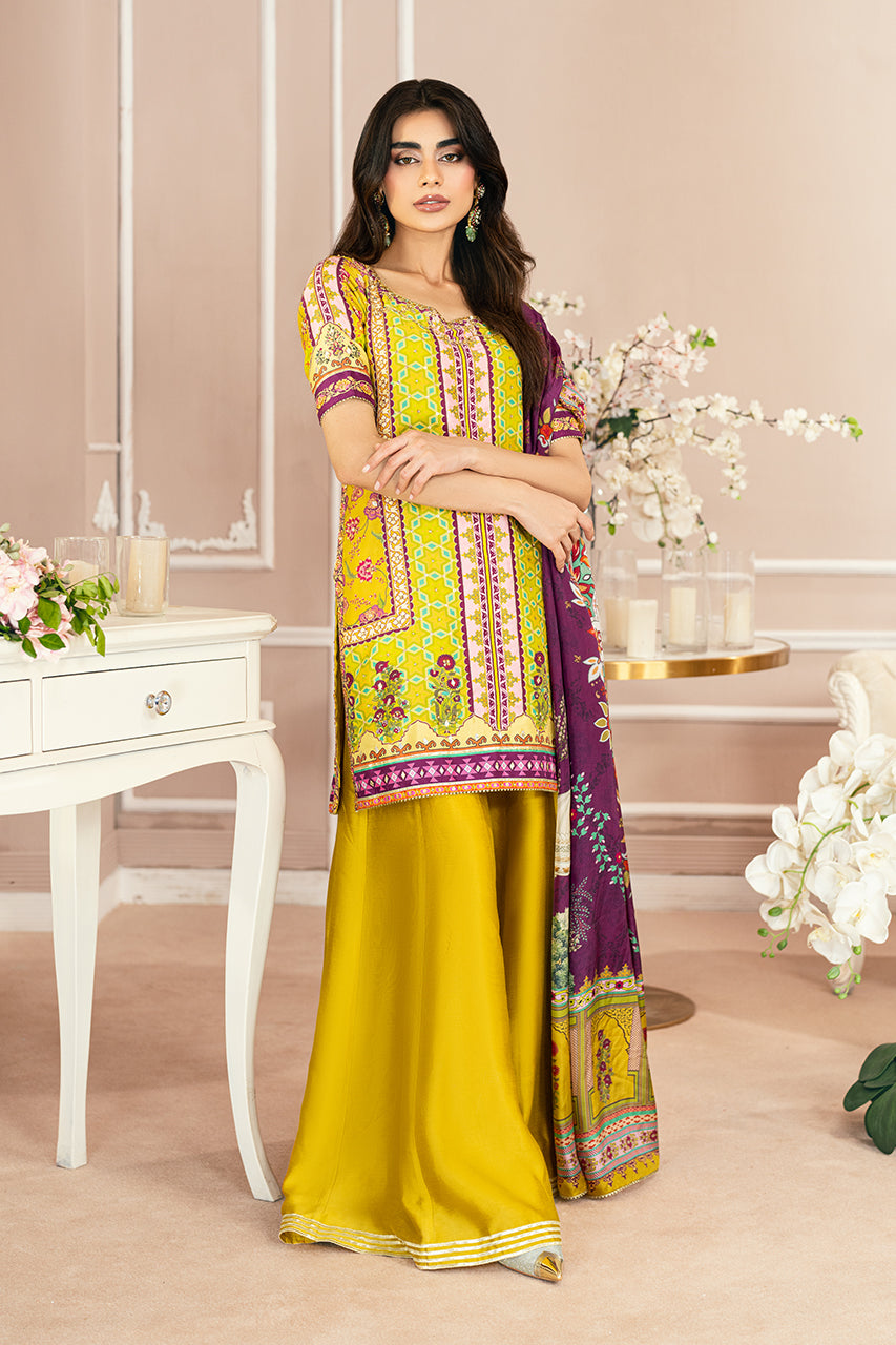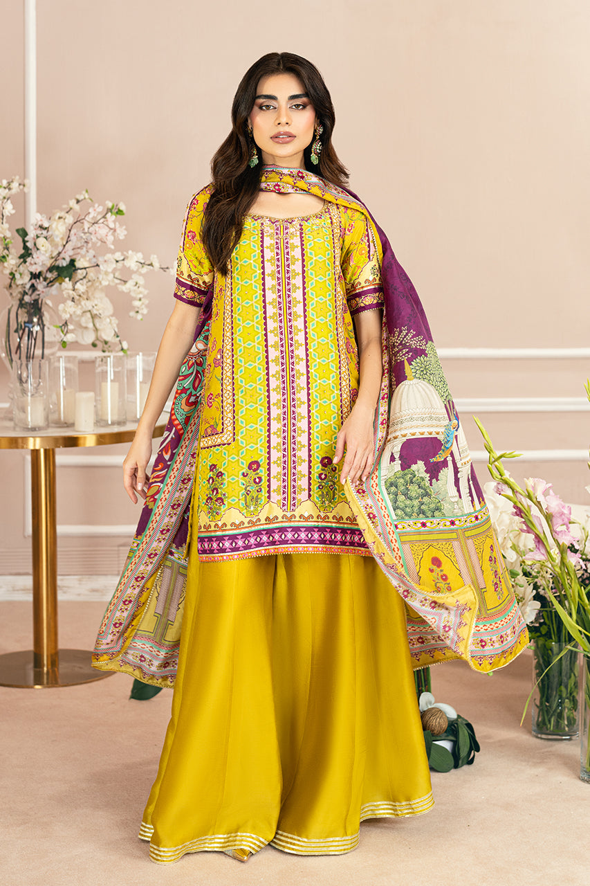 Experience the allure of printed perfection and refreshing hues with this mustard raw silk shirt. Every detail, from the intricately crafted neckline to the distinctive keyhole back adorned with playful tassels, exudes elegance. The shirt is paired with silk dhaka pajama, featuring a four-tiered gota border, and a contrasting digital silk dupatta with subtle gota accents. This captivating silhouette is the ultimate festive essential, designed to make a statement on any occasion.