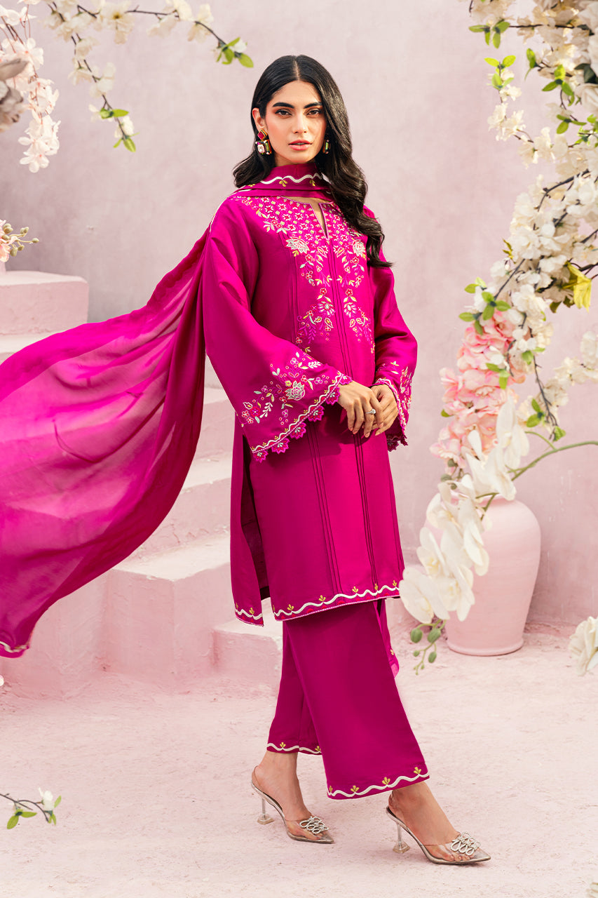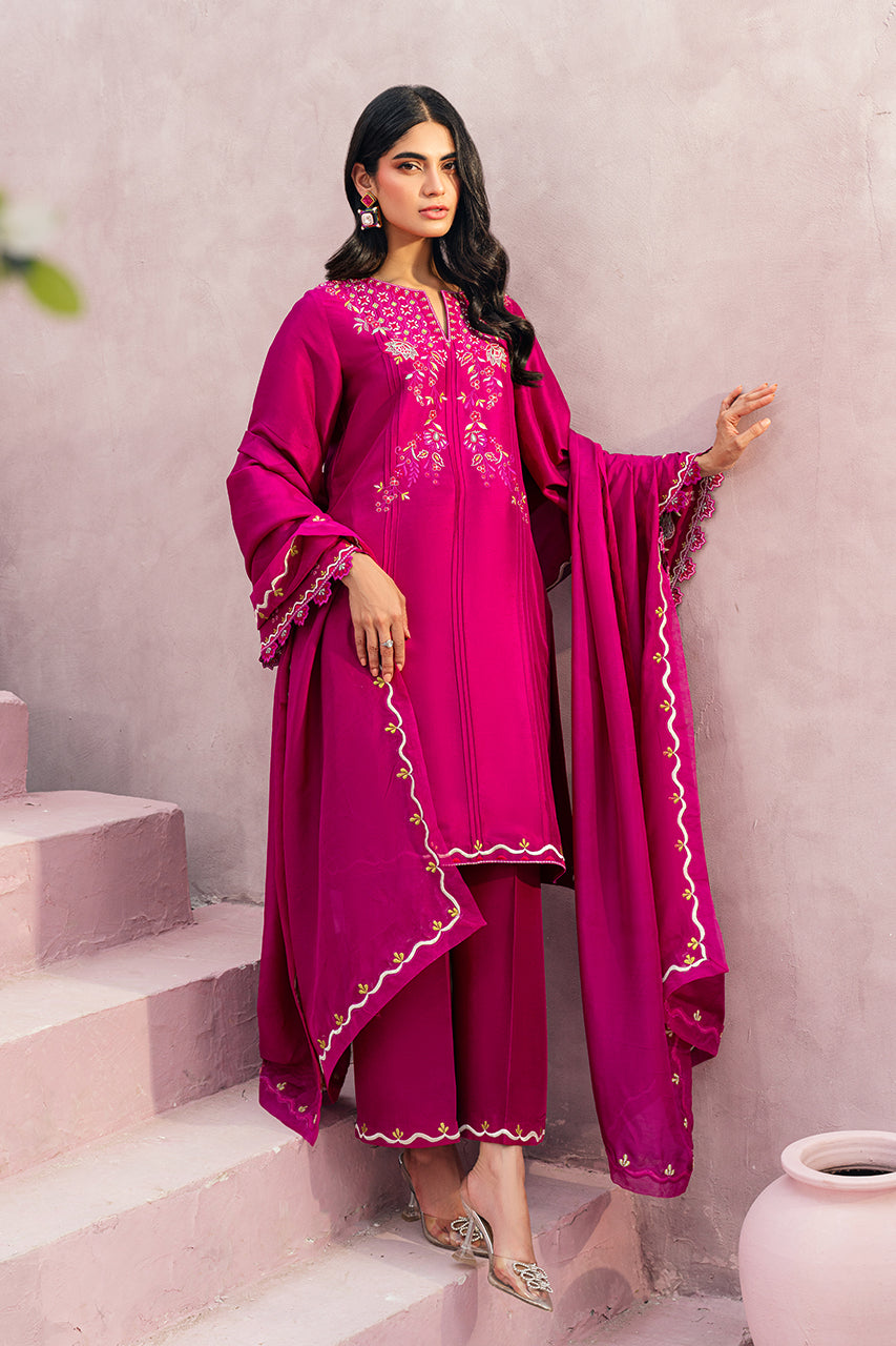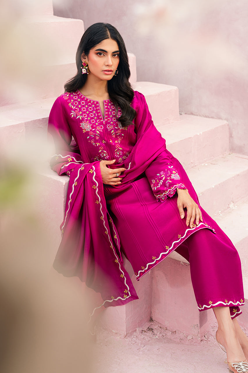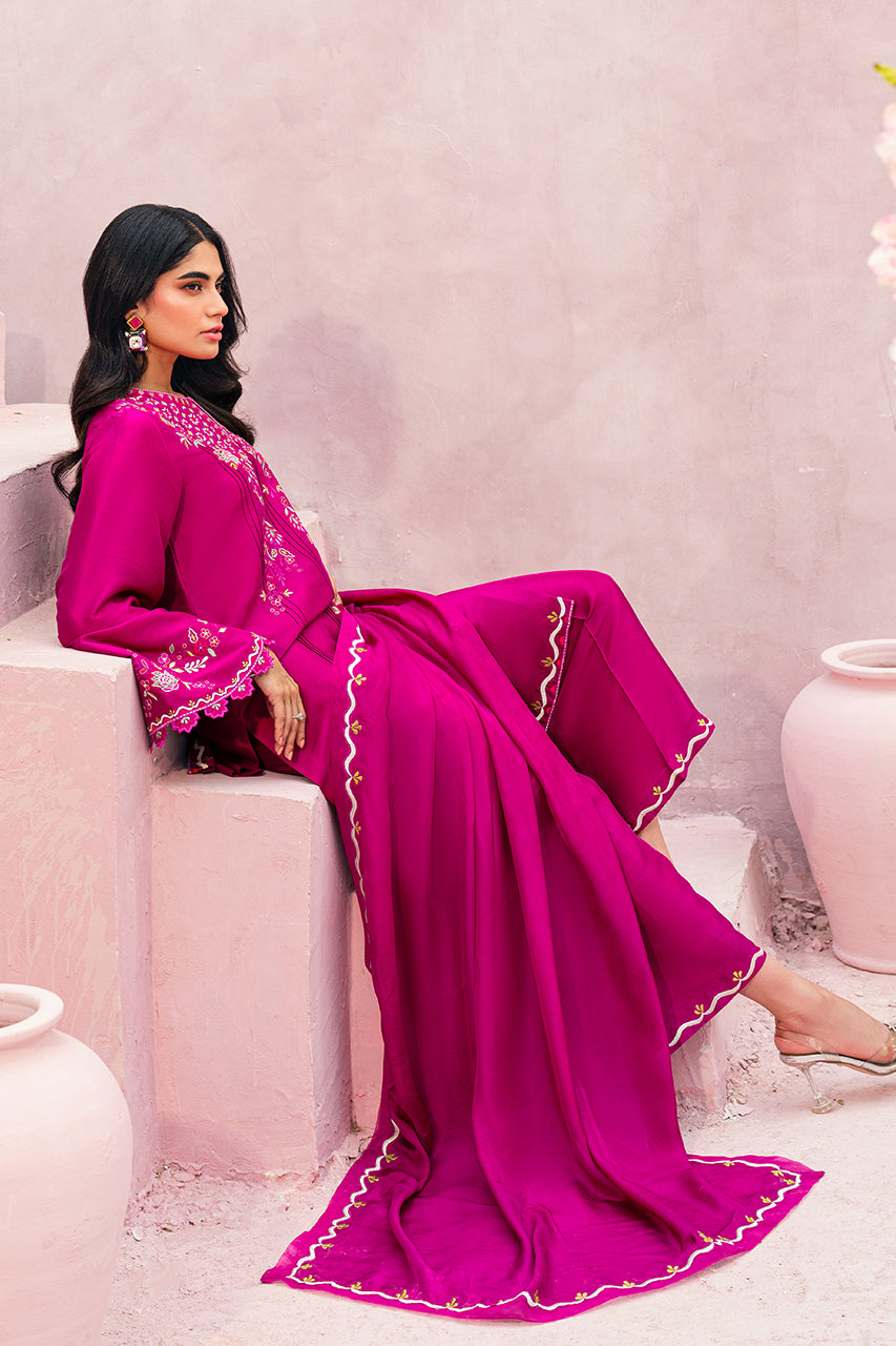 A vision in magenta, this knee-length raw silk shirt is covered in delicate work that flows like poetry across the neckline, sleeves, and the hem. The beautiful floral patterns of the embroidery are splendidly rendered in accents of multiple uplifting colors. Paired with sleek izaar pants and a silk dupatta trimmed with graceful detailing, this outfit is sure to enchant every moment