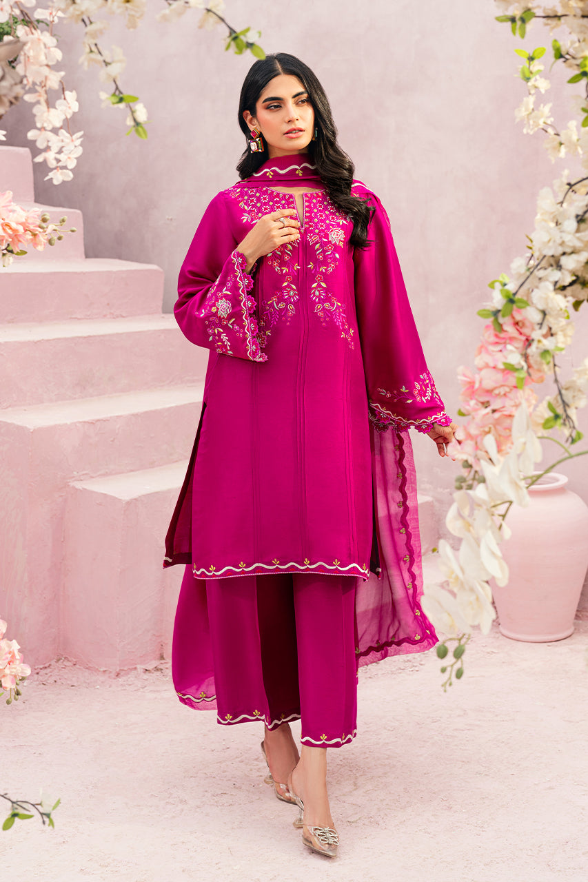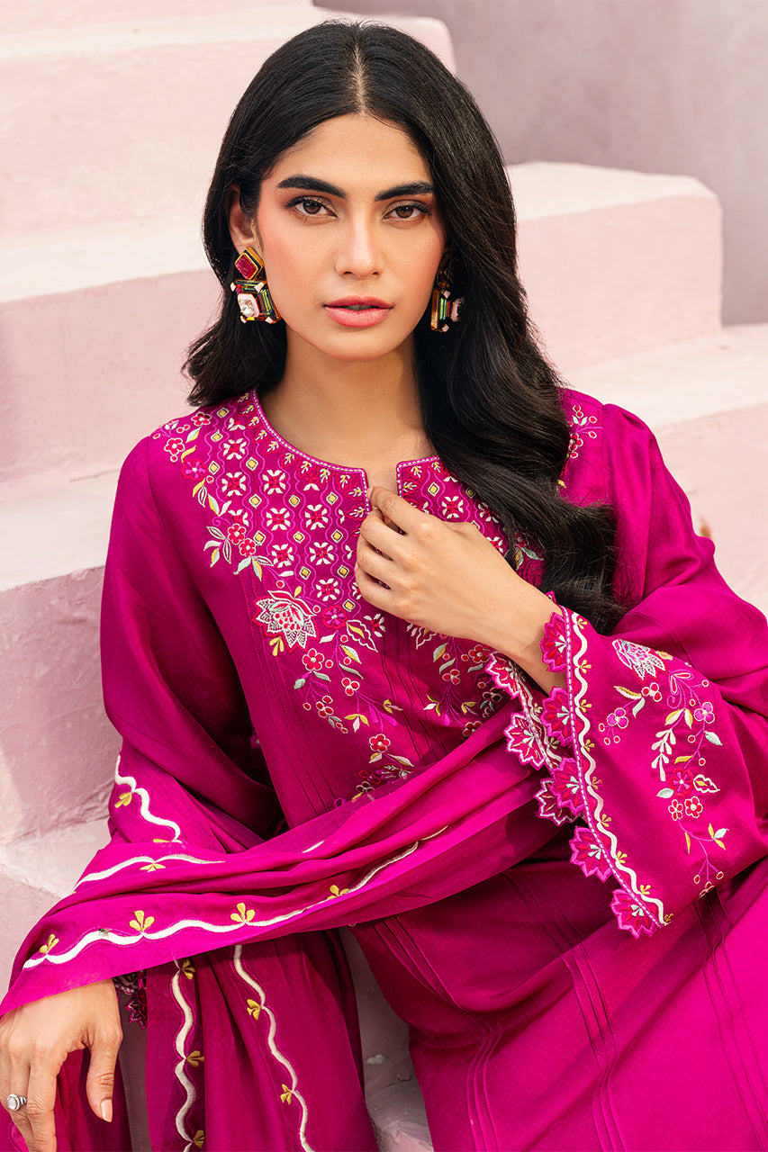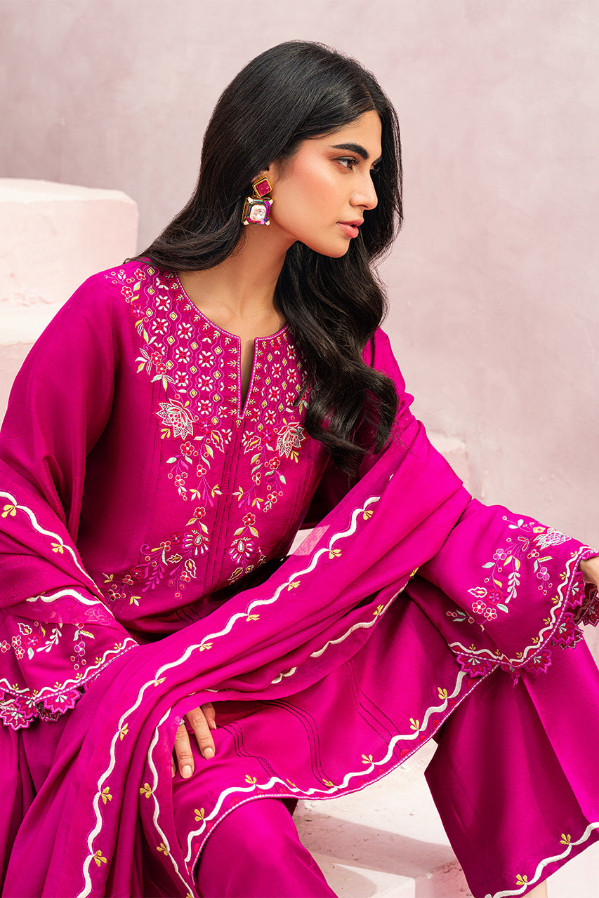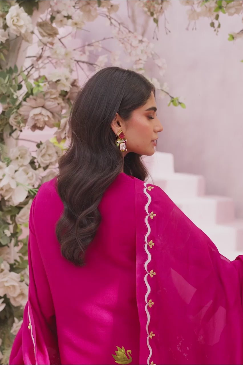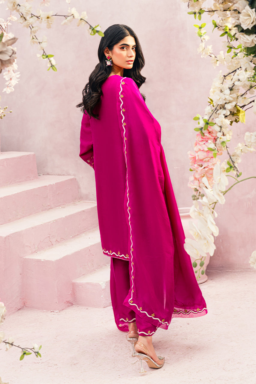 A vision in magenta, this knee-length raw silk shirt is covered in delicate work that flows like poetry across the neckline, sleeves, and the hem. The beautiful floral patterns of the embroidery are splendidly rendered in accents of multiple uplifting colors. Paired with sleek izaar pants and a silk dupatta trimmed with graceful detailing, this outfit is sure to enchant every moment
