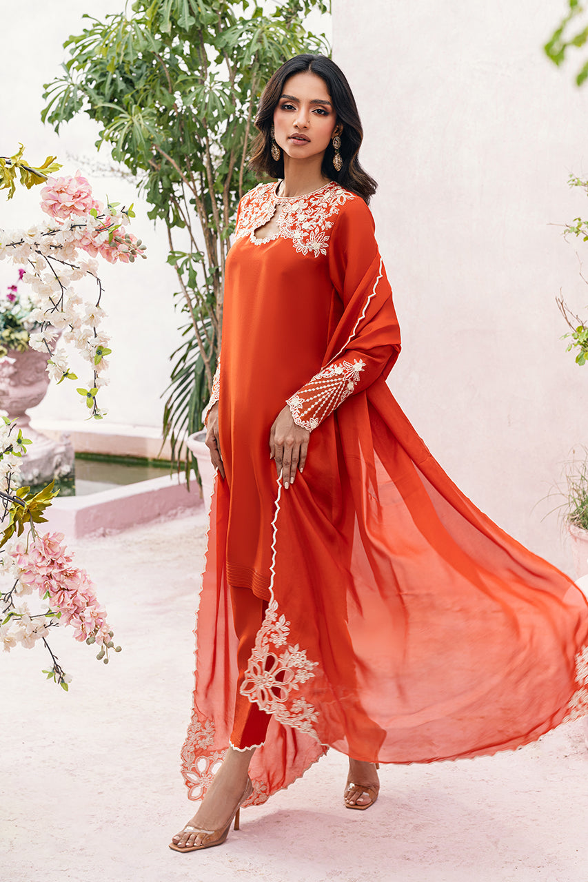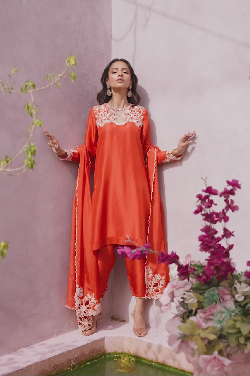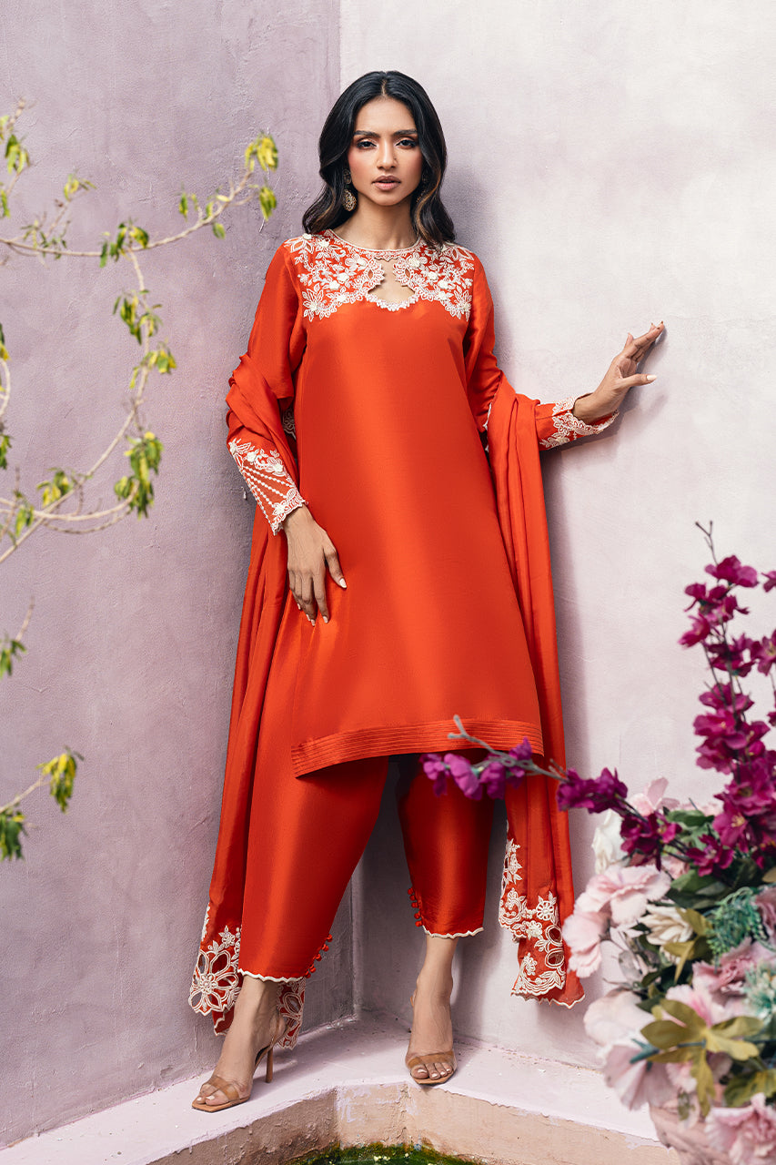 Make a statement with sleek, minimalist outfit in a bold pumpkin hue. The raw silk shirt features intricate machine and hand work, accentuating the keyhole neckline and sleeves. The embroidered back with a similar keyhole cutwork adds an uplifting detail to the look. The silk dupatta with intricate embroidered cutwork, in the middle and four corners, looks ethereal while the raw silk shalwar completes the mesmerising look.