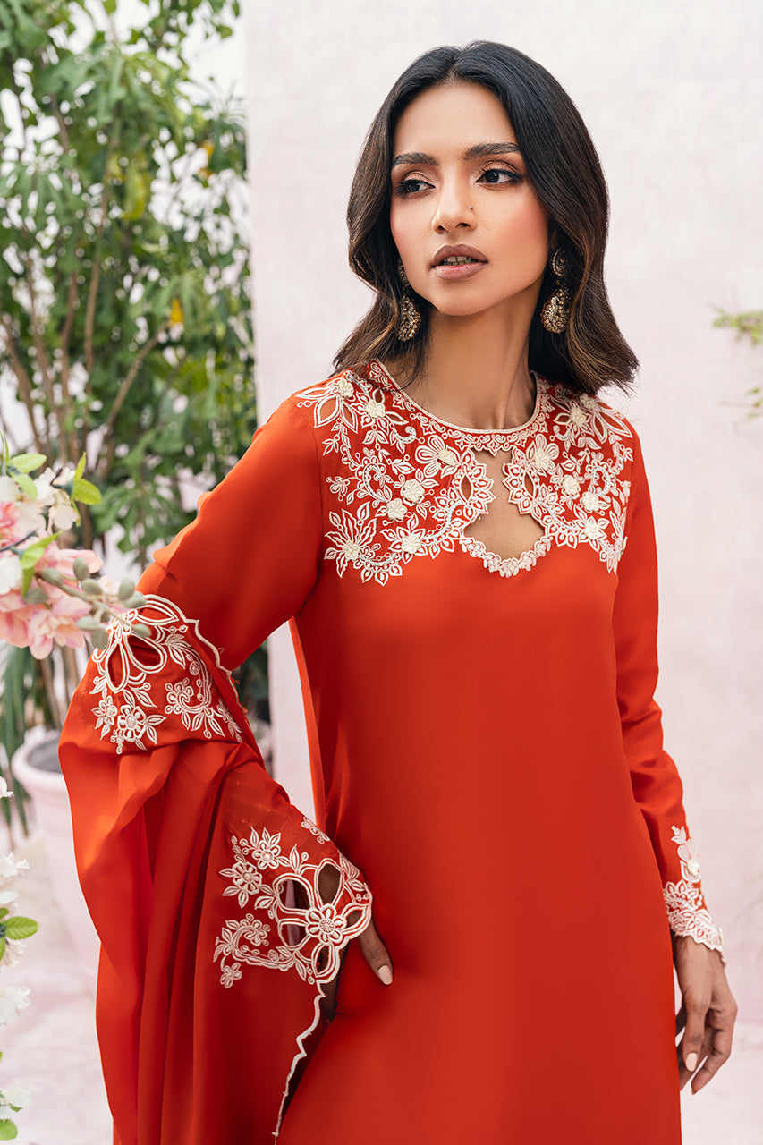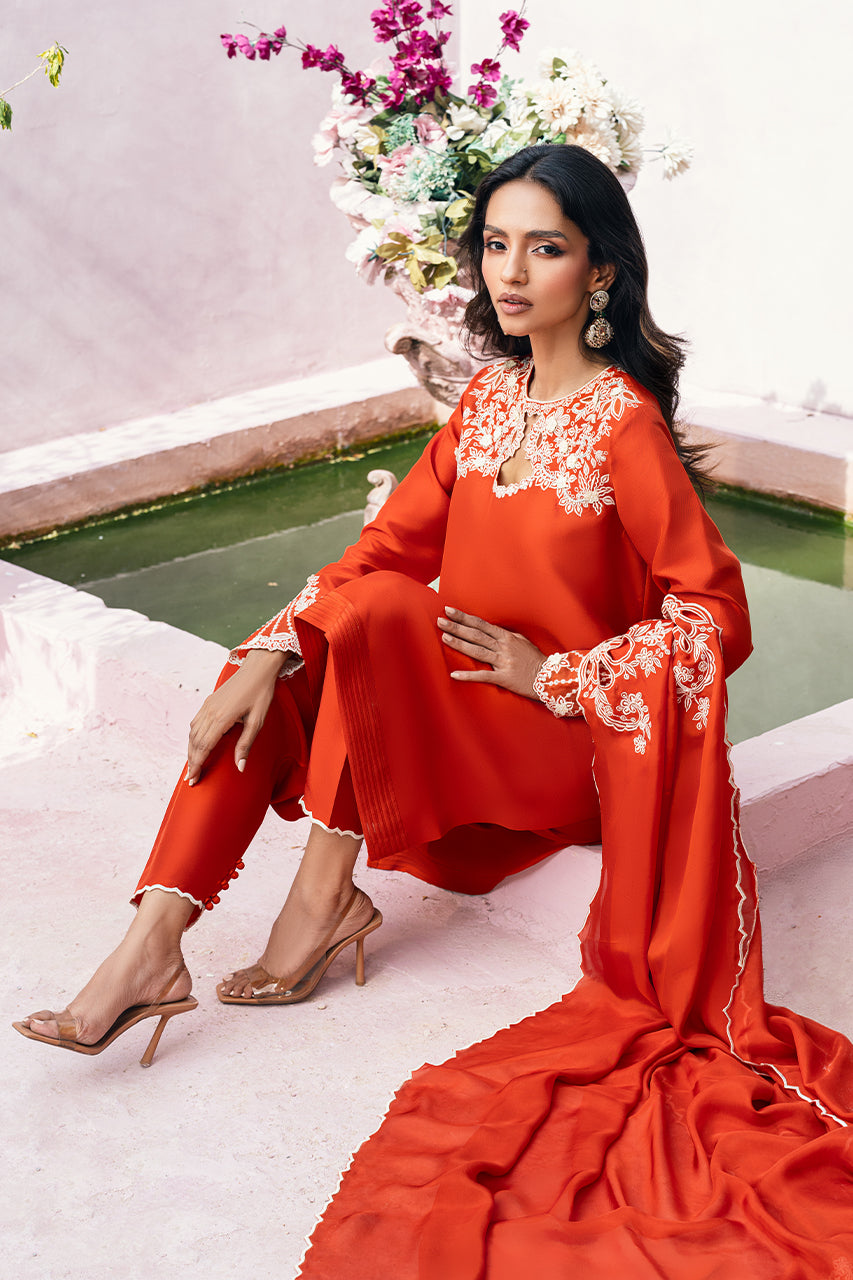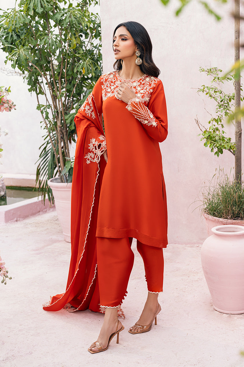Make a statement with sleek, minimalist outfit in a bold pumpkin hue. The raw silk shirt features intricate machine and hand work, accentuating the keyhole neckline and sleeves. The embroidered back with a similar keyhole cutwork adds an uplifting detail to the look. The silk dupatta with intricate embroidered cutwork, in the middle and four corners, looks ethereal while the raw silk shalwar completes the mesmerising look.