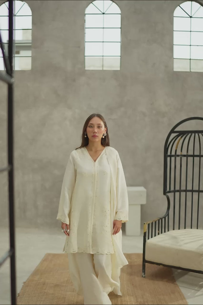 Elevate your style with this must-have ensemble featuring a pure white raw silk jacket that radiates understated elegance, with intricate Ari embroidery and hand work and finished with delicate scalloped edges along the hem and sleeves. The ensemble is paired with a draped silk dupatta, beautifully adorned with a central motif and graceful hand embroidered hangings along the top. Completing the look are tailored raw silk free flowing pants, offering a modern silhouette and comfortable fit. Designed for both grace and impact, it’s a flawless blend of tradition and contemporary style.