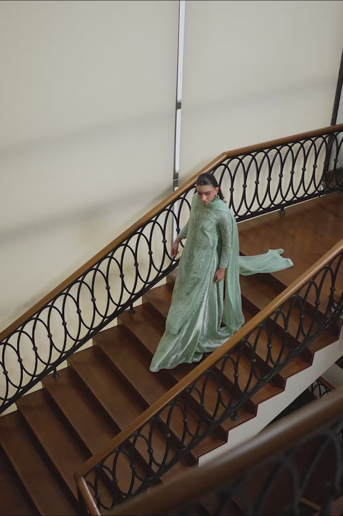 A refreshing green french net long shirt, richly detailed with heavy embroidery that highlights its graceful silhouette. Designed with a subtle pla... see more