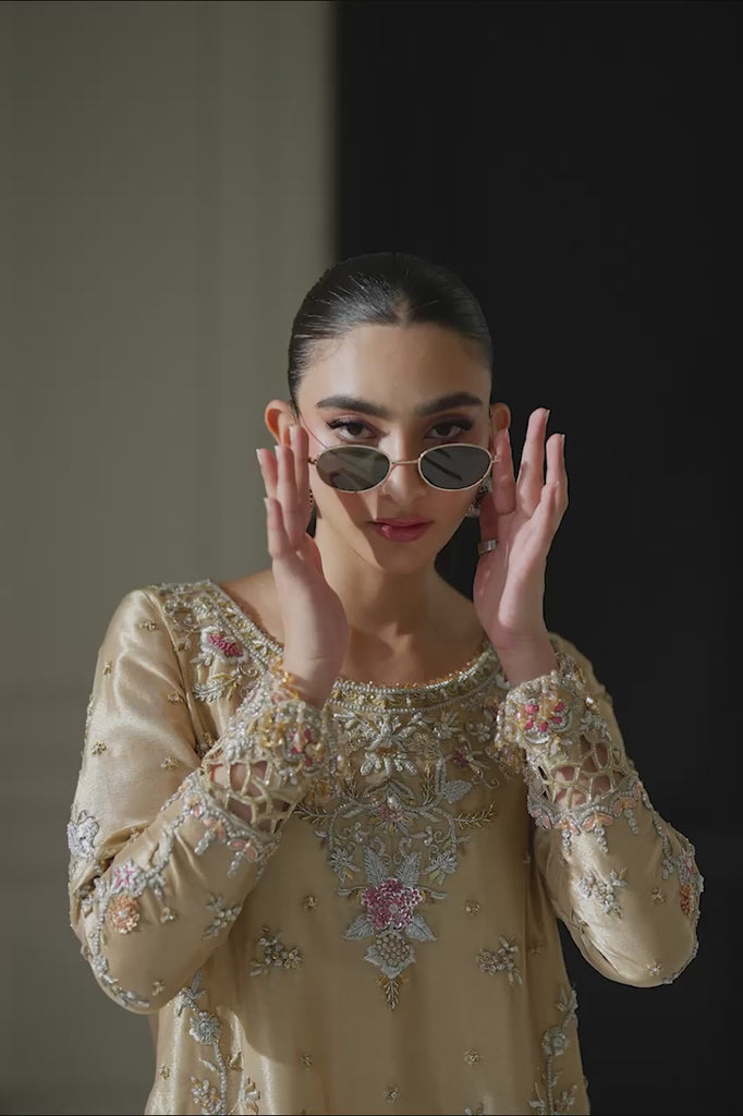 A regal, dull gold lame long shirt, luxuriously crafted with a heavily embellished cutwork border and a beautifully designed neckline. Full sleeves enhance the grandeur, while a delicately placed motif on the back, paired with a unique tassel detail, adds a touch of refinement and elegance. It is styled with raw silk izaar pants, finished with an ornate border for subtle sophistication. Completing the ensemble is a zari net dupatta, highlighted with scattered sequin work and graceful finishing, exuding timeless charm with a modern touch. An outfit that radiates understated opulence and elegance.