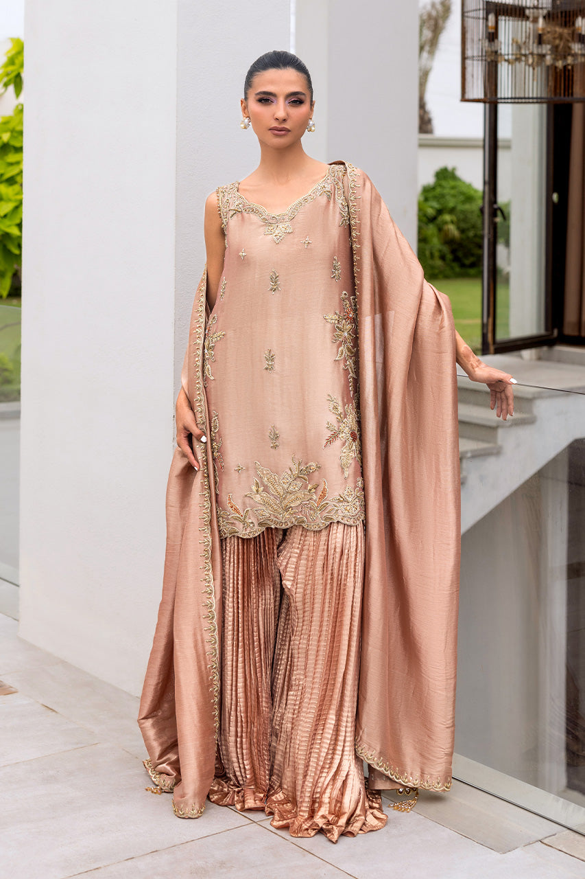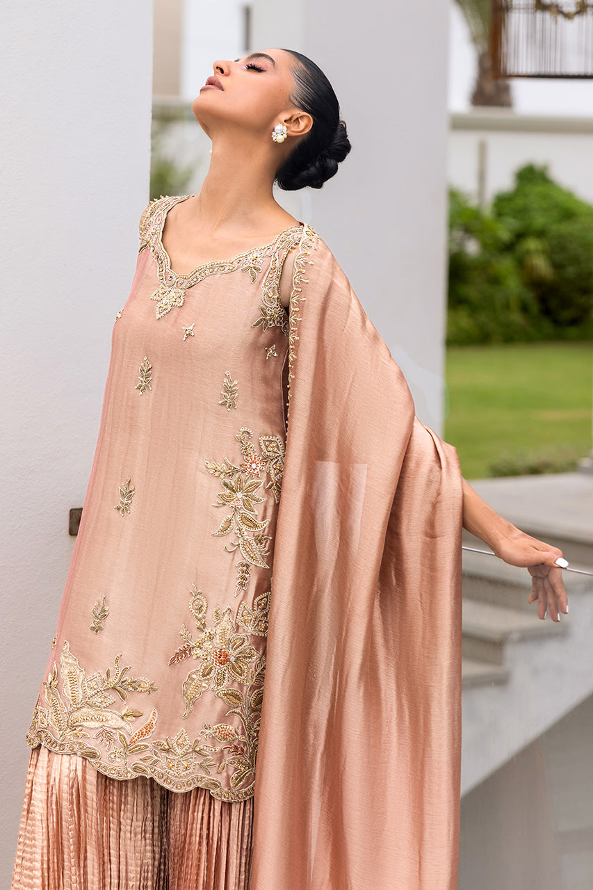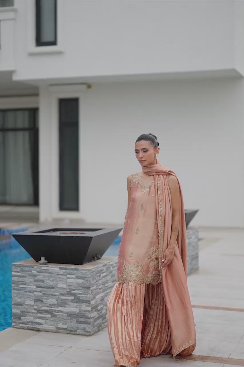 A graceful peach lame short shirt, exquisitely adorned with intricate embellished dori work for a refined yet contemporary appeal. The sleeveless design is elevated with delicate tassel detailing at the back, adding a touch of playful elegance. It is paired with a flowing crushed dhaka pants that creates a soft, romantic silhouette, along with a luxurious dum zari dupatta to complete the look. A chic ensemble that blends traditional craftsmanship with modern sophistication.