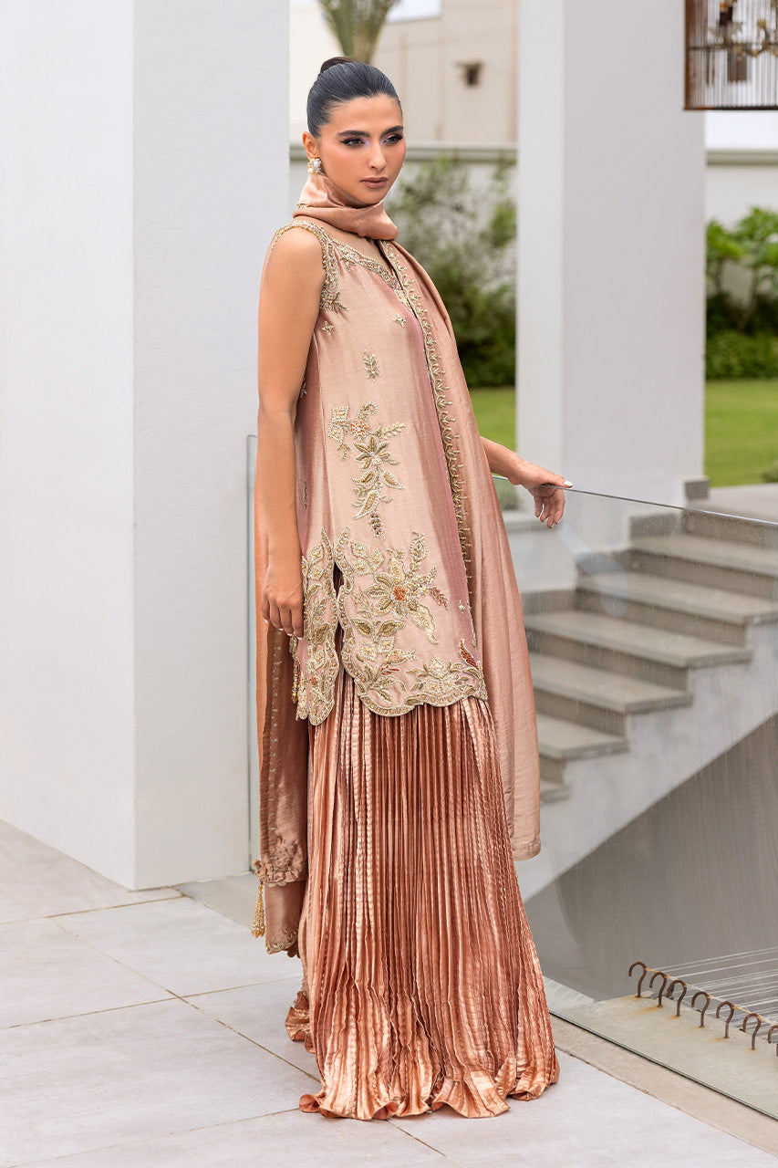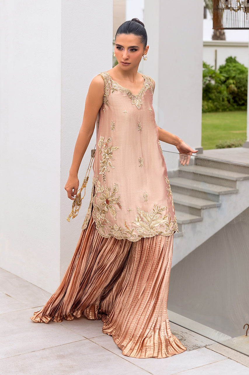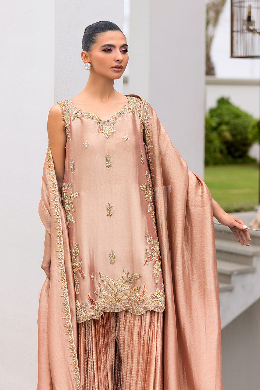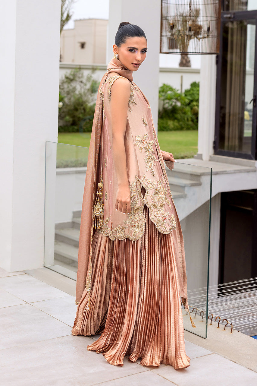 A graceful peach lame short shirt, exquisitely adorned with intricate embellished dori work for a refined yet contemporary appeal. The sleeveless design is elevated with delicate tassel detailing at the back, adding a touch of playful elegance. It is paired with a flowing crushed dhaka pants that creates a soft, romantic silhouette, along with a luxurious dum zari dupatta to complete the look. A chic ensemble that blends traditional craftsmanship with modern sophistication.