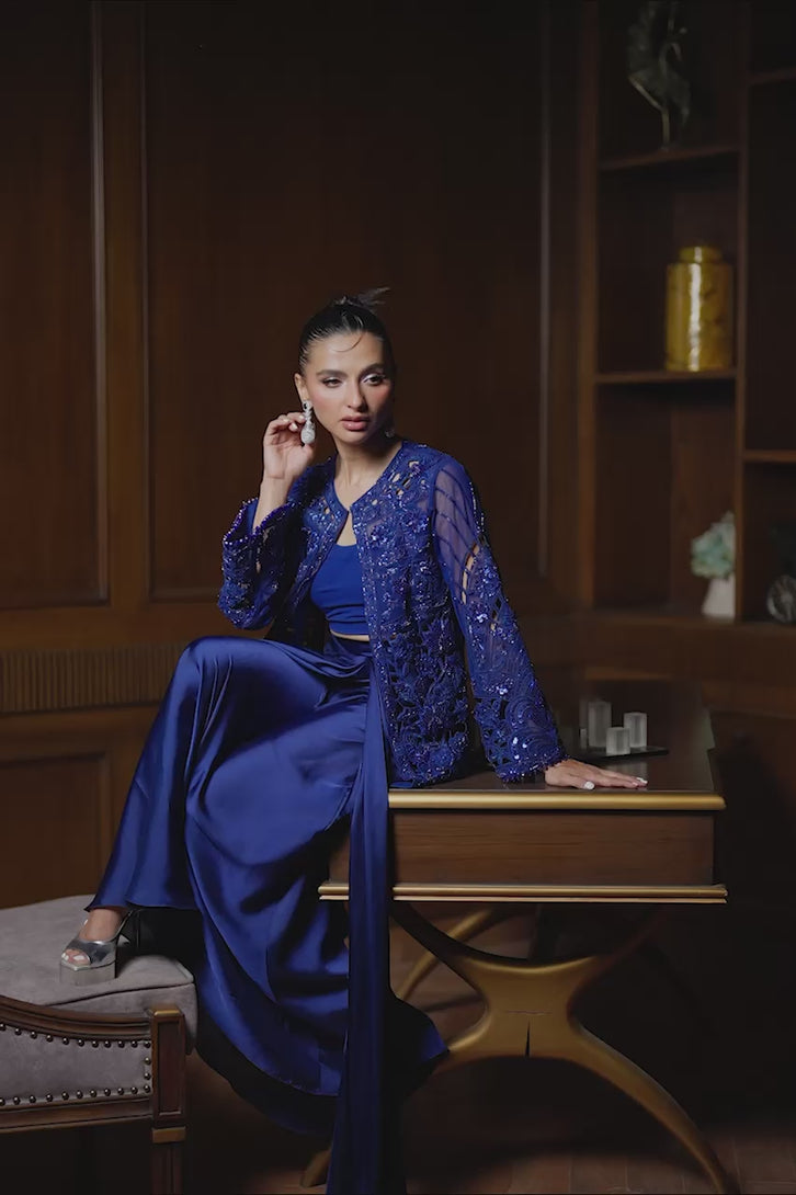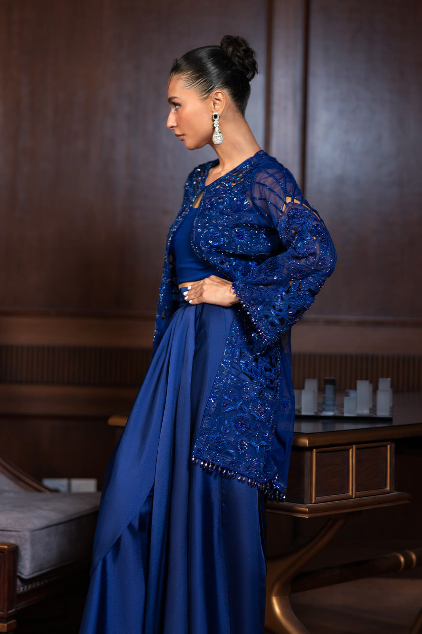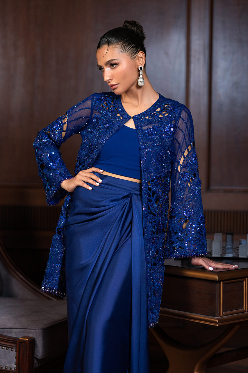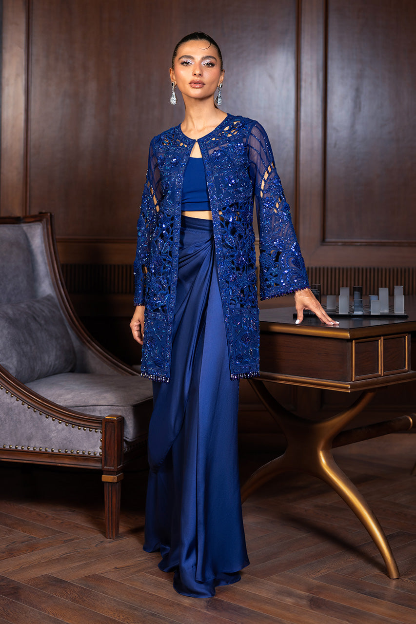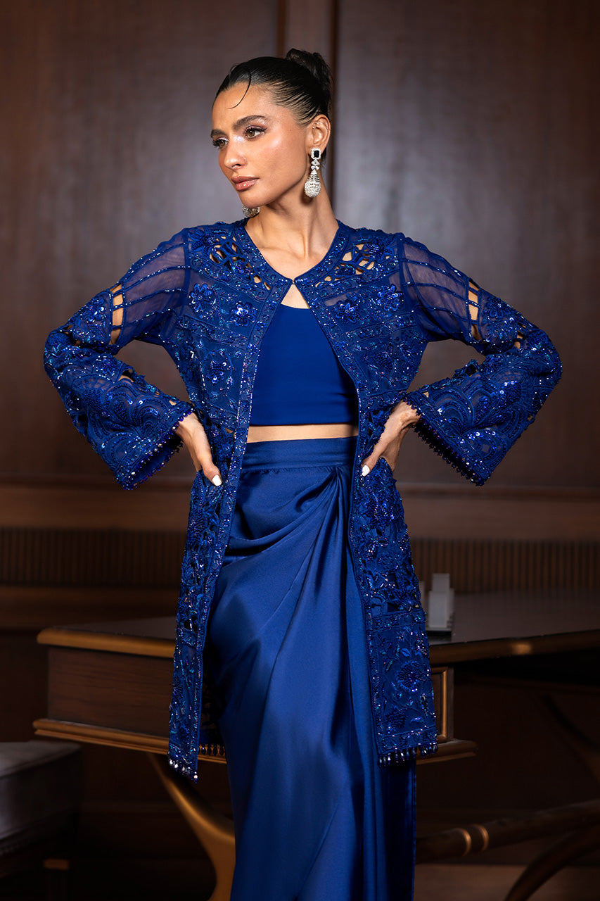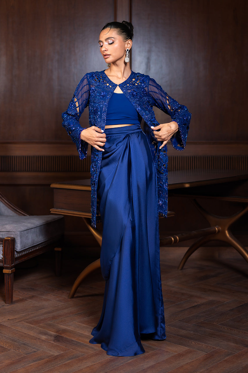 A statement-making ensemble featuring a delicately embroidered short french net jacket adorned with elegant tassel hangings, it strikes the perfect balance of modern chic and timeless craftsmanship. The look is completed with a flowing charmeuse silk draped skirt, cinched at the waist with a motif belt that enhances the silhouette with regal grace. An ensemble designed for contemporary sophistication with a hint of playful allure.