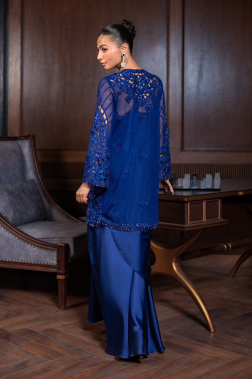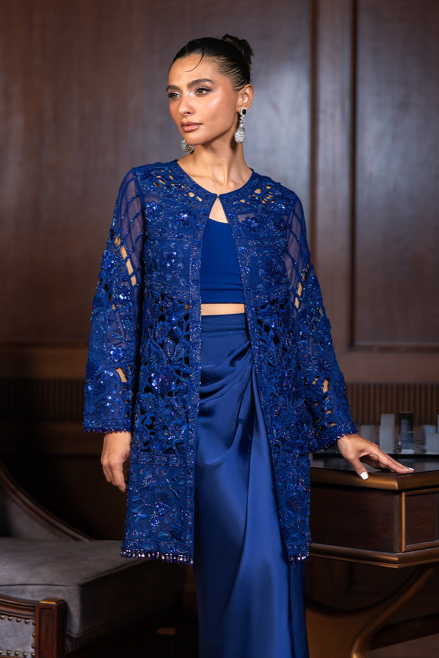 A statement-making ensemble featuring a delicately embroidered short french net jacket adorned with elegant tassel hangings, it strikes the perfect balance of modern...