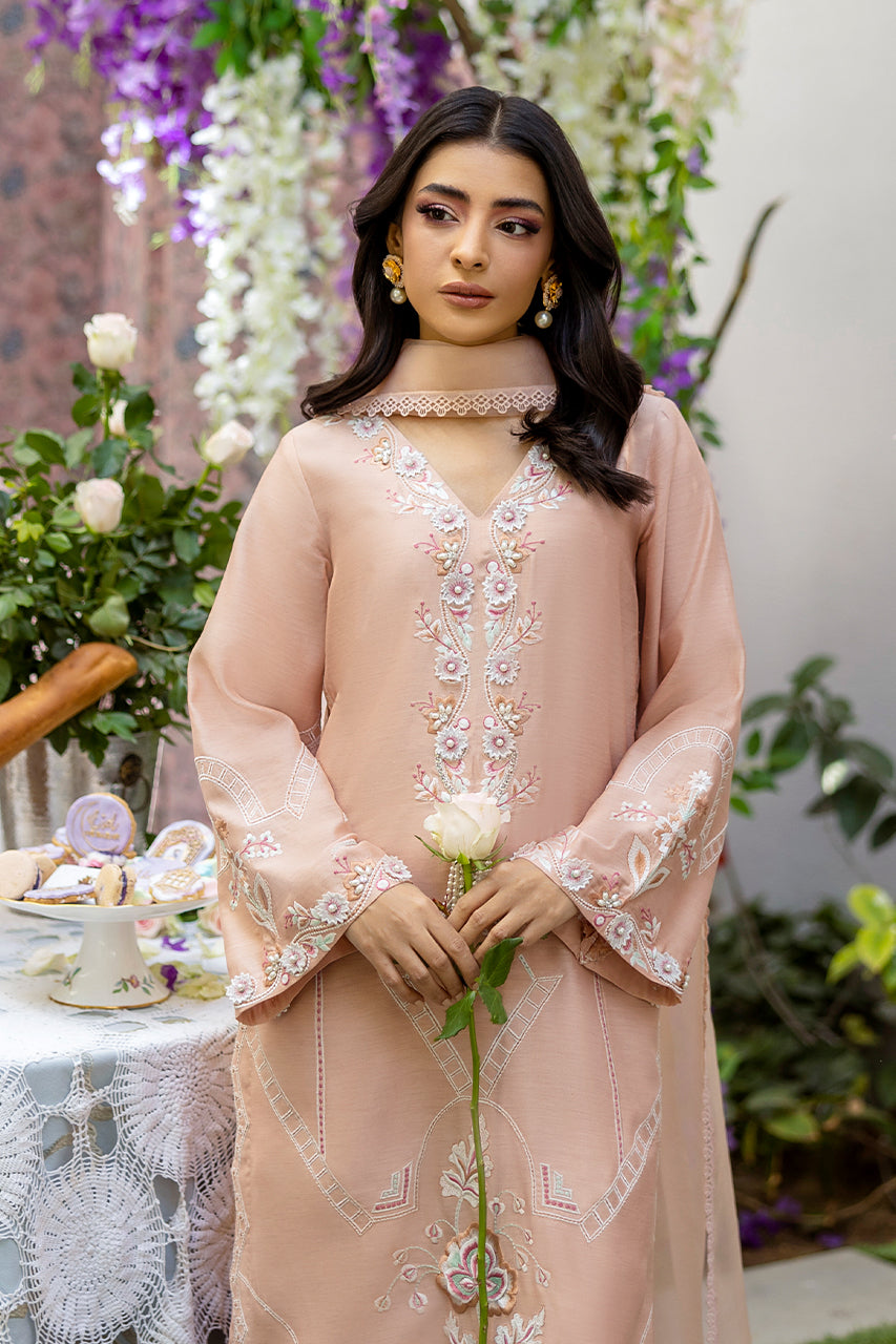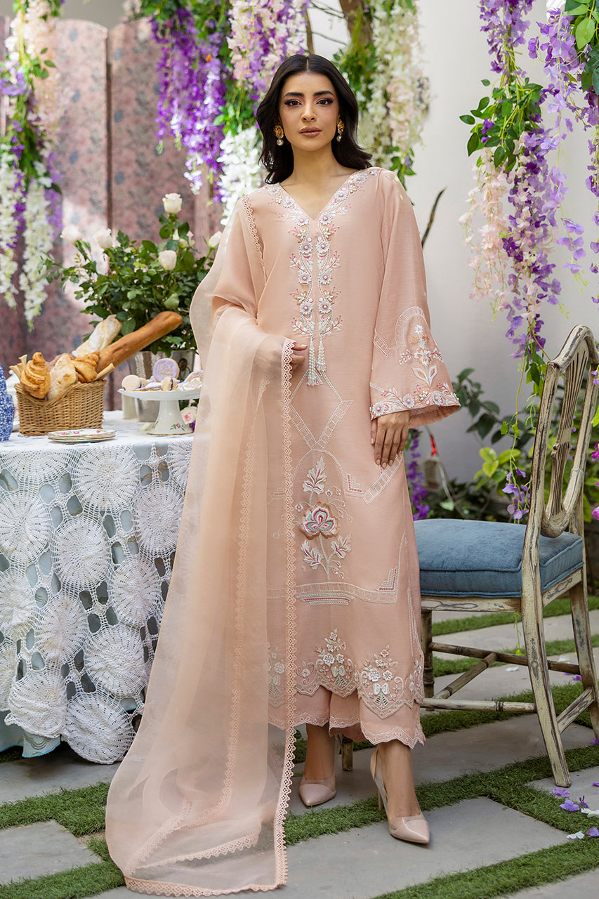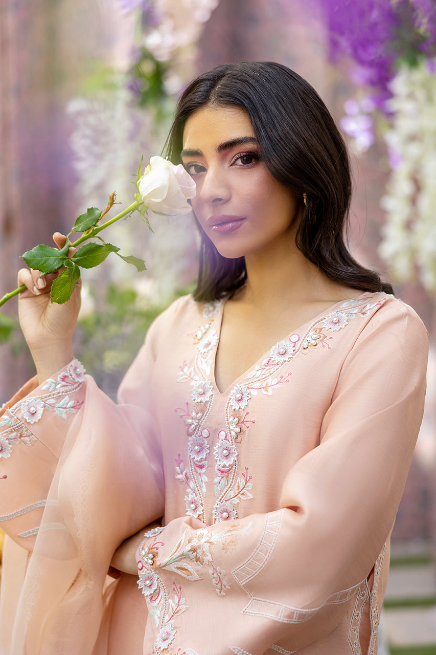 For a stunning summer look, opt for a Peach Pure Khaddi Silk long shirt featuring exquisite heavy embroidery on the neckline and throughout...