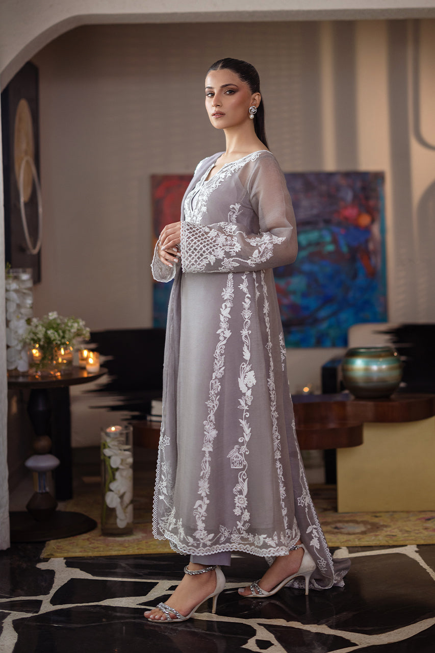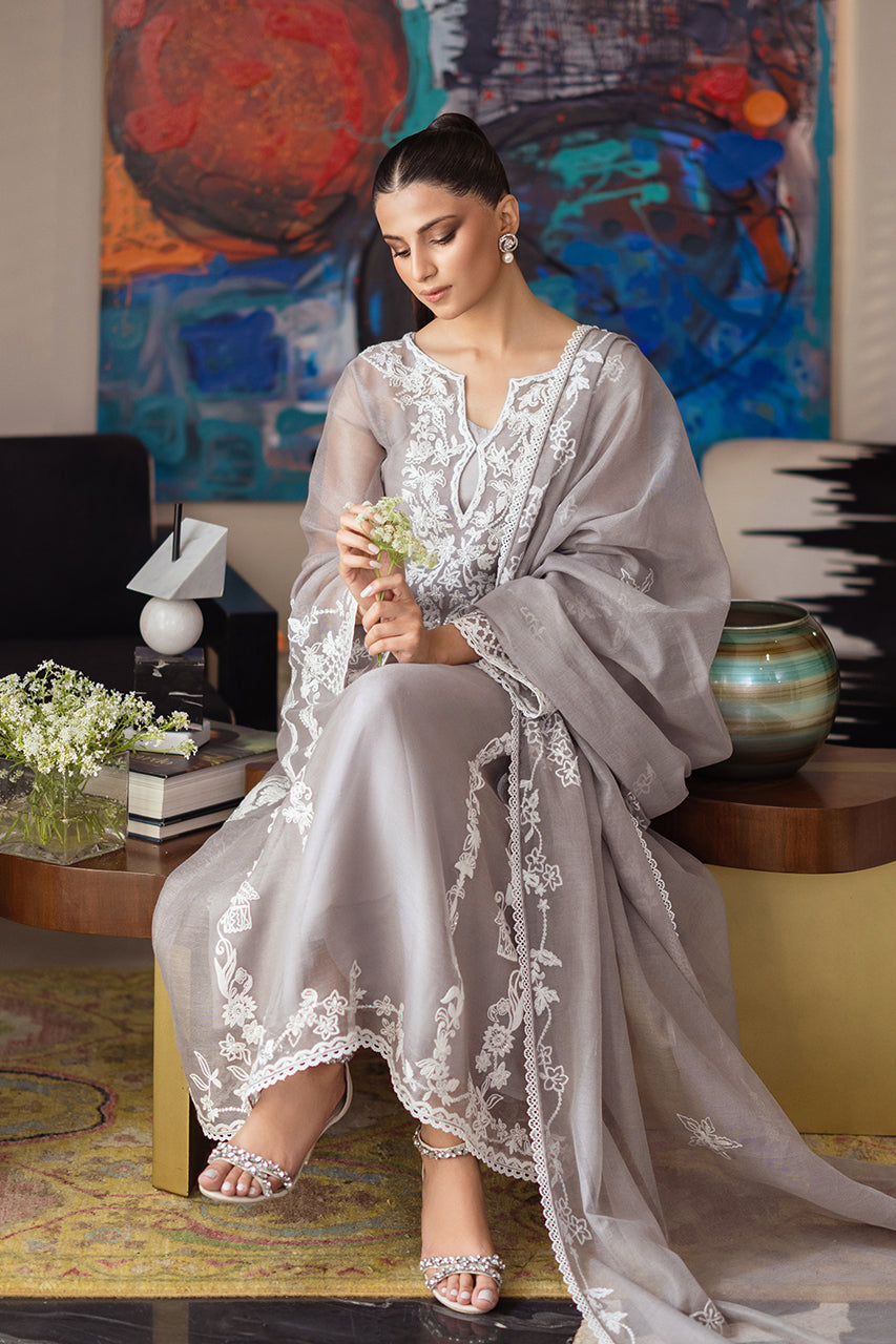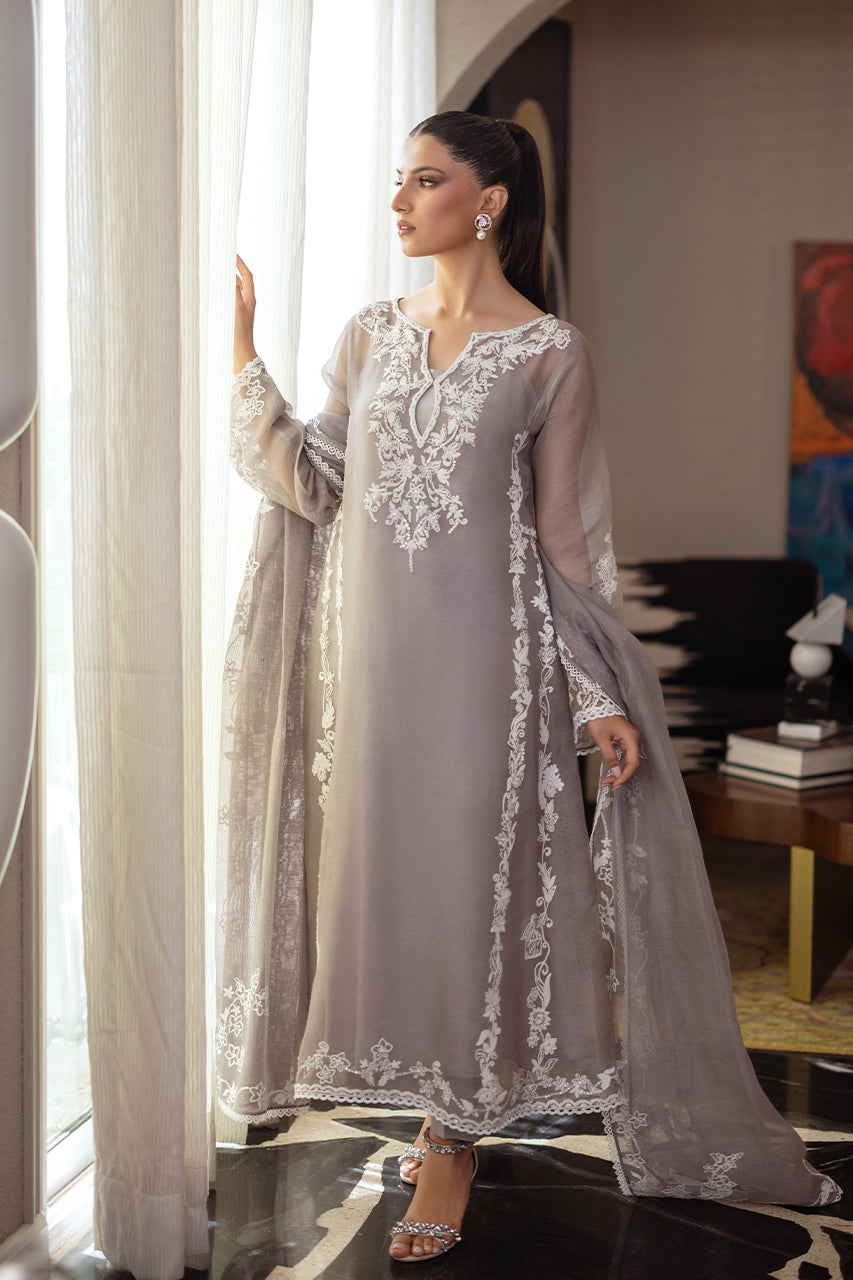 Elysia features a pure cotton net long shirt rendered in a beautiful grey tone. It is enhanced with ARI embroidery and hand work on the neckline, sleeves, and borders along with lacework. It is paired with a pure cotton net dupatta with floral embroidery all over and coordinating grey pants to complete the look ethereally!