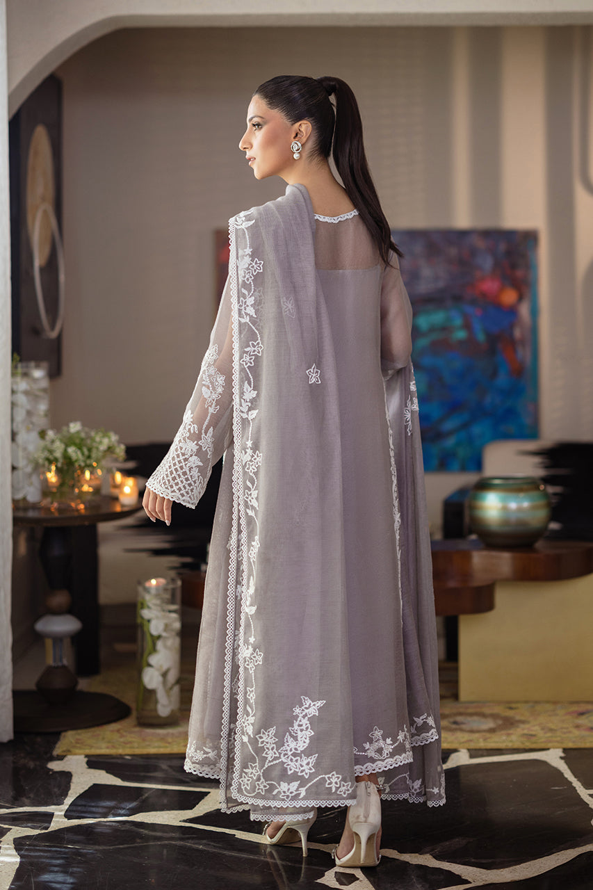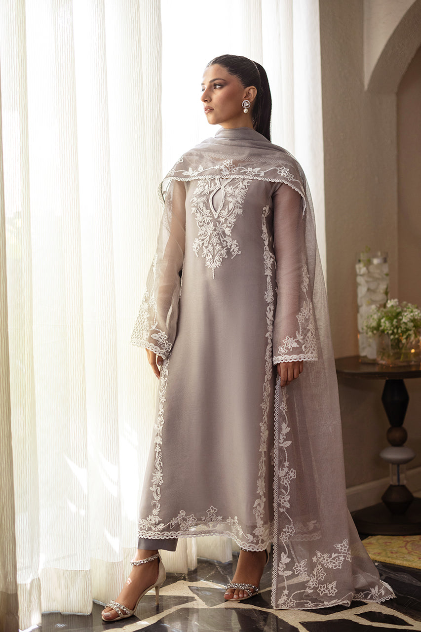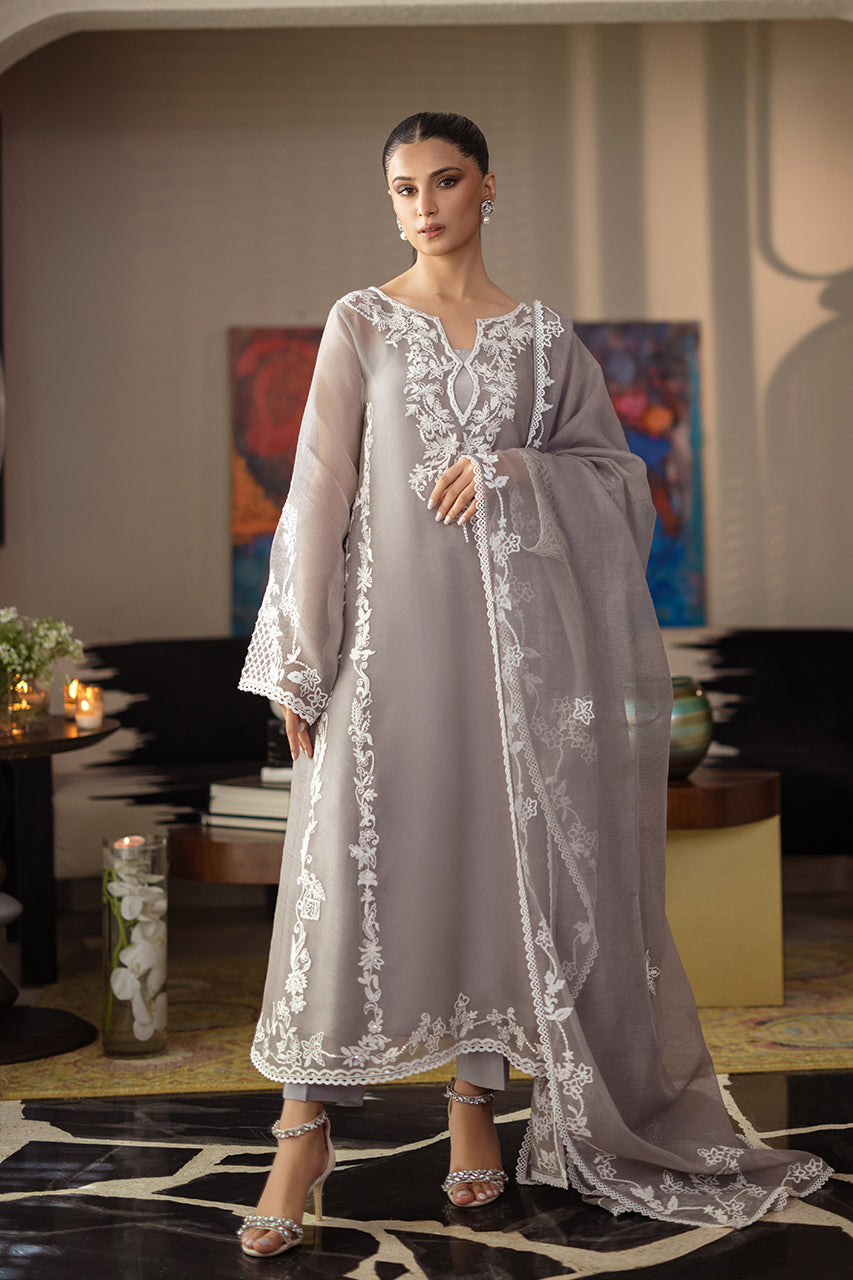 Elysia features a pure cotton net long shirt rendered in a beautiful grey tone. It is enhanced with ARI embroidery and hand work on the neckline, sleeves, and borders along with lacework. It is paired with a pure cotton net dupatta with floral embroidery all over and coordinating grey pants to complete the look ethereally!