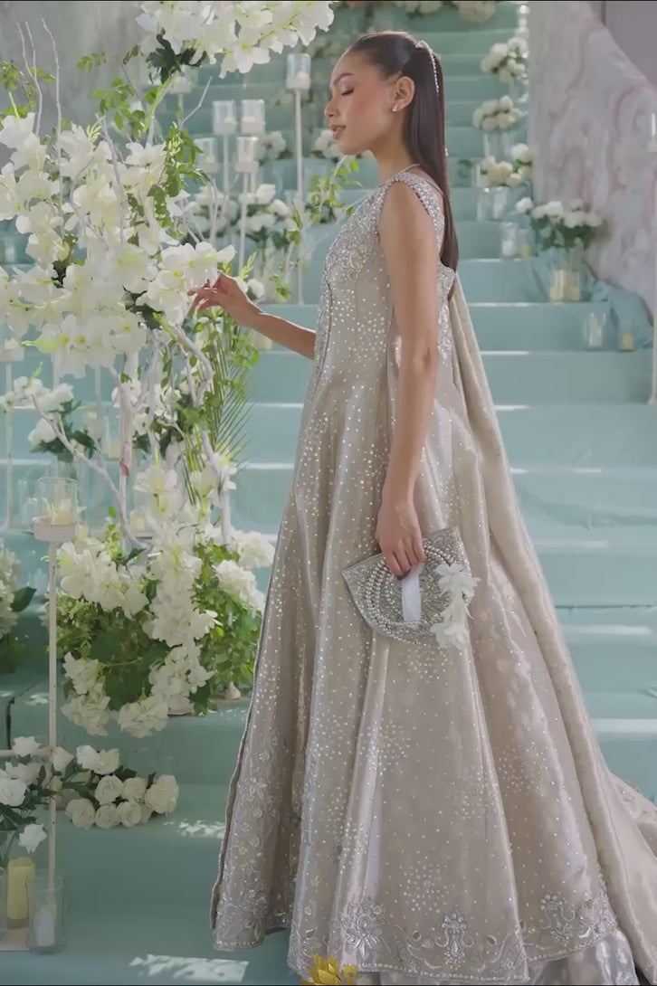 This graceful formal gown is crafted in soft silver-toned Lame fabric, designed to create a sophisticated and feminine silhouette. The gown features intricate hand embroidery and delicate embellishments that shimmer subtly, adding depth and texture to the ensemble.
