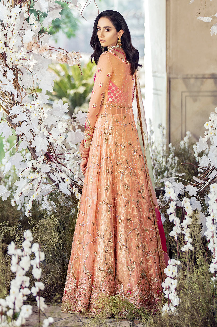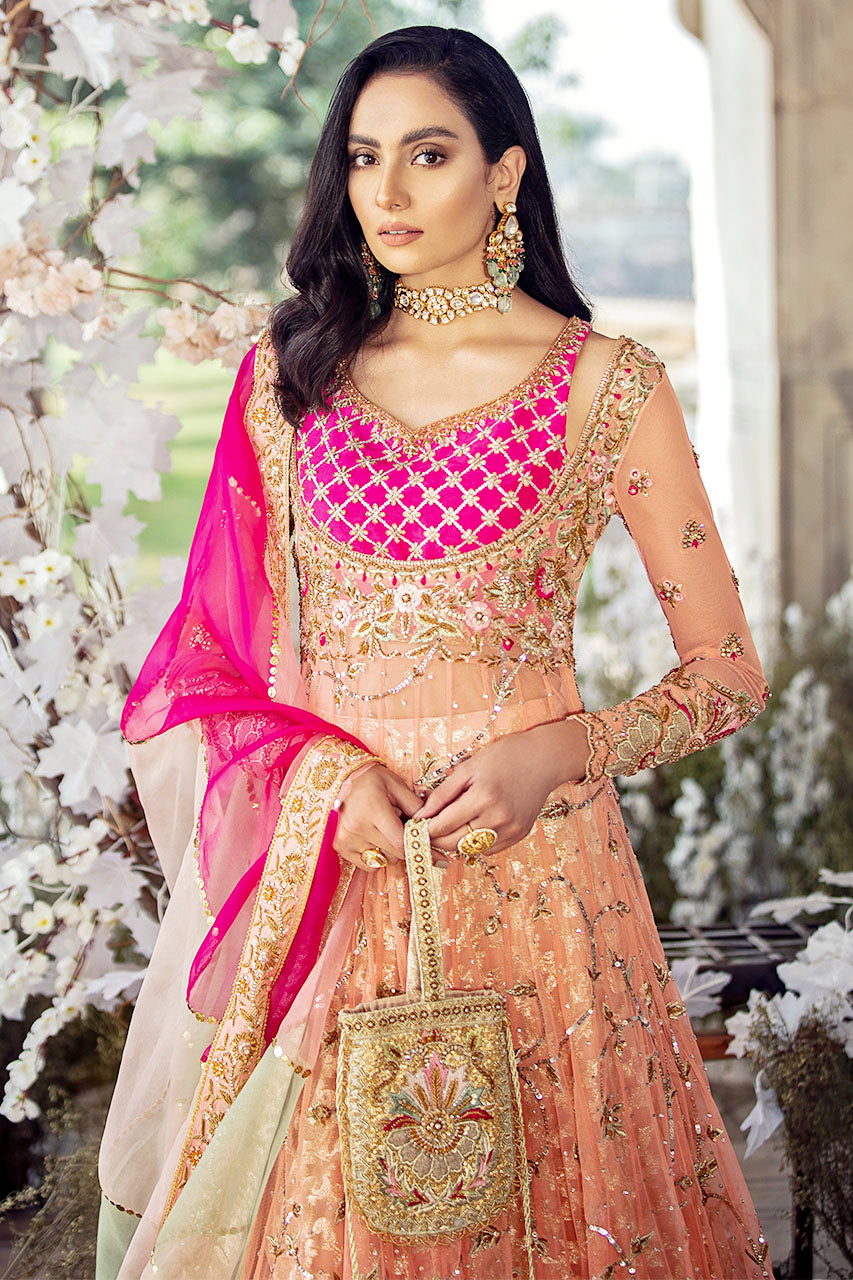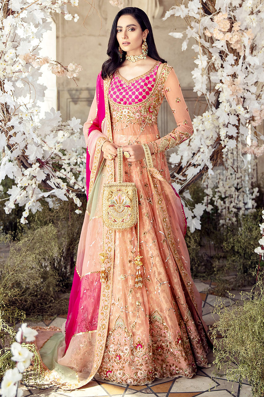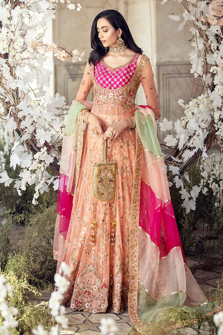 Exude effortless elegance in any festive occasion in this beautifully crafted kalidaar. Cut in a soft shade of coral, this kaliddar peshwas is adorned with gold zardozi, maal, and Resham work. The choli inside is made on pure raw silk and adorned with a zardozi check pattern. Pair it with a carefully crafted organza chart Patti dupatta that is further enhanced with kamdani embellishments. The Lehnga is made in forex print that gives a printed effect under the embroidered fabric.