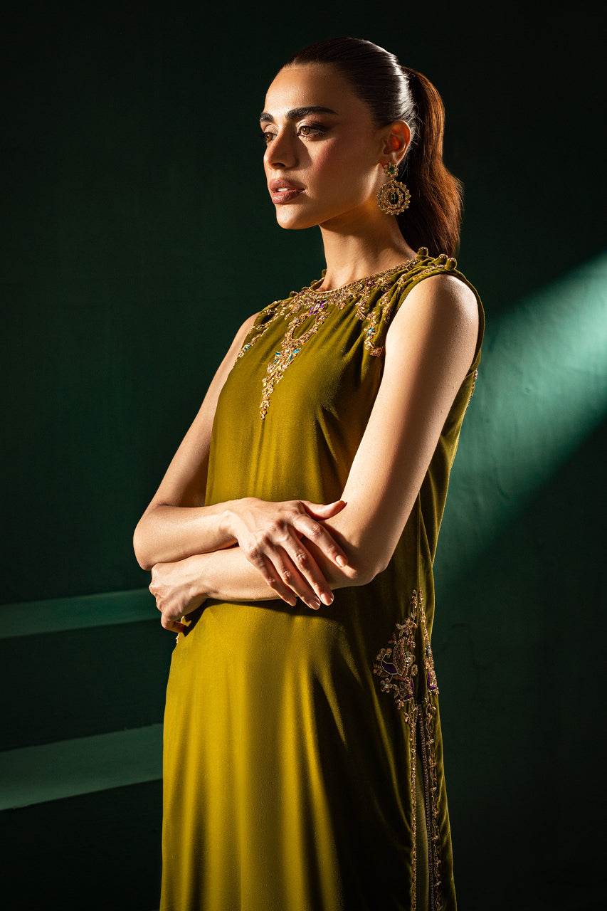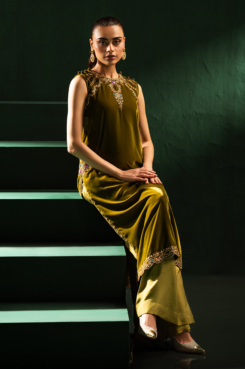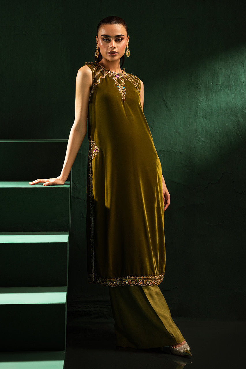 This exquisite olive green knee-length velvet shirt is adorned with intricately hand worked neckline and daman with dabka, naqshi, sequins and crystals. Back...