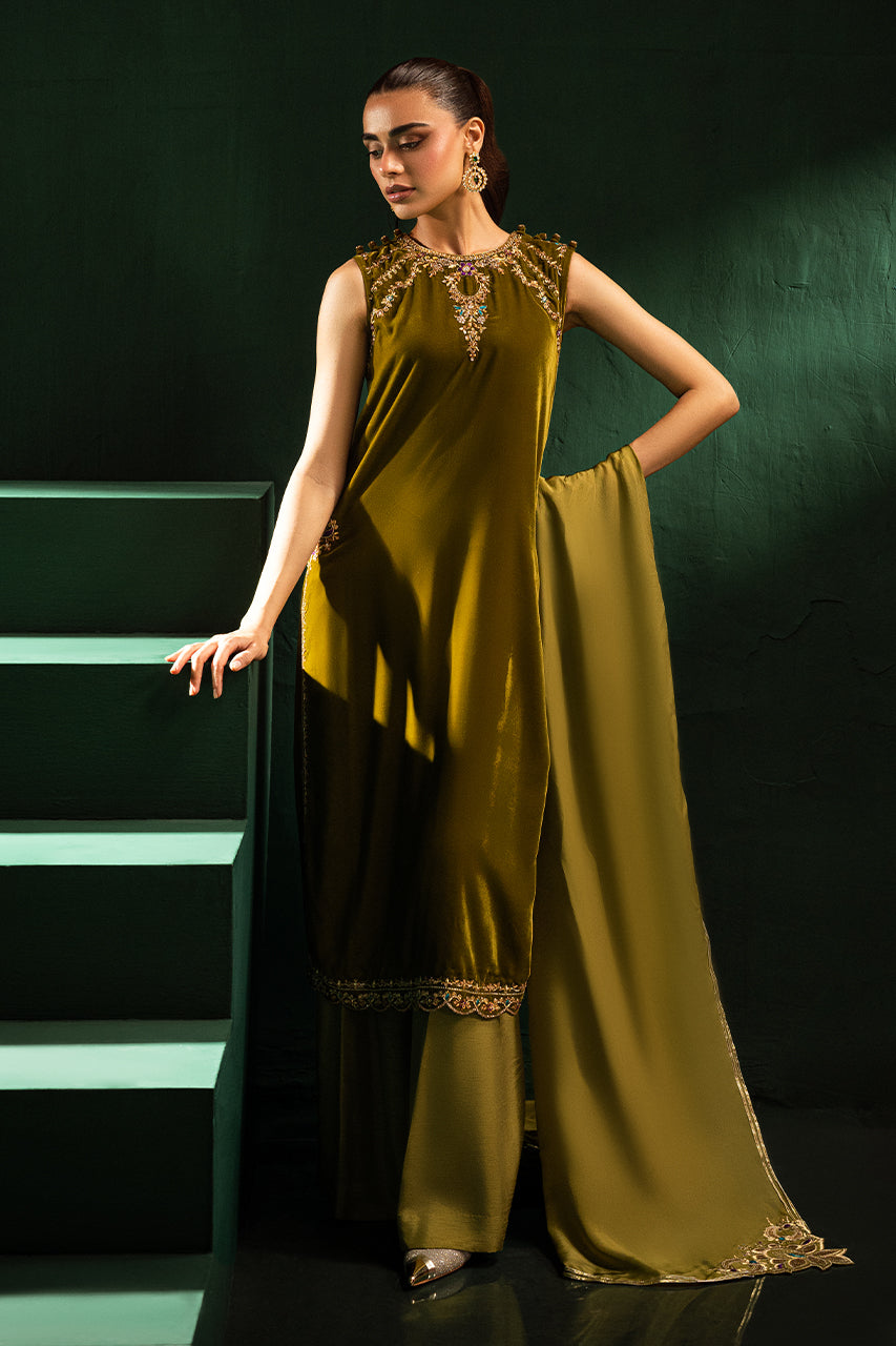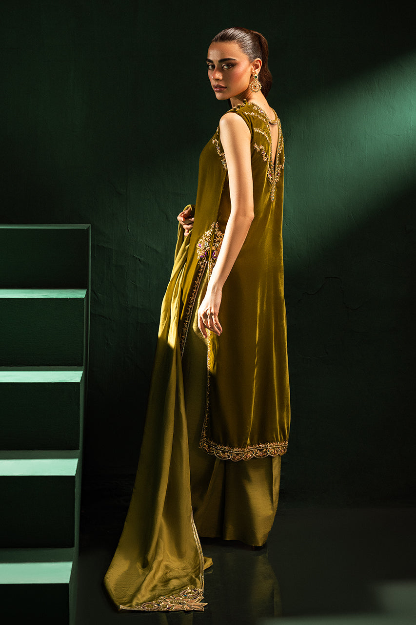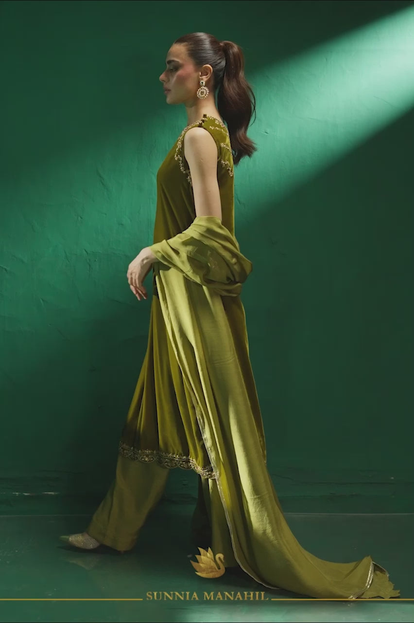 This exquisite olive green knee-length velvet shirt is adorned with intricately hand worked neckline and daman with dabka, naqshi, sequins and crystals. Back of the shirt is heavily embellished with a chic v-line cut to stylise the outfit. Pair it with a medium silk dupatta with hand worked floral corner patterns and complimenting Silk Izar pants, to stand out with grace and timeless beauty.