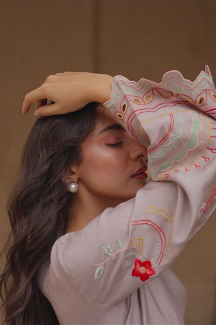 Witness the harmony of allure and sophistication with this mesmerising ash grey outfit crated on a khadi silk base while the unique handworked embroidery and scalloped finishing uplifts the look ethereally. Paired with coordinating embroidered pants, Ash is sure to enchant at every turn!