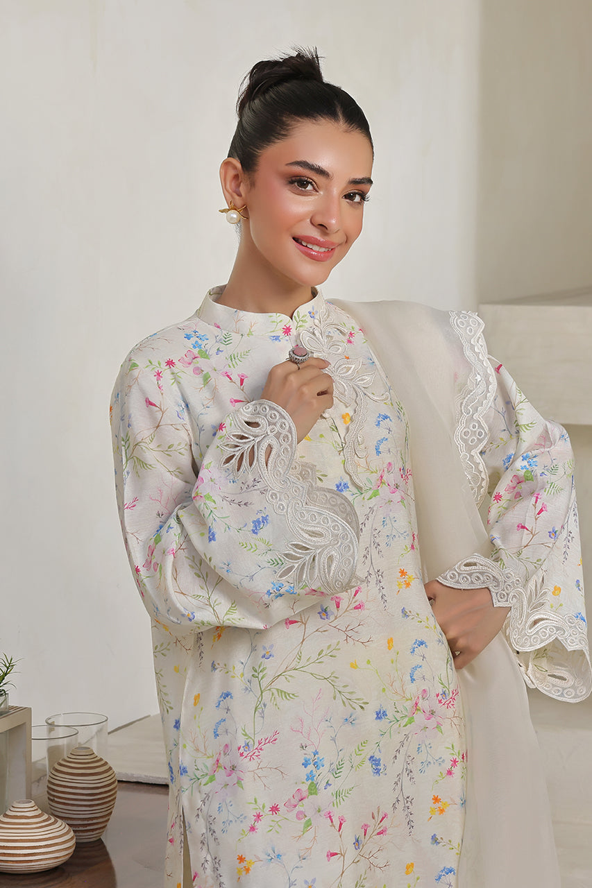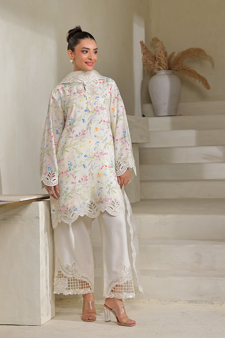 Embrace timeless grace with this ethereal three-piece ensemble, featuring a short white kora digital knee-length shirt adorned with delicate appliqué thread work on the neckline and sleeves. It is paired with a sheer white organza dupatta, beautifully finished with intricate lace work all over, adding a touch of refined elegance. The look is completed with khaddi cotton izaar pants, enhanced with exquisite embroidery that adds charm and detail to the silhouette—perfect for serene daytime events or sophisticated festive gatherings.
