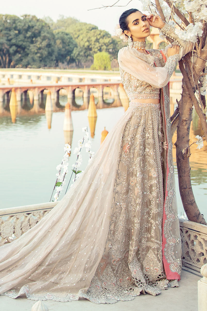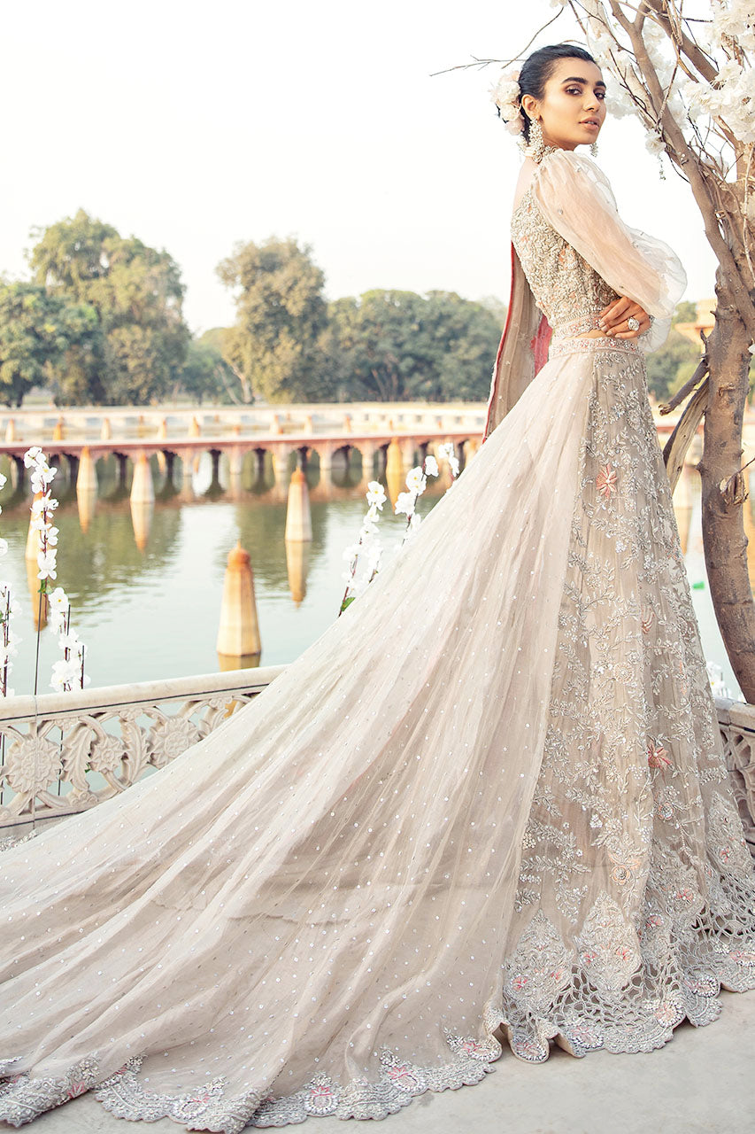 The silver tissue shirt is adorned with heavily embellished handwork on the bodice and panels. Beautiful cutwork is added on the borders and sleeves to add an element of grandiose. Dupatta is crafted on matching tissue fabric and complemented with contrasting finishing. Add pants to complete this unforgettable look.