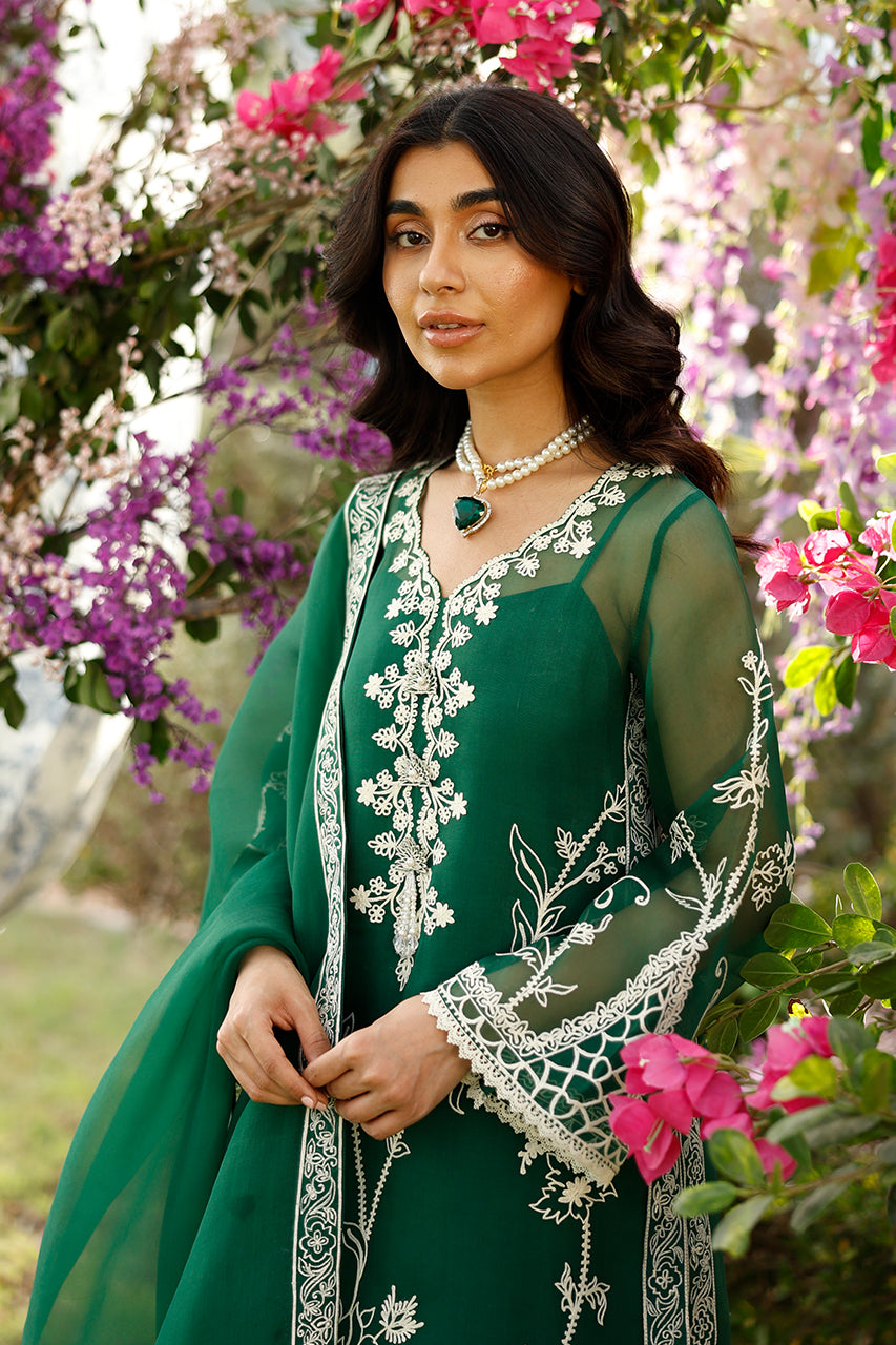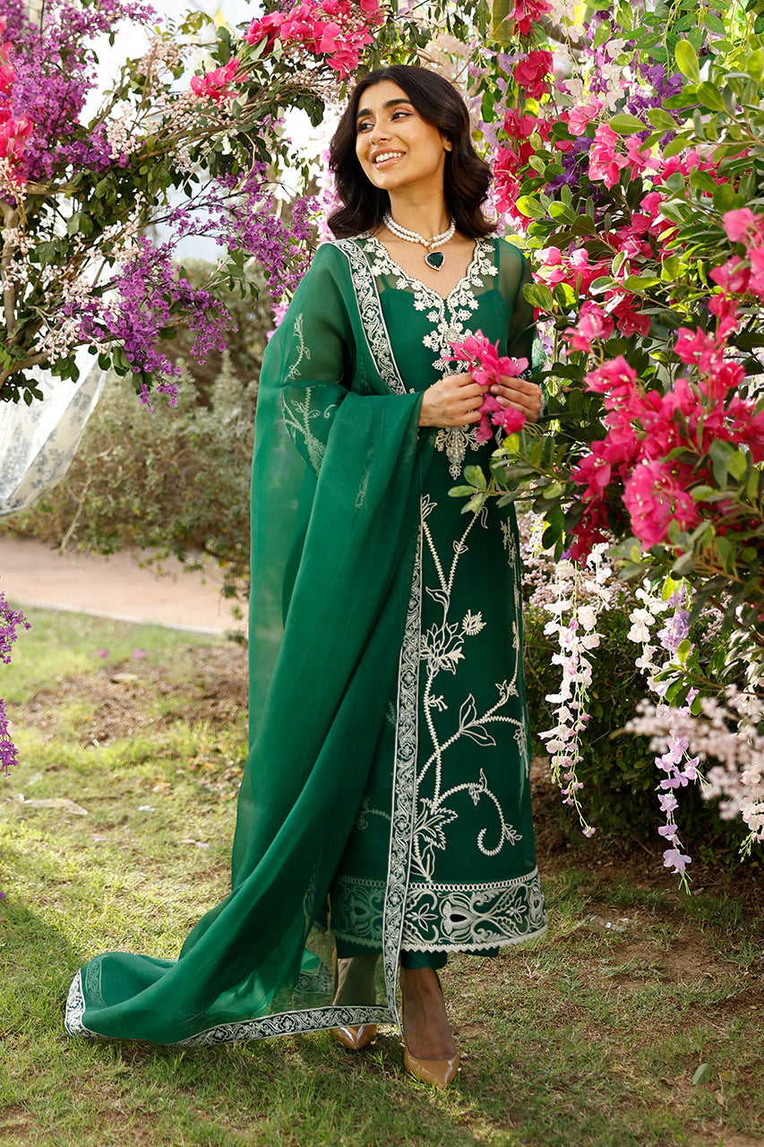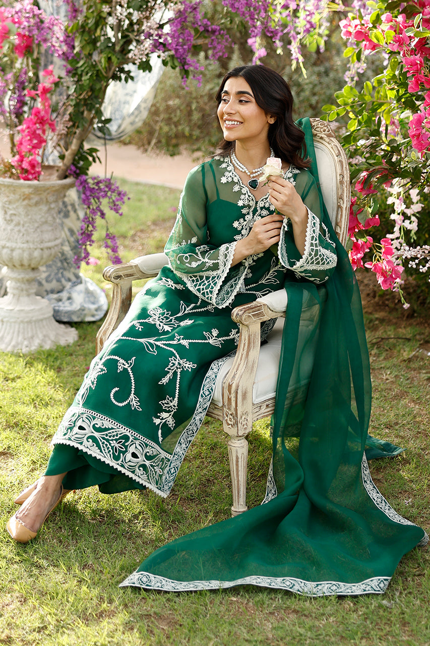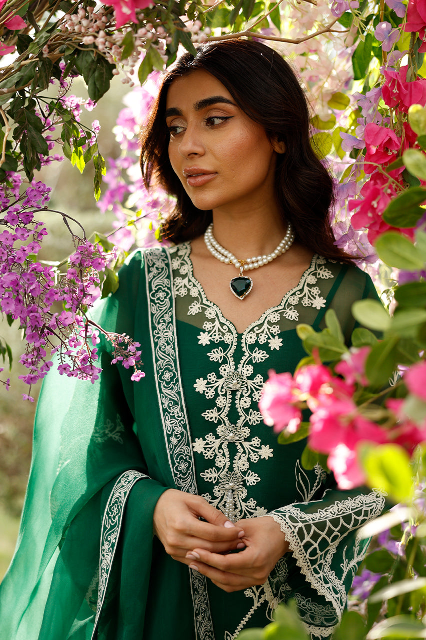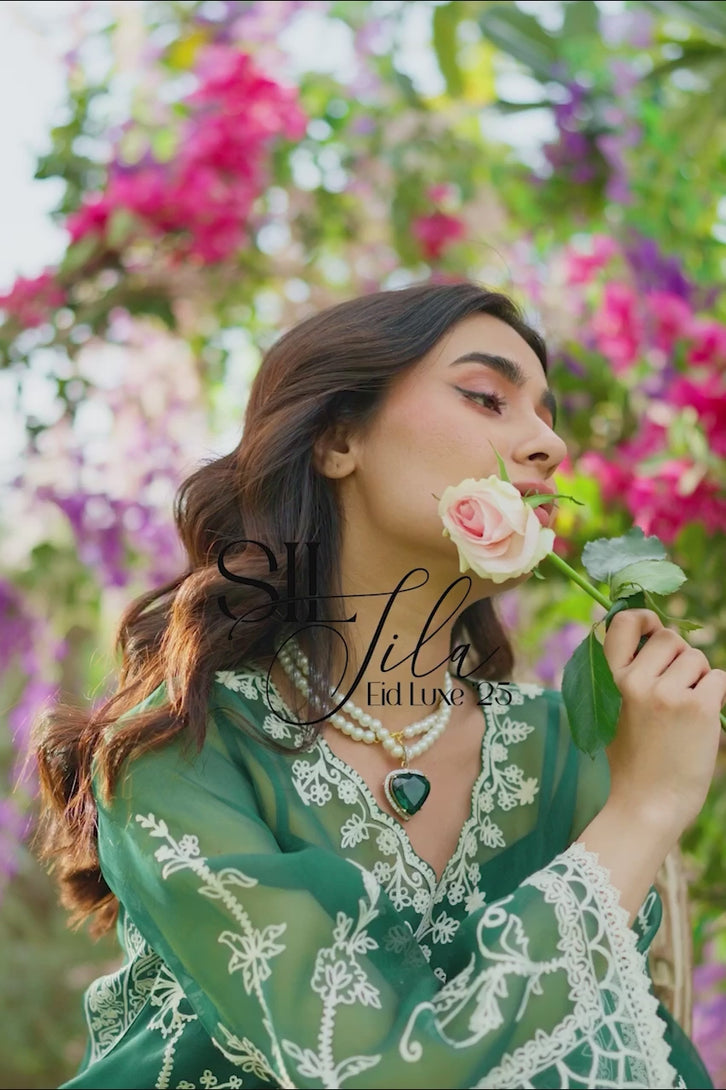 This elegant Forest Green ensemble features a long Kattan Organza shirt with beautiful Ari embroidery on the neckline and throughout the fabric. Paired with khaddi silk tulip culottes, the outfit flatters the figure with a smooth fit. A matching organza dupatta with detailed borders adds the perfect finishing touch.