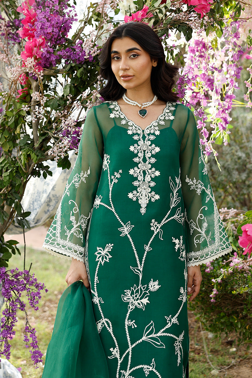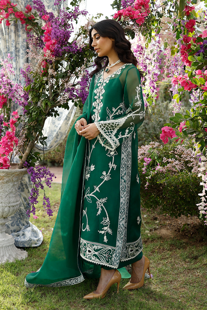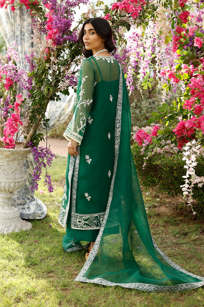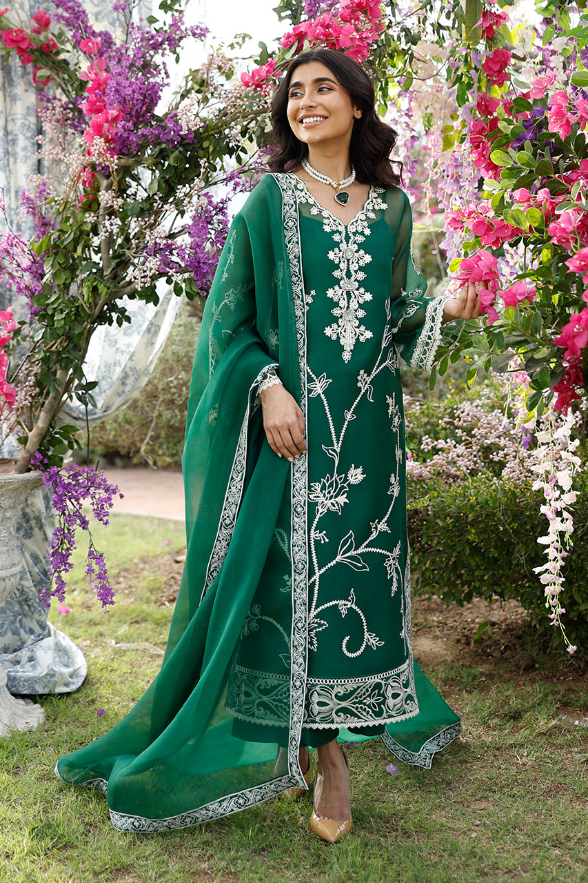 This elegant Forest Green ensemble features a long Kattan Organza shirt with beautiful Ari embroidery on the neckline and throughout the fabric. Paired with khaddi silk tulip culottes, the outfit flatters the figure with a smooth fit. A matching organza dupatta with detailed borders adds the perfect finishing touch.