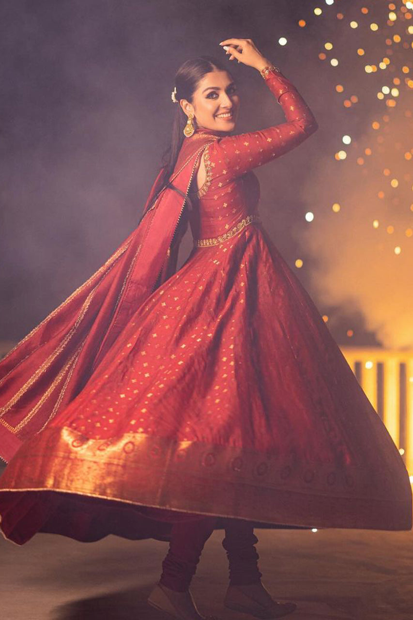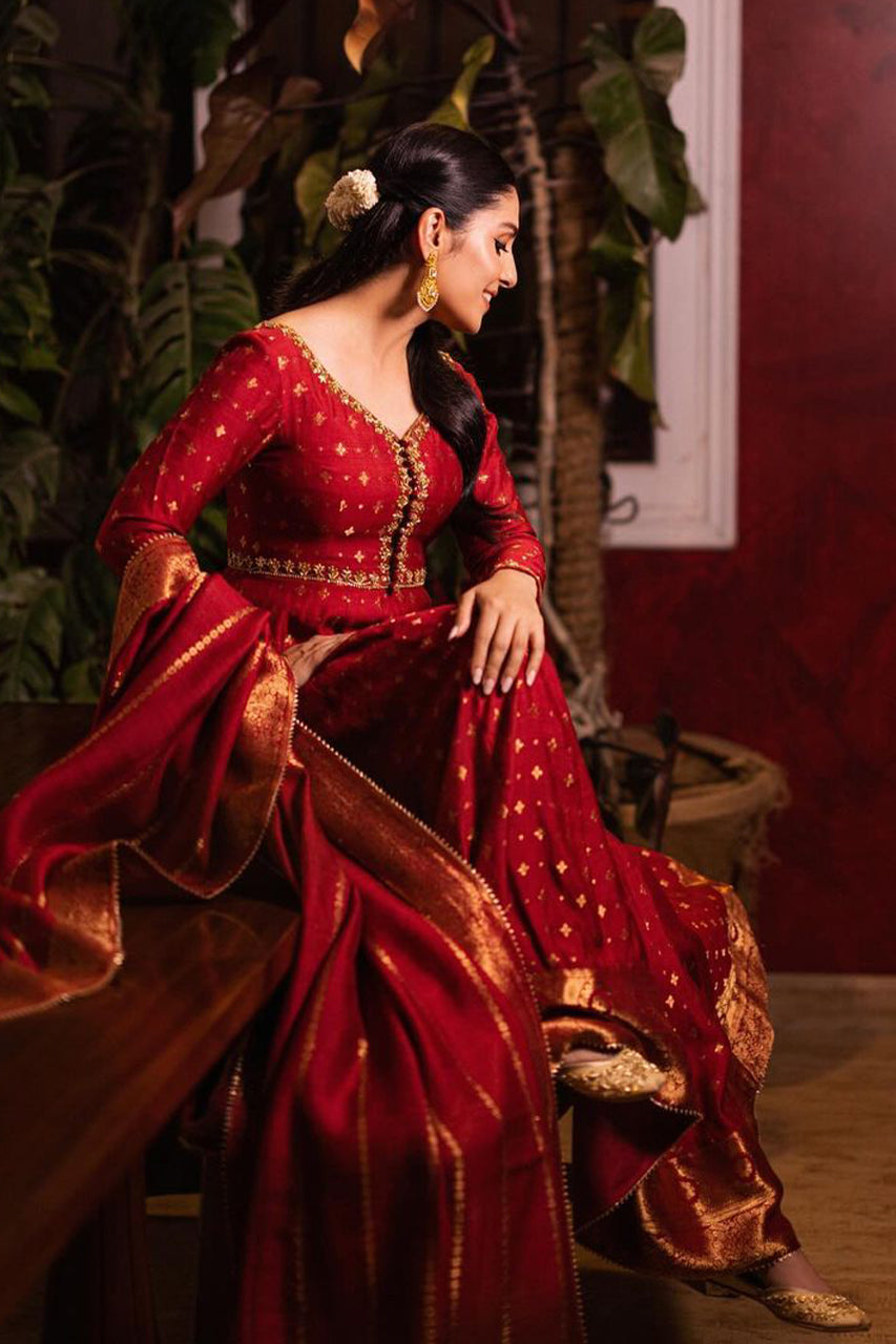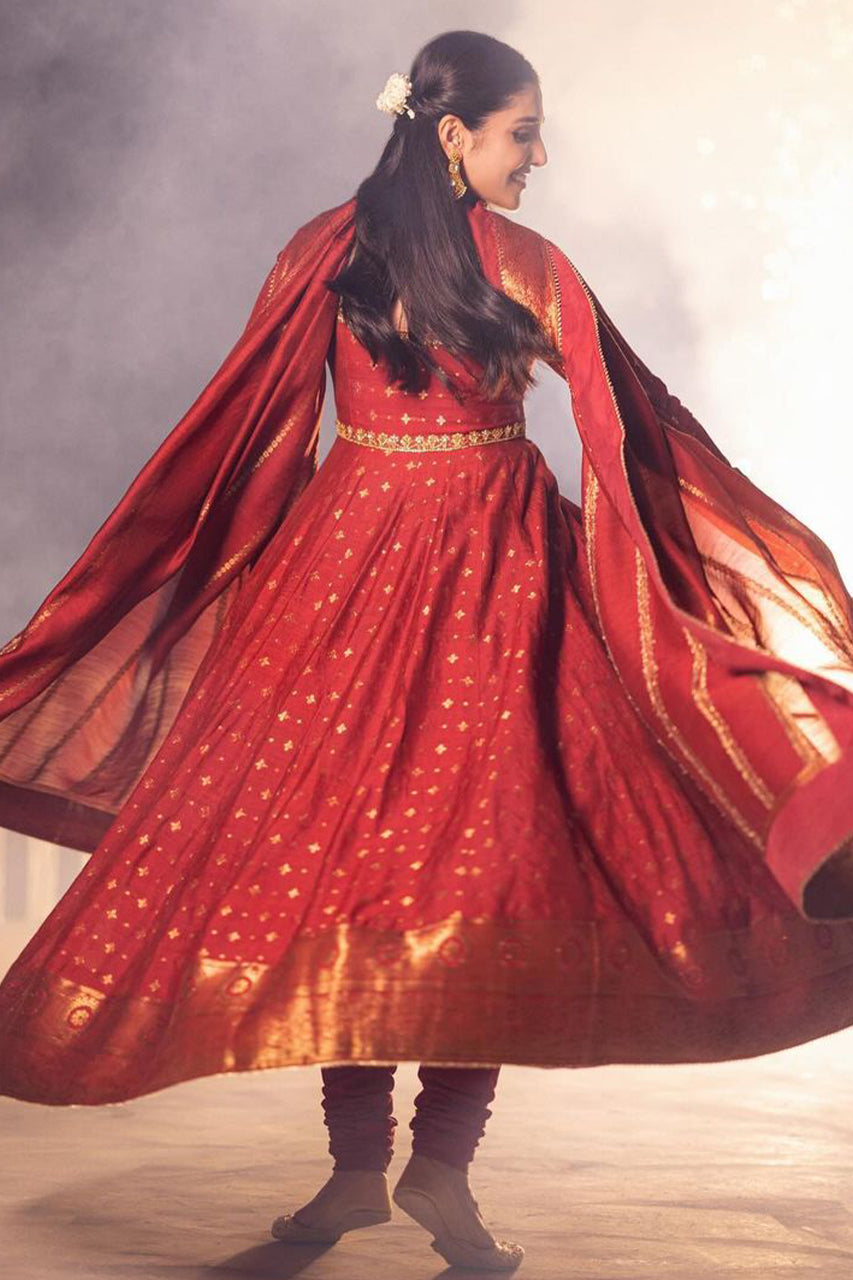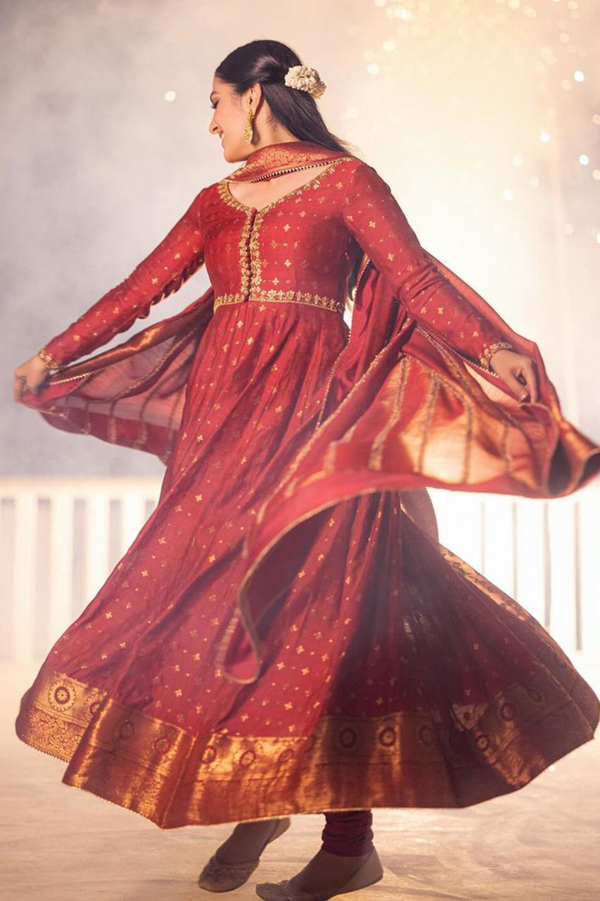 Maroon long gown with full sleeves that has embellished neckline and boties all over the gown. Along with it maroon duppatta with lace work and sequence all over it. Paired with churidar pants.