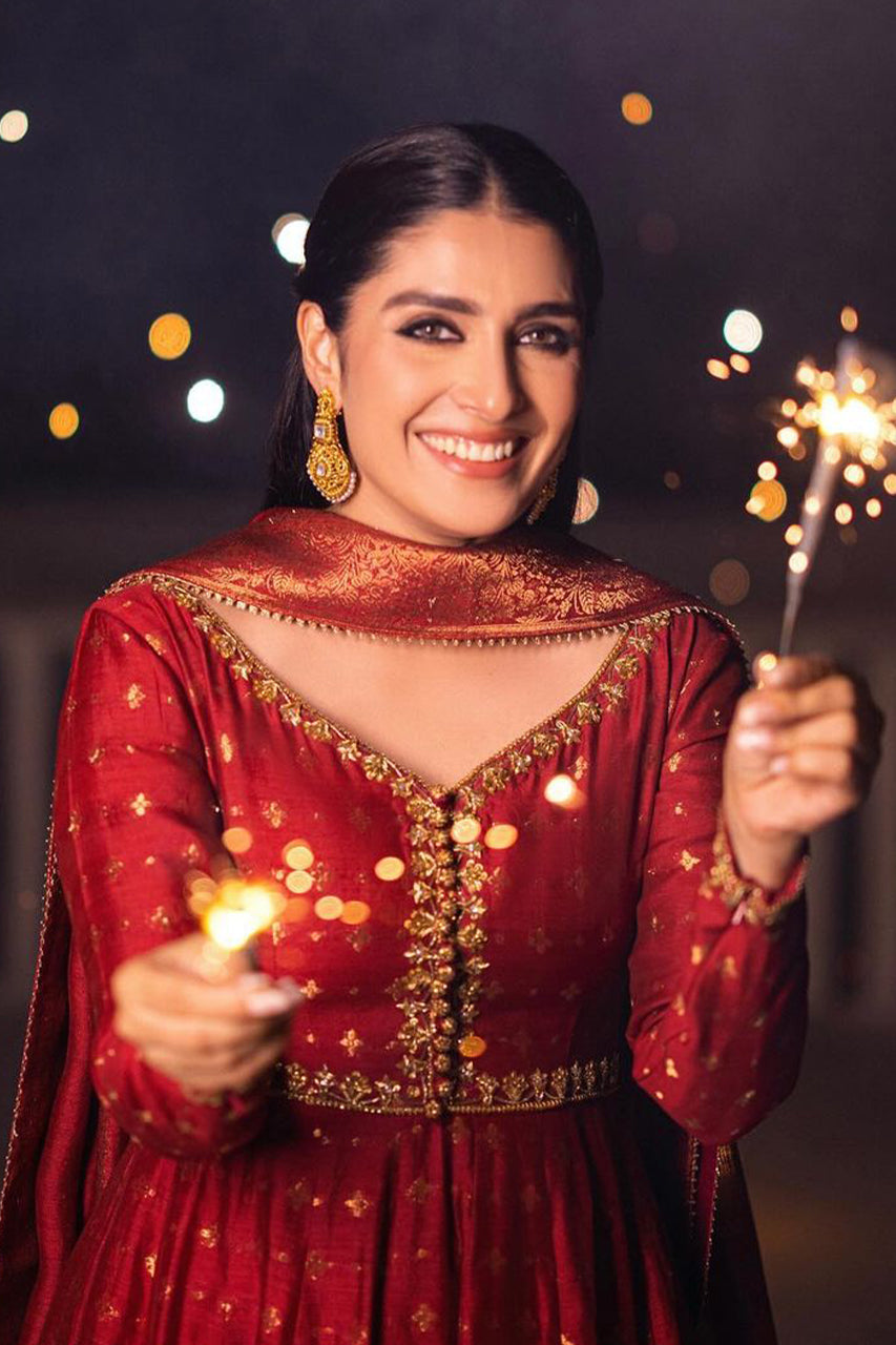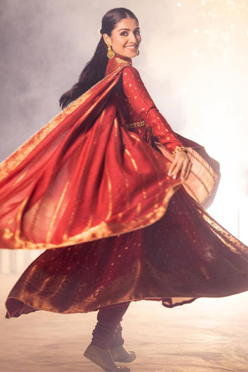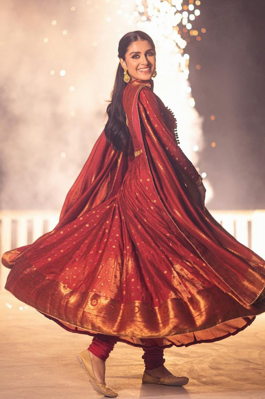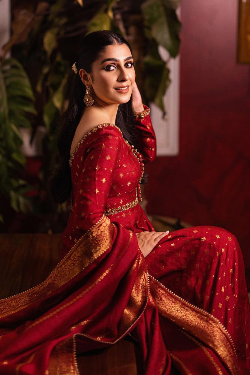 Maroon long gown with full sleeves that has embellished neckline and boties all over the gown. Along with it maroon duppatta with lace work and sequence all over it. Paired with churidar pants.