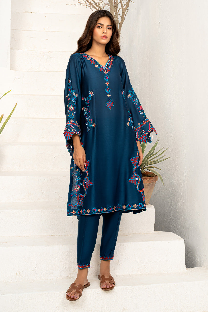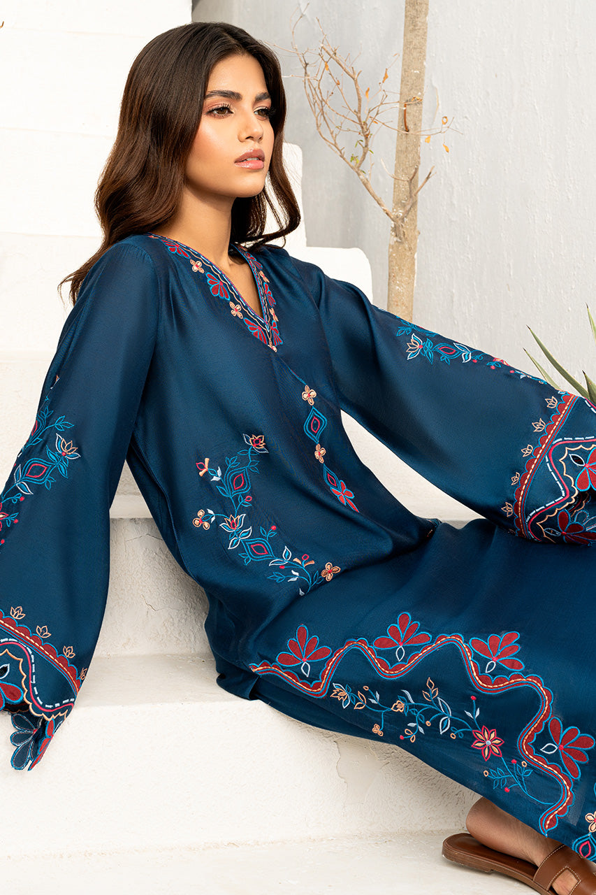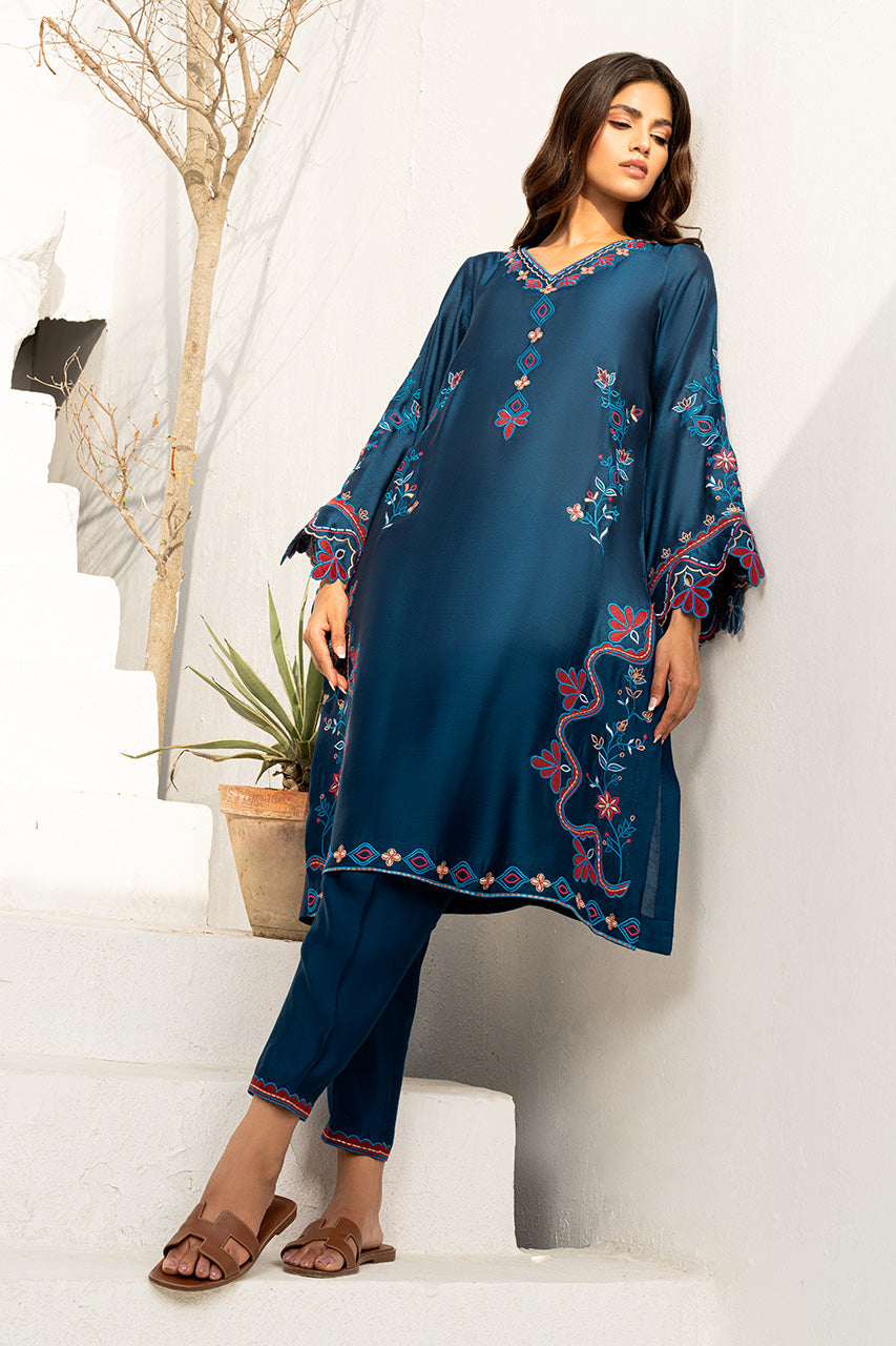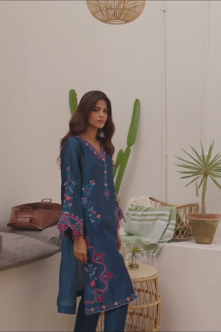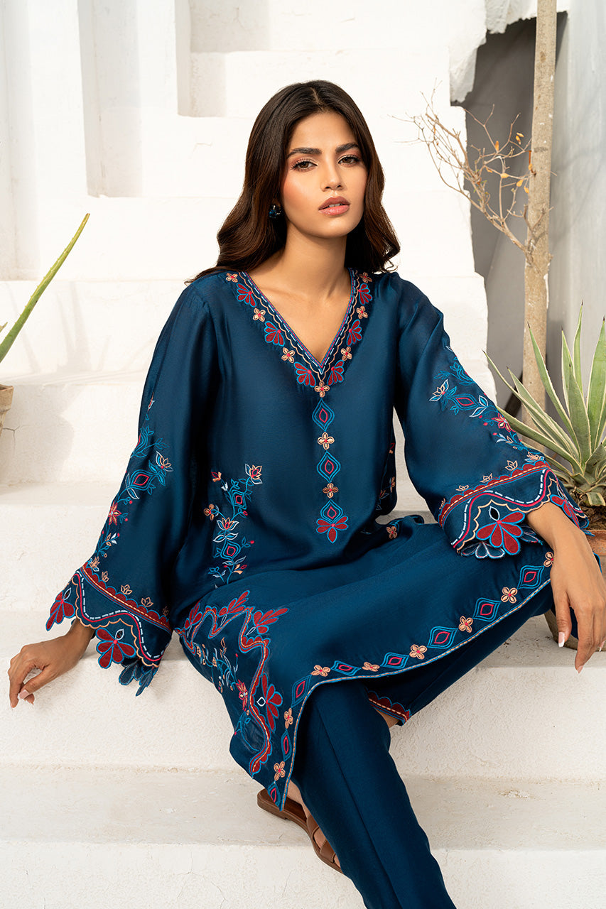 With a breathtaking play of multicolored embroideries dancing across the rich blue khaddi silk base, this knee-length shirt is a visual delight. The intricate threadwork creates a stunning contrast, while the unique scalloped finish with applique work on the sleeves and daman adds an elegant touch. Paired along is a beautifully finished straight trouser with embroidered and appliqued hems, completing the look effortlessly.
