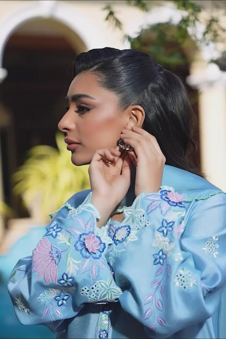 Designed in a long, flowy kaftan silhouette, this aqua blue outfit is crafted from Masoori Silk, offering an effortlessly elegant look.The shirt is adorned with vibrant floral embroidery, intricate trellis patterns, delicate appliqués and 3D bunches for added depth and texture. Soft, airy movement enhances the kaftan’s fluid drape, making it both comfortable and statement-worthy. Pair it with a two tone pure organza dupatta with scalloped borders and matching Masoori silk pants to finish the look.