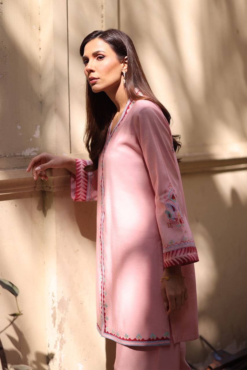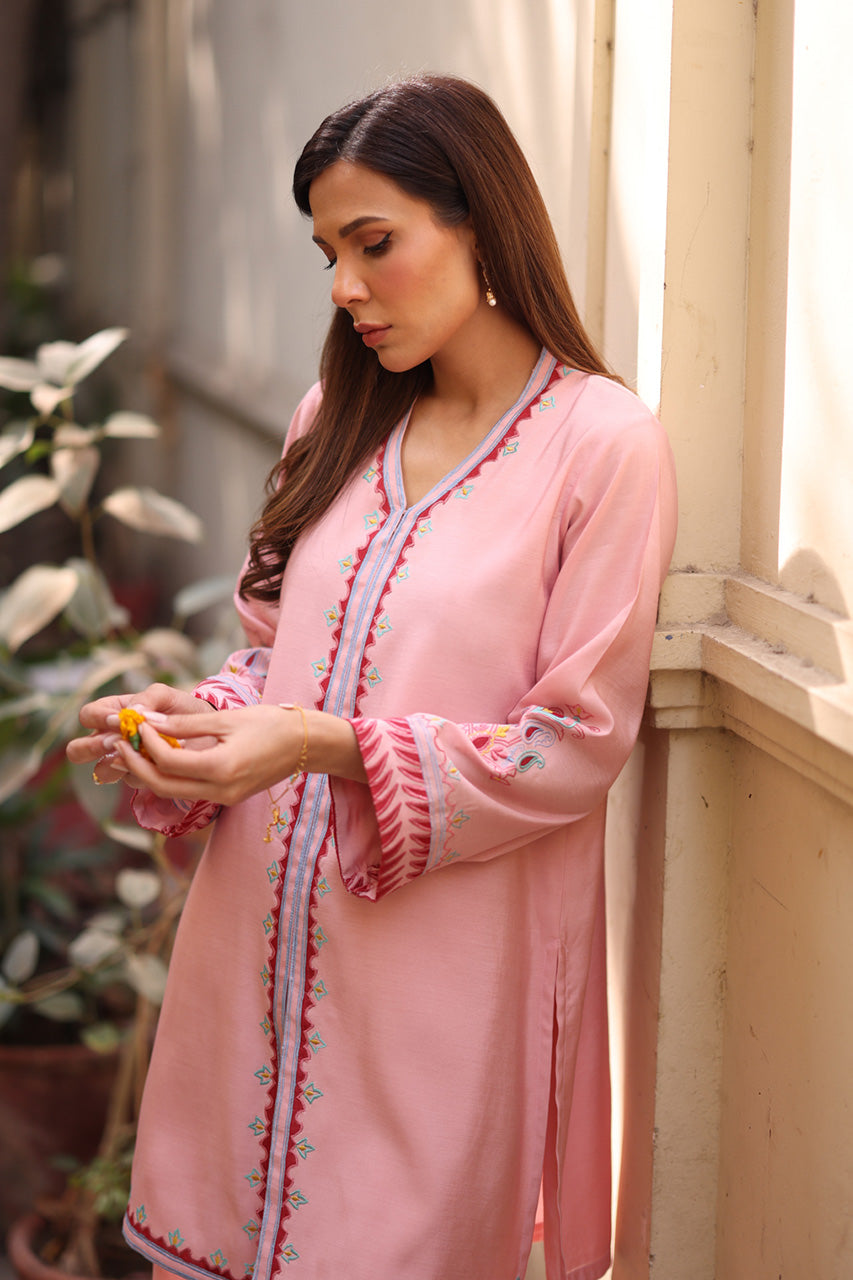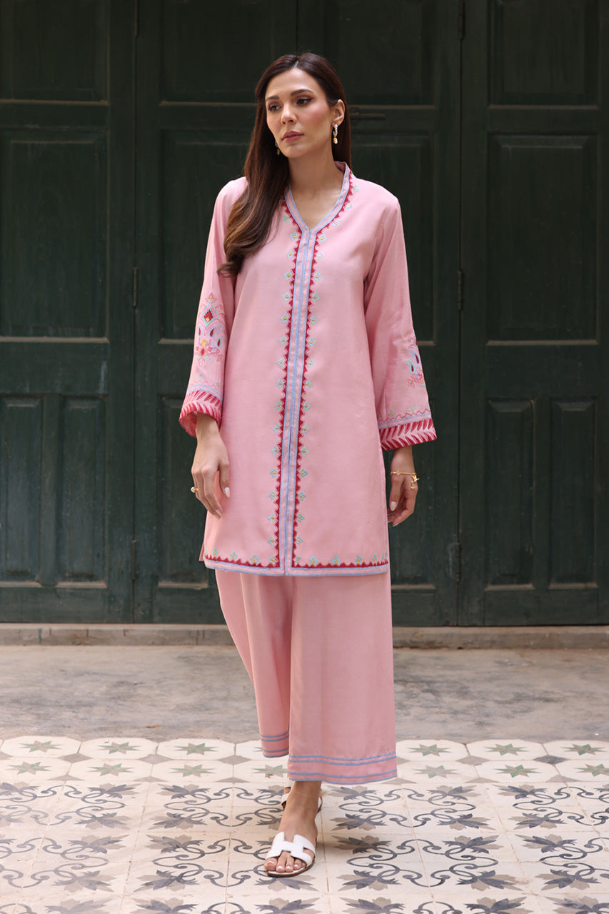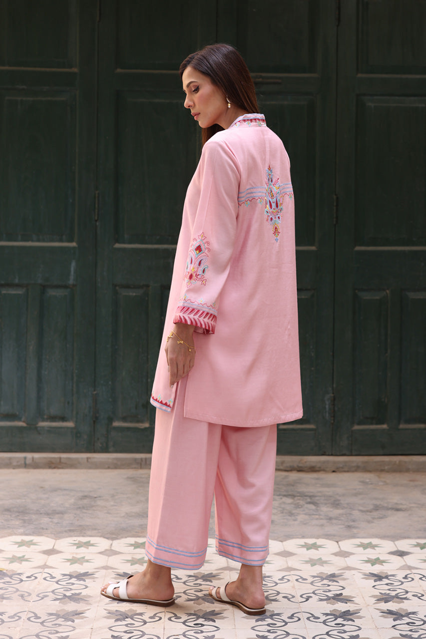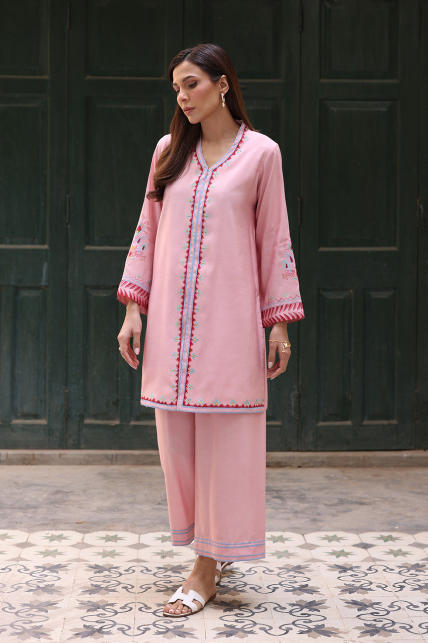 This gorgeous rose-toned solid khadi silk silhouette is perfectly speaking of divine textures and modern minimalism. The front-open style of the shirt and hand-embroidered geometric patterns are gracing this look with ethereal charm. Paired with coordinating khadi silk pants, this outfit is perfect for any occasion.