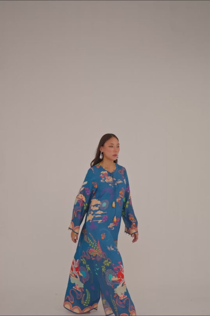 A graceful blue digital silk long kaftan, beautifully adorned with an artistic mix of unique design elements that bring a contemporary charm to the classic silhouette. The flowing cut offers effortless elegance, while the neckline is highlighted with a delicate tassel detail, adding a touch of sophistication and playful movement. A perfect balance of modern artistry and timeless style.