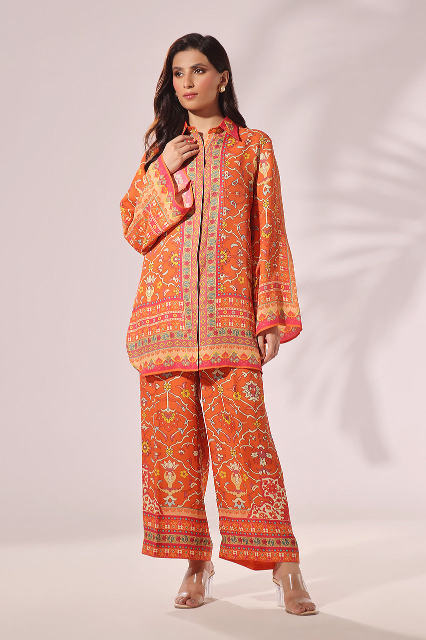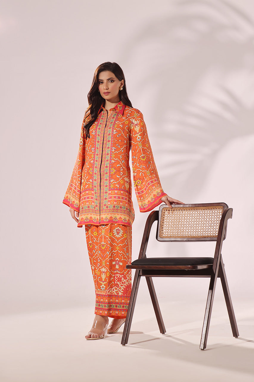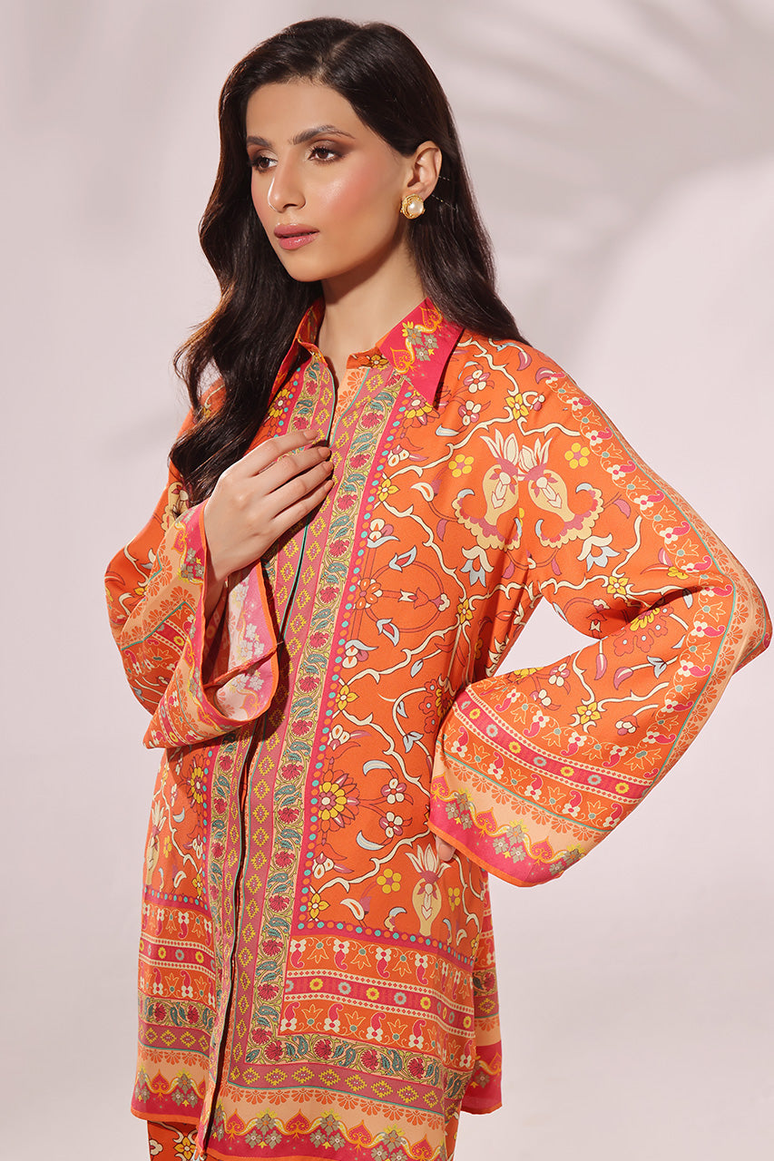 Explore our stylish orange crepe silk front-open shirt, blending sophistication with modern design. It showcases unique digitally printed patterns in vibrant orange and...
