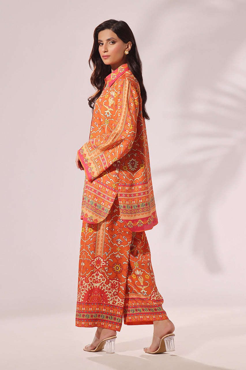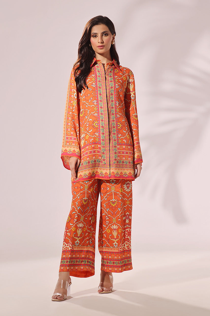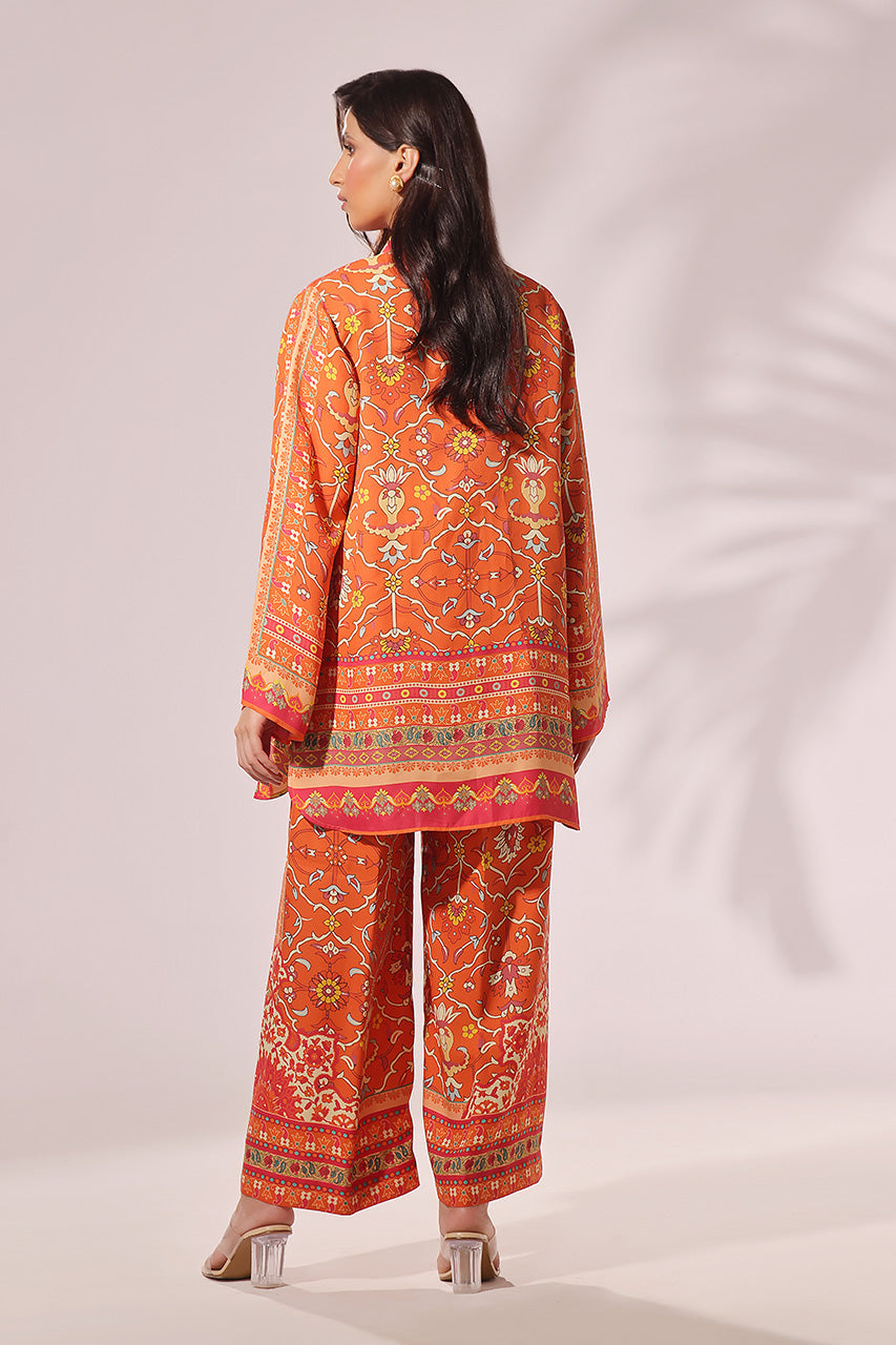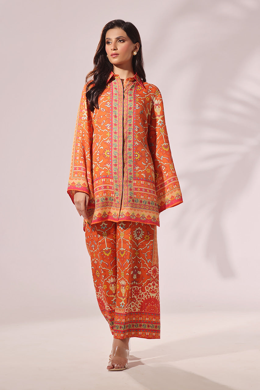 Explore our stylish orange crepe silk front-open shirt, blending sophistication with modern design. It showcases unique digitally printed patterns in vibrant orange and...