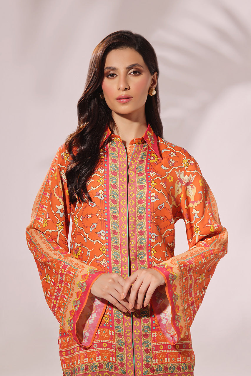 Explore our stylish orange crepe silk front-open shirt, blending sophistication with modern design. It showcases unique digitally printed patterns in vibrant orange and delicate yellow florals, exuding warmth and charm. Paired with a matching printed crepe silk izhar featuring intricate motifs, this ensemble embodies grace and refinement, making it perfect for special occasions. Thoughtfully crafted for impact, it offers a unique style statement to elevate your wardrobe.