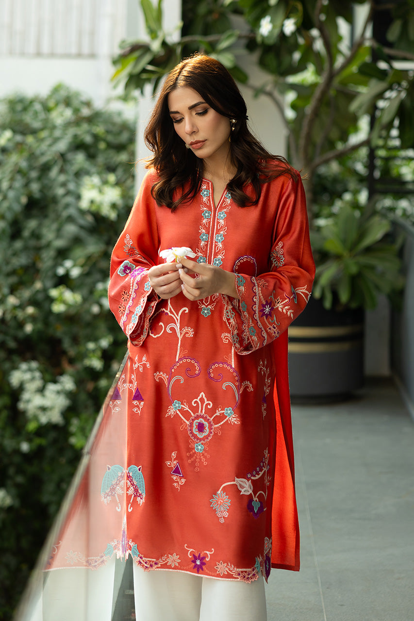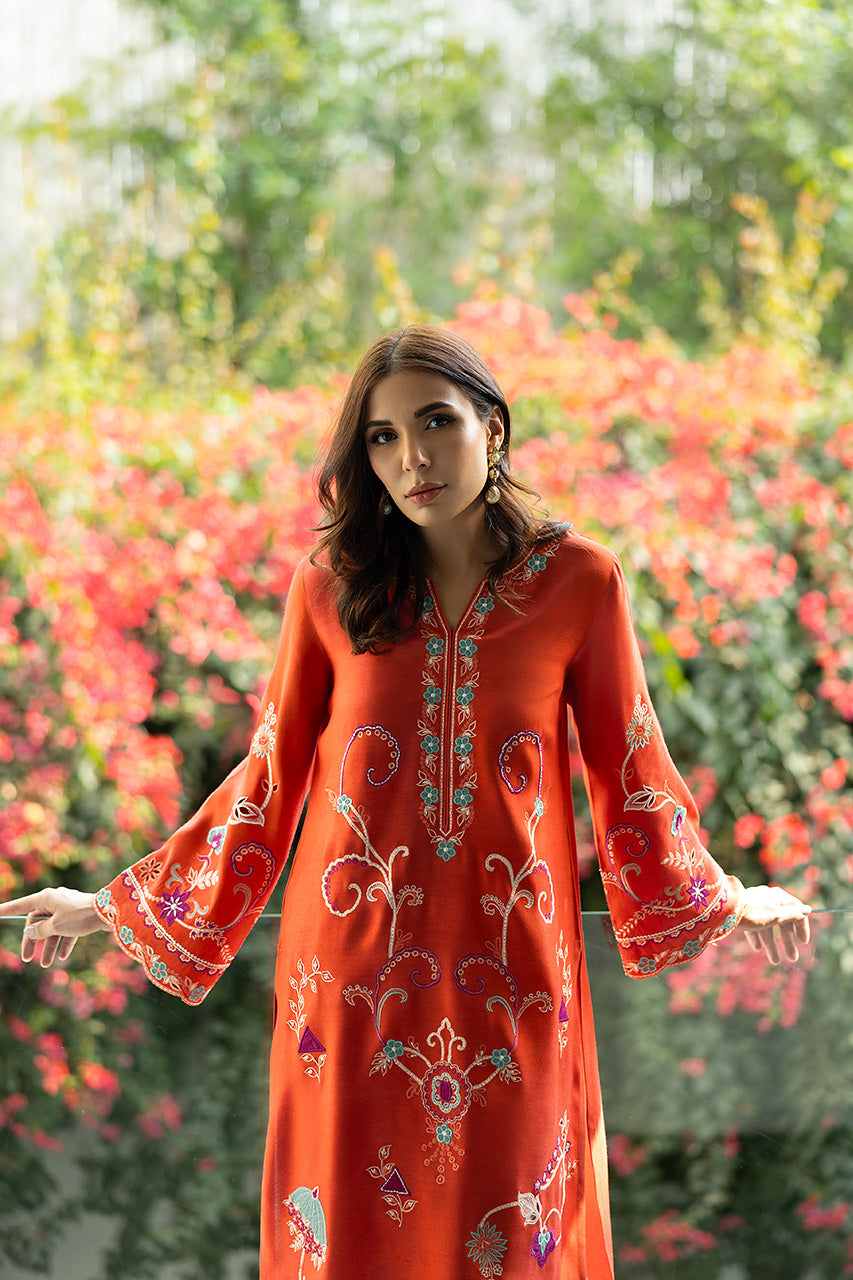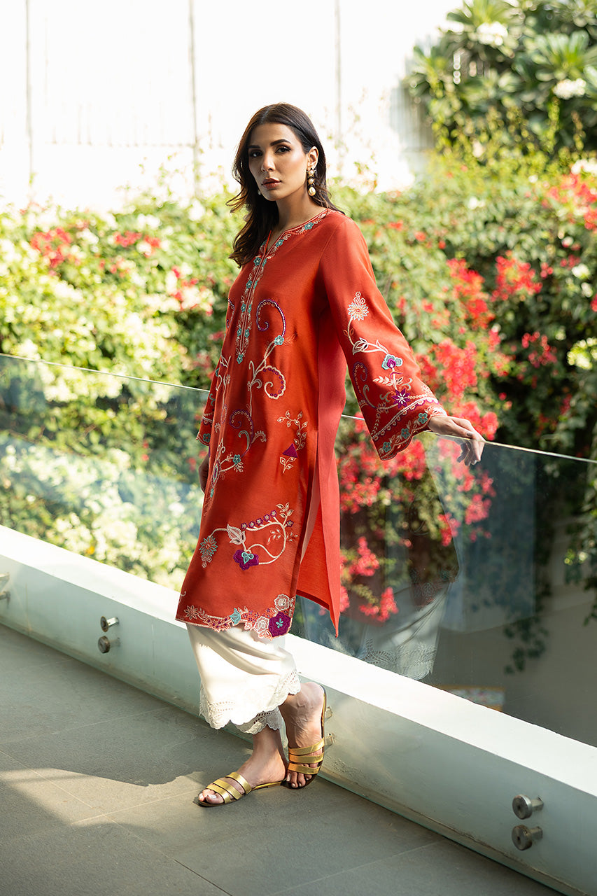 Draped in the warm embrace of rust tones and blooming embroideries, this knee-length khadi silk shirt is a perfect option for a sophisticated yet effortless look. Graced with floral threadwork, flared sleeves, delicately done cutwork details, and scalloped finishing, the shirt possesses a silhouette of allure. Paired with white khadi cotton pants finished with complementing floral cutwork and scalloped finishing, this outfit is an ideal choice for daytime festivities, intimate gatherings, or any occasion where elegance comes first!
